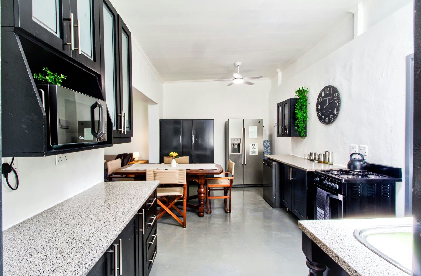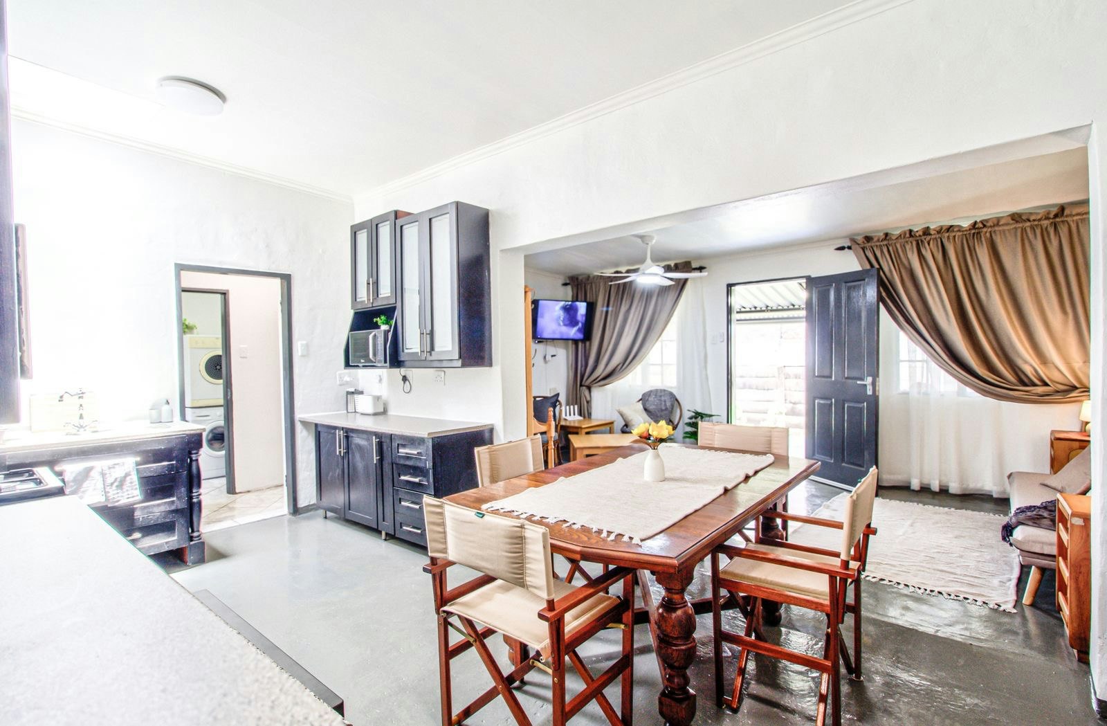 Die leefarea het 'n oopplan-ontwerp met 'n volledig toegeruste kombuis, insluitend 'n stoof, oond, mikrogolfoond, yskas-vrieskas, eetgerei en breekware. Vir ekstra gerief is 'n skottelgoedwasser ook beskikbaar. 'n Eetkamertafel met 4 sitplekke langs die kombuis is perfek vir maaltye. Die sitarea is gemeubileer met gemaklike sitplek en 'n slim-TV, asook gratis WiFi.