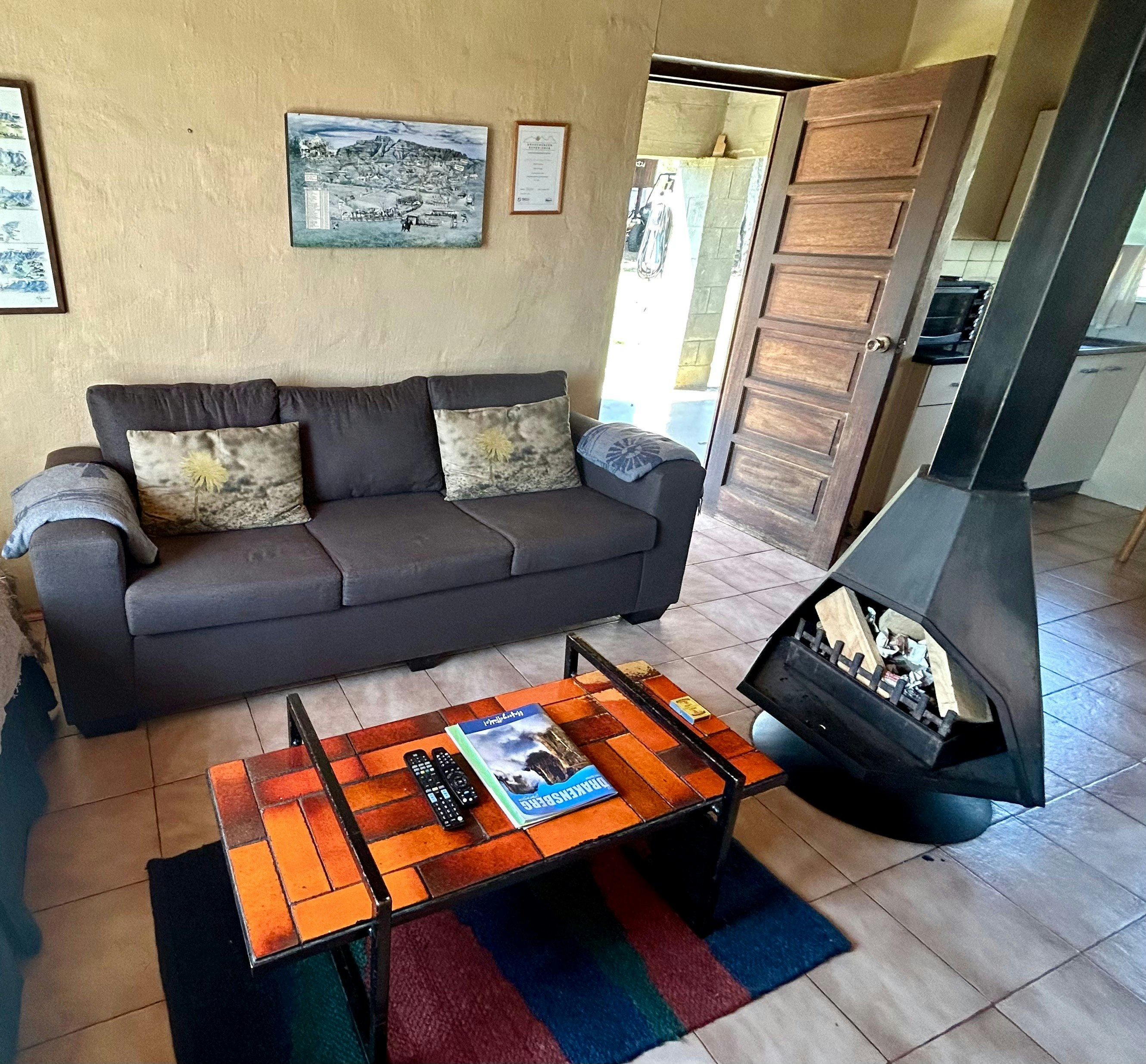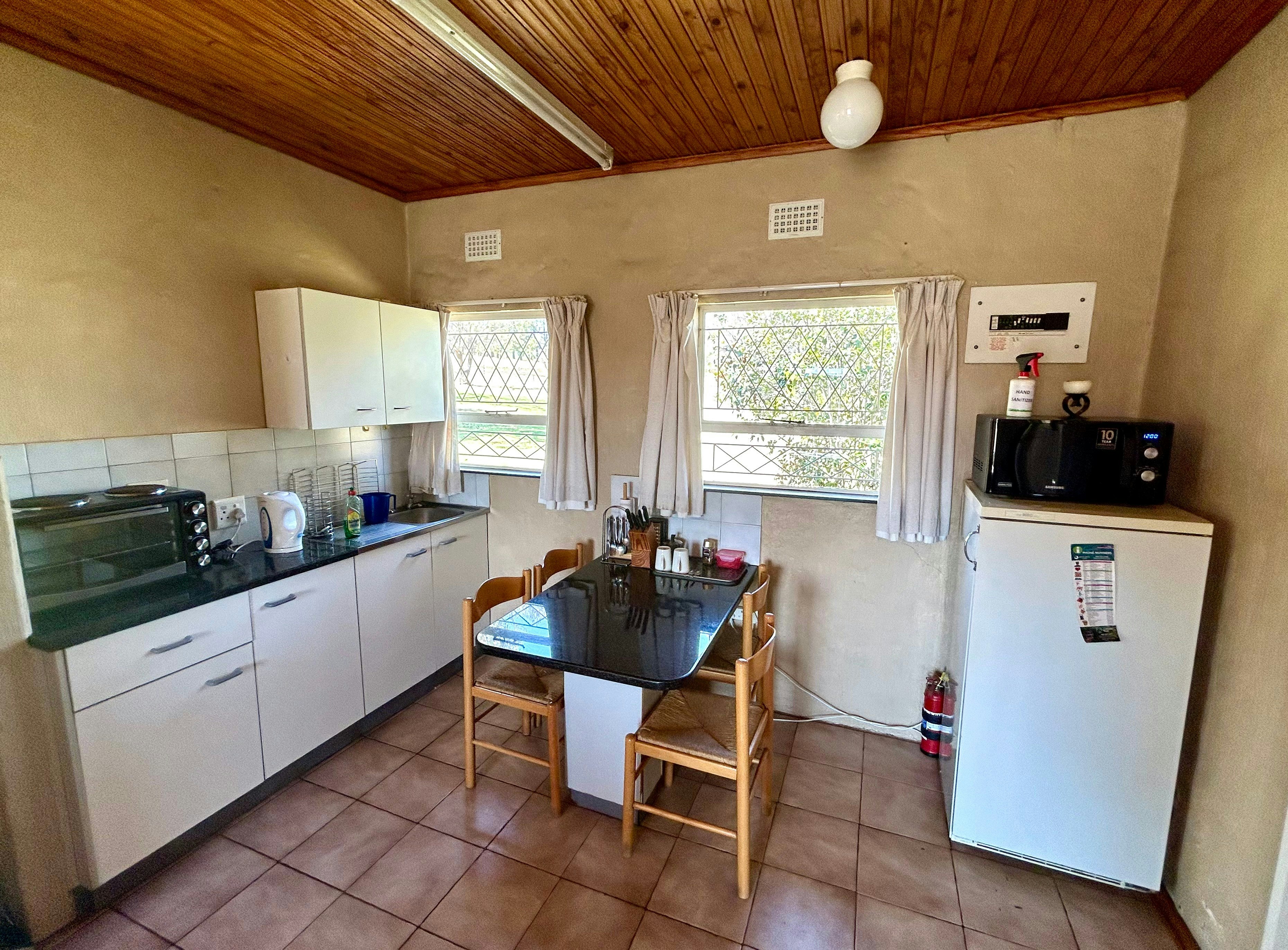 The lounge area has a TV with all DSTV channels and a central Jet master fireplace for the cold winter nights. The bathroom is fitted with a shower, wash hand basin and, toilet. The kitchenette has a 2-plate stove, kettle, toaster, fridge, electric frying pan, and microwave. There is also a Weber braai and secure undercover parking and a swimming pool.