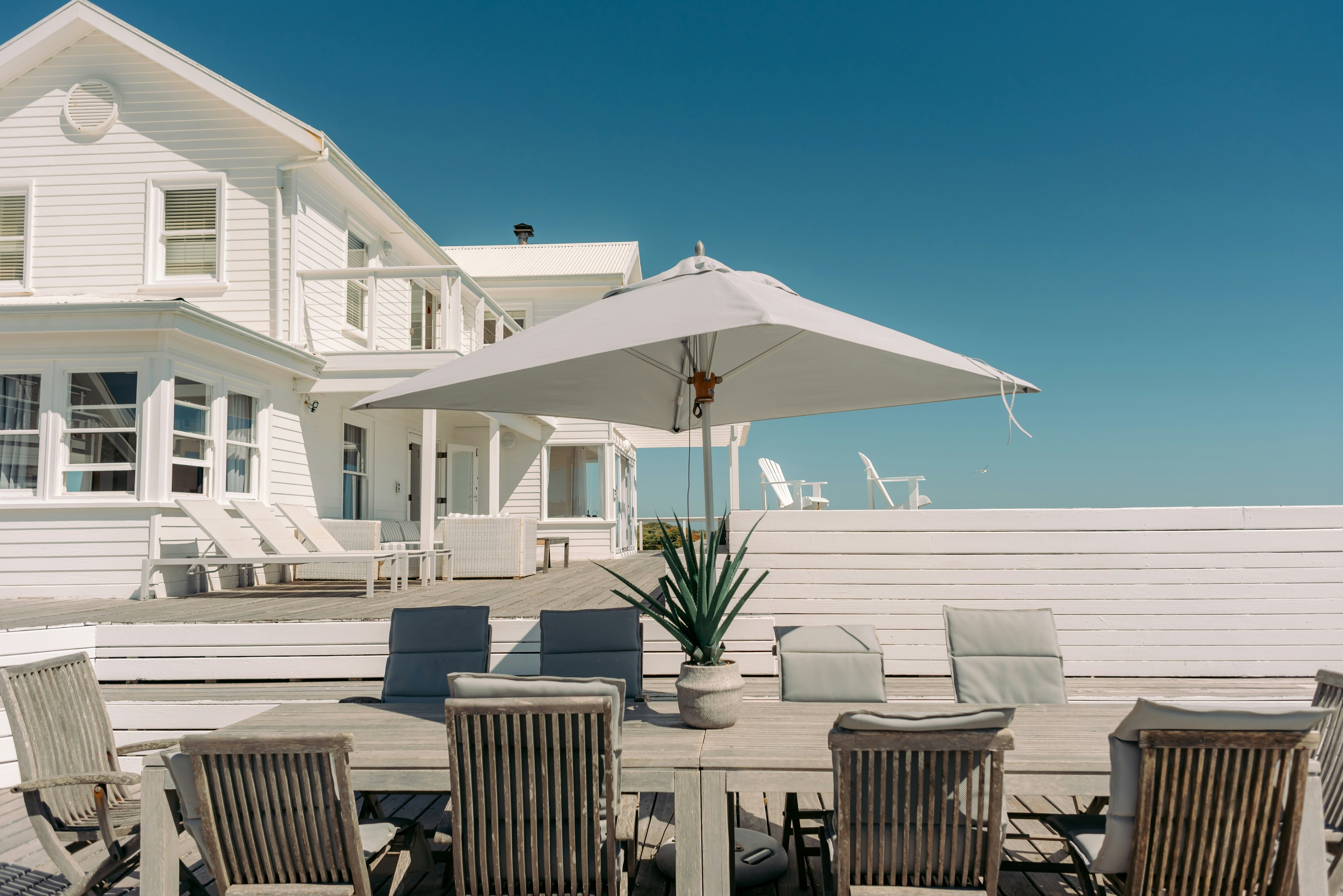 The large lounge, dining room, and kitchen area are light and airy, and open plan. These lead out onto a sun-drenched wooden deck with a large rim-flow pool, lending to both indoor and outdoor entertaining. The kitchen is fully equipped for self-catering with a fridge, microwave, oven and stove, and there is a walk-in pantry.