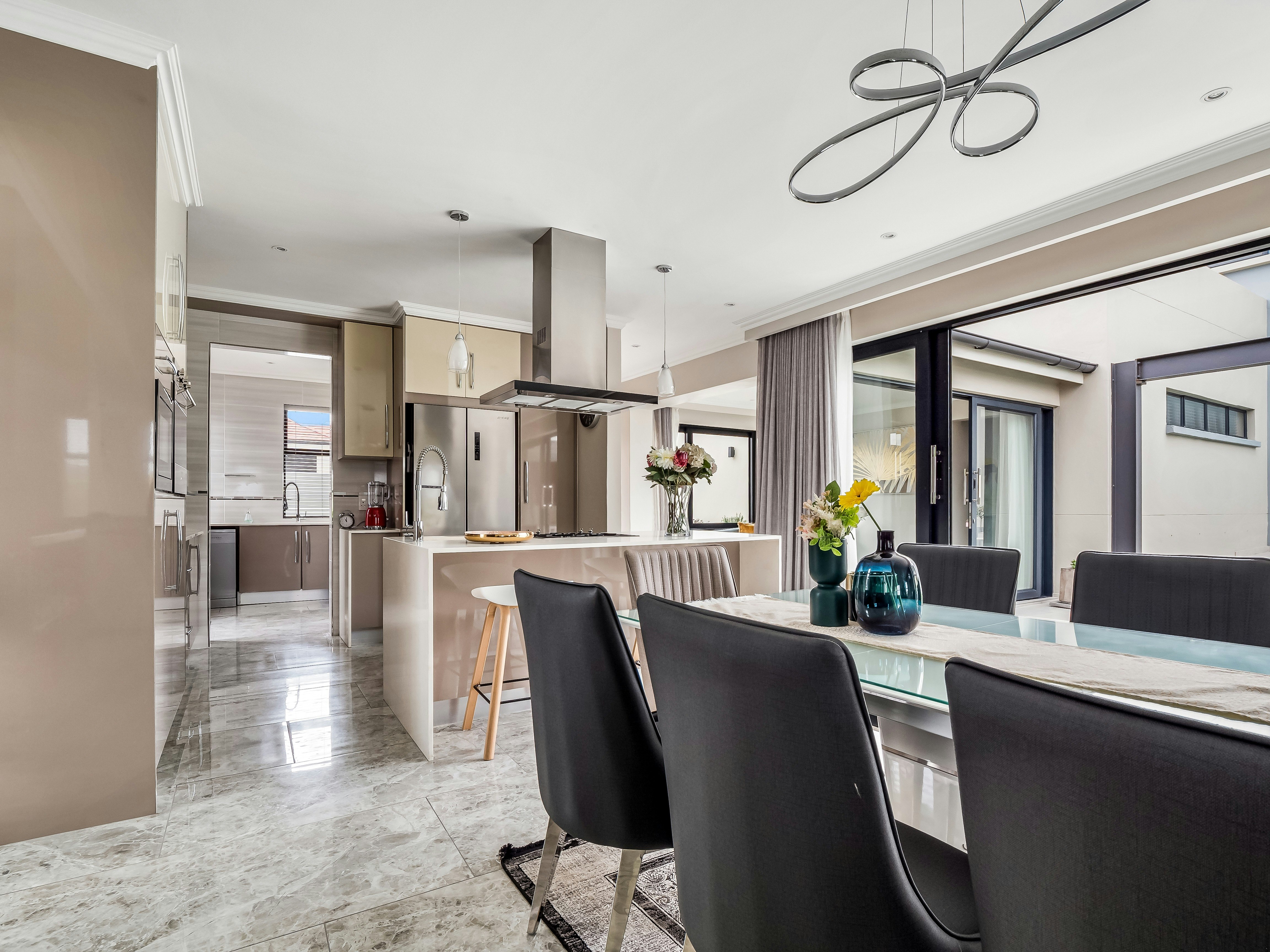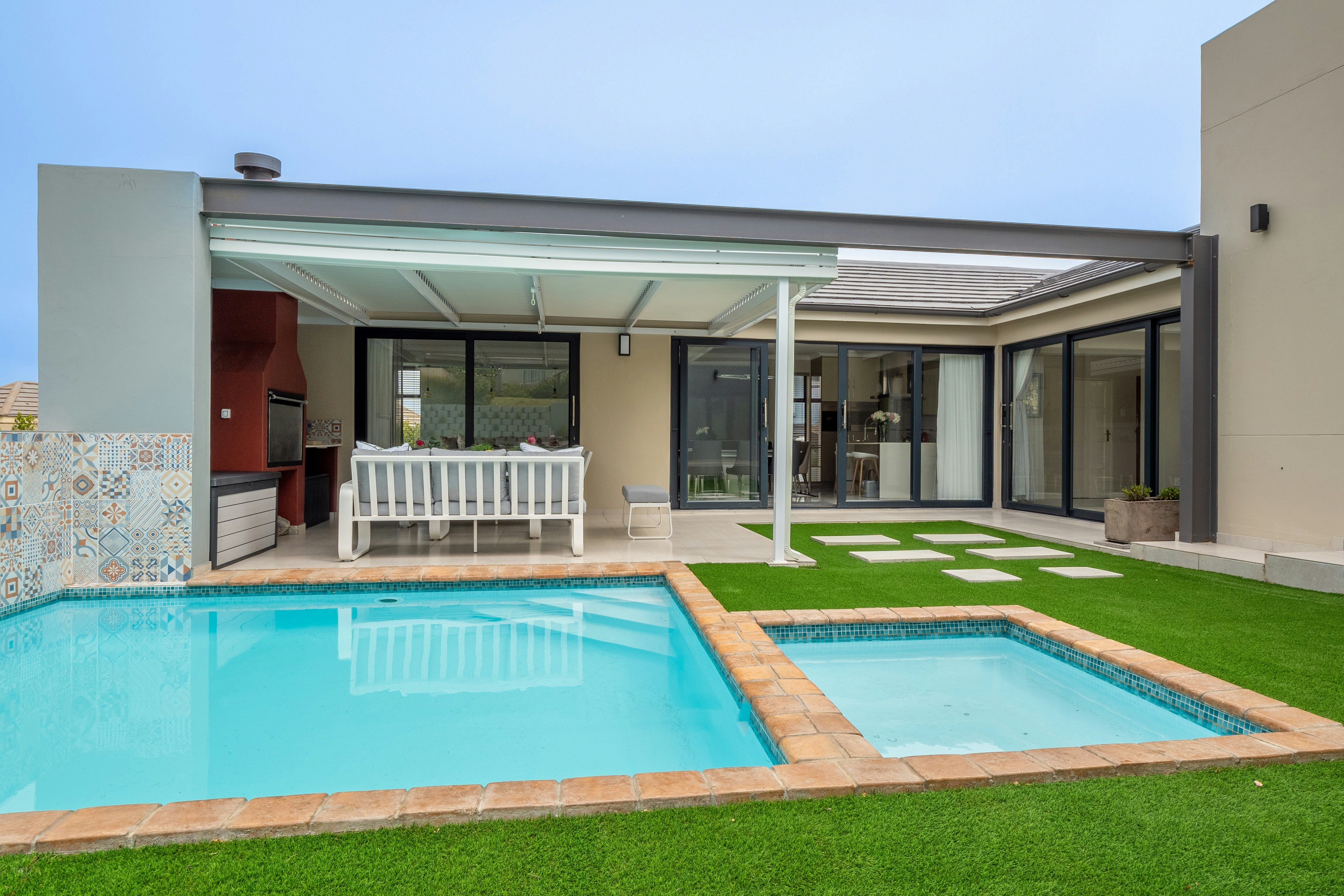 The living area opens onto a covered patio with outdoor seating and a built-in braai. This area flows onto a beautifully landscaped garden with a swimming pool. Guests are afforded secure garage parking as well as covered driveway parking.