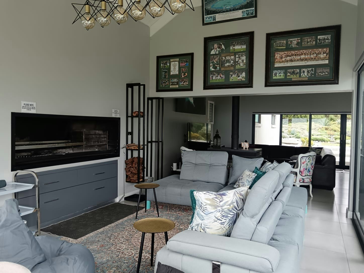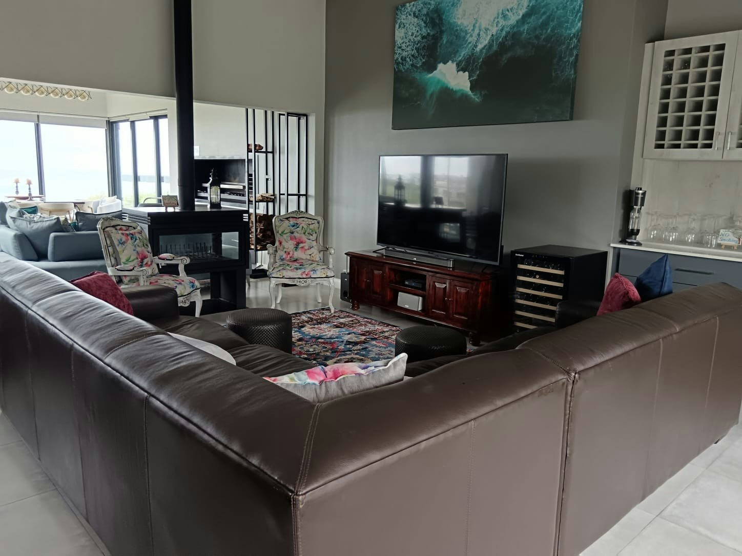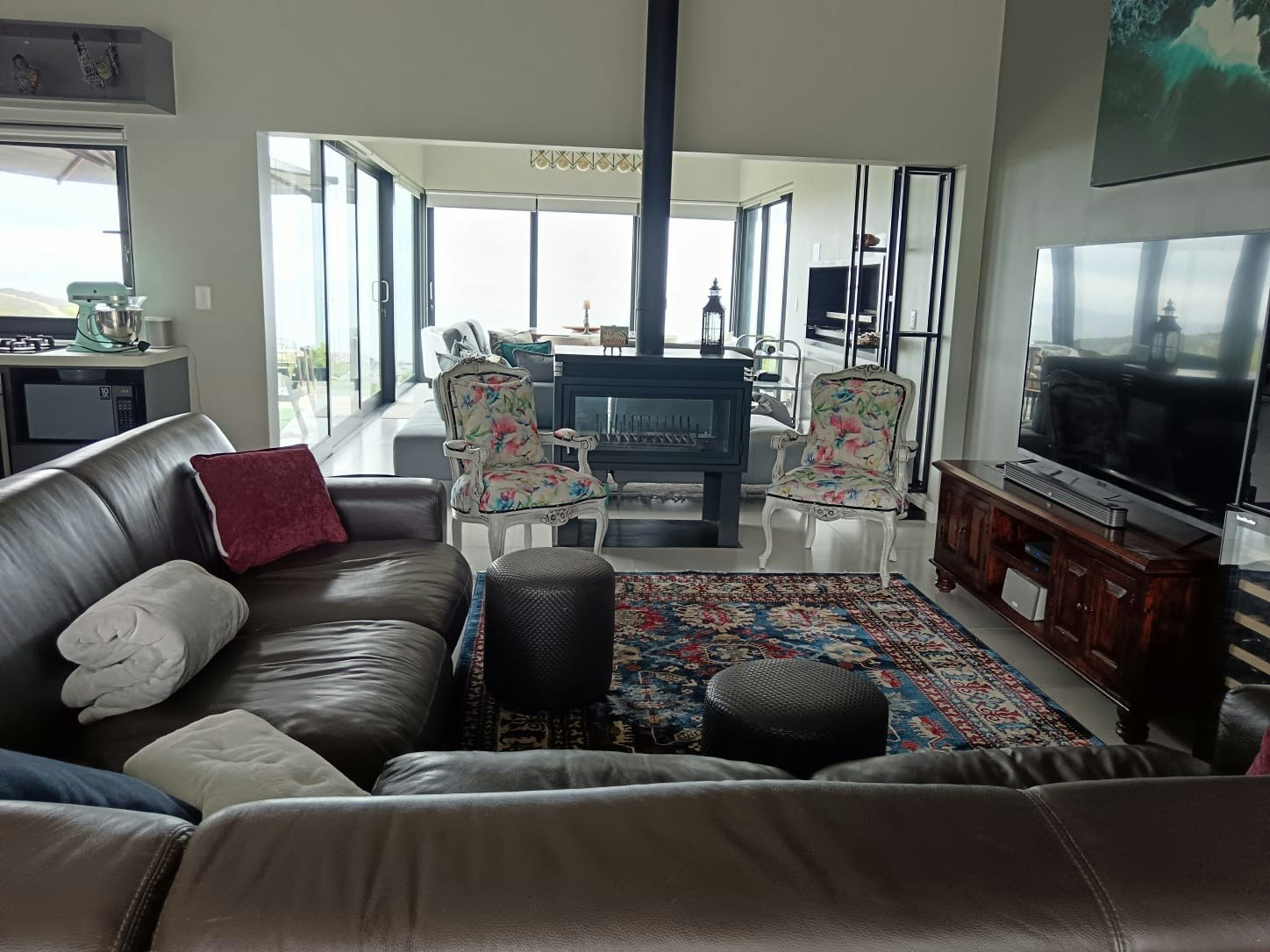 The open-plan living area features tall ceilings, and a kitchen fully equipped with a gas stove, electric oven, microwave, cutlery, and crockery. A fridge-freezer, dishwasher, washing machine, and tumble dryer are available in the separate scullery. Leading from the kitchen is a cosy TV lounge with an indoor fireplace for those cold winter evenings and comfortable couches. For guests’ entertainment, a flat-screen TV with DStv, streaming facilities and access to free, uncapped Wi-Fi is available. The TV lounge leads to another living room with a built-in braai and comfortable couches where guests can relax while admiring the beautiful views.