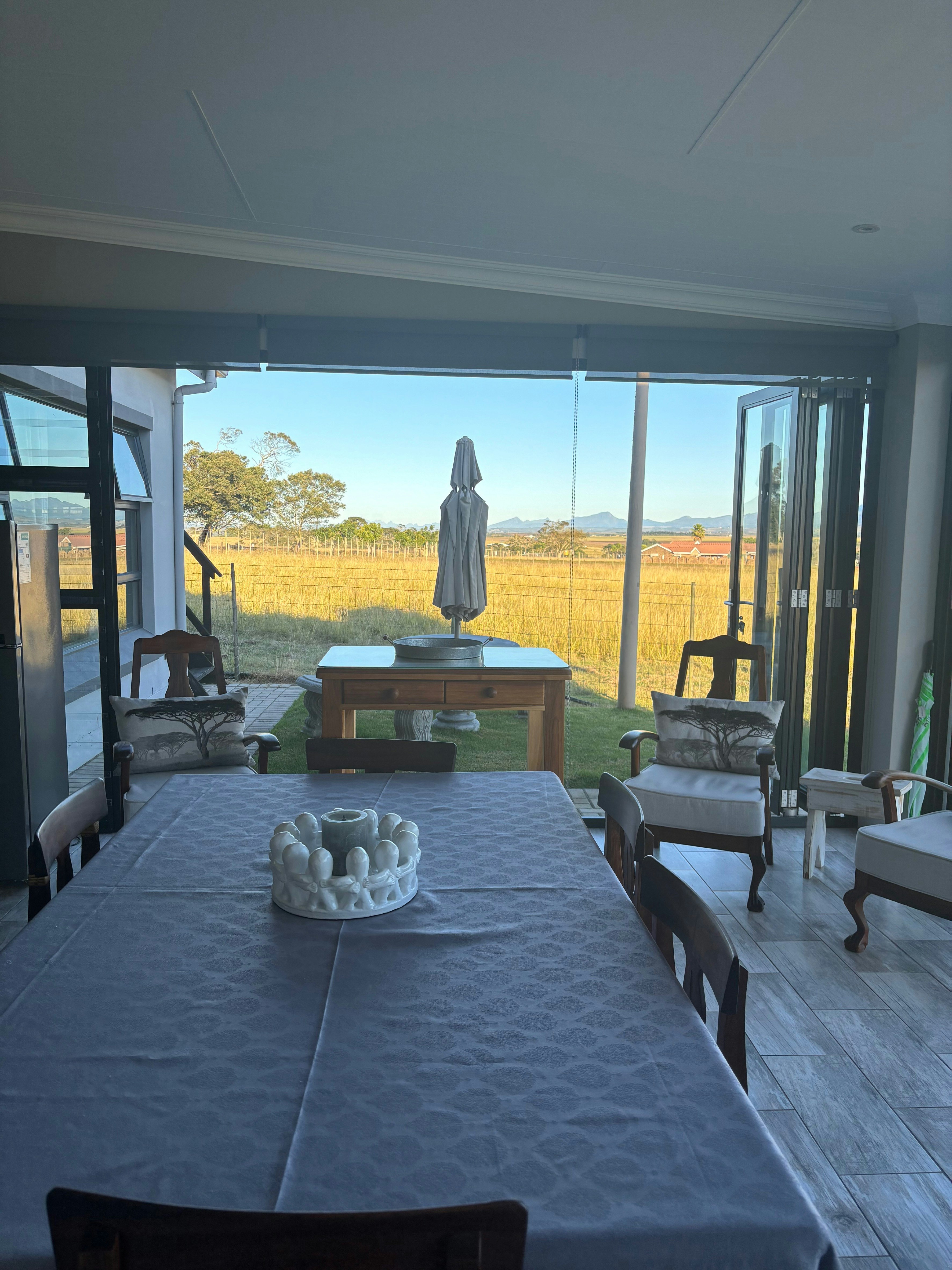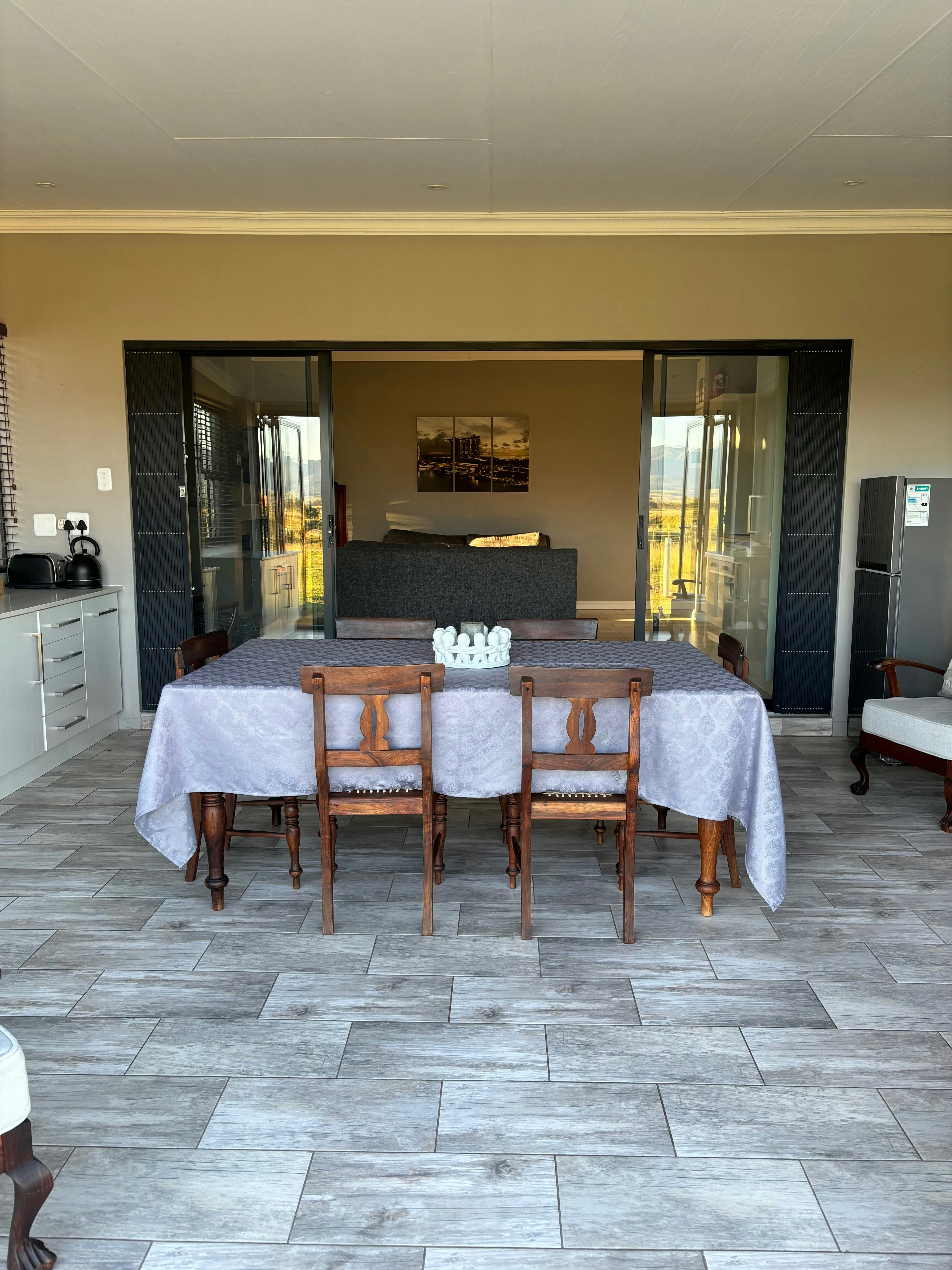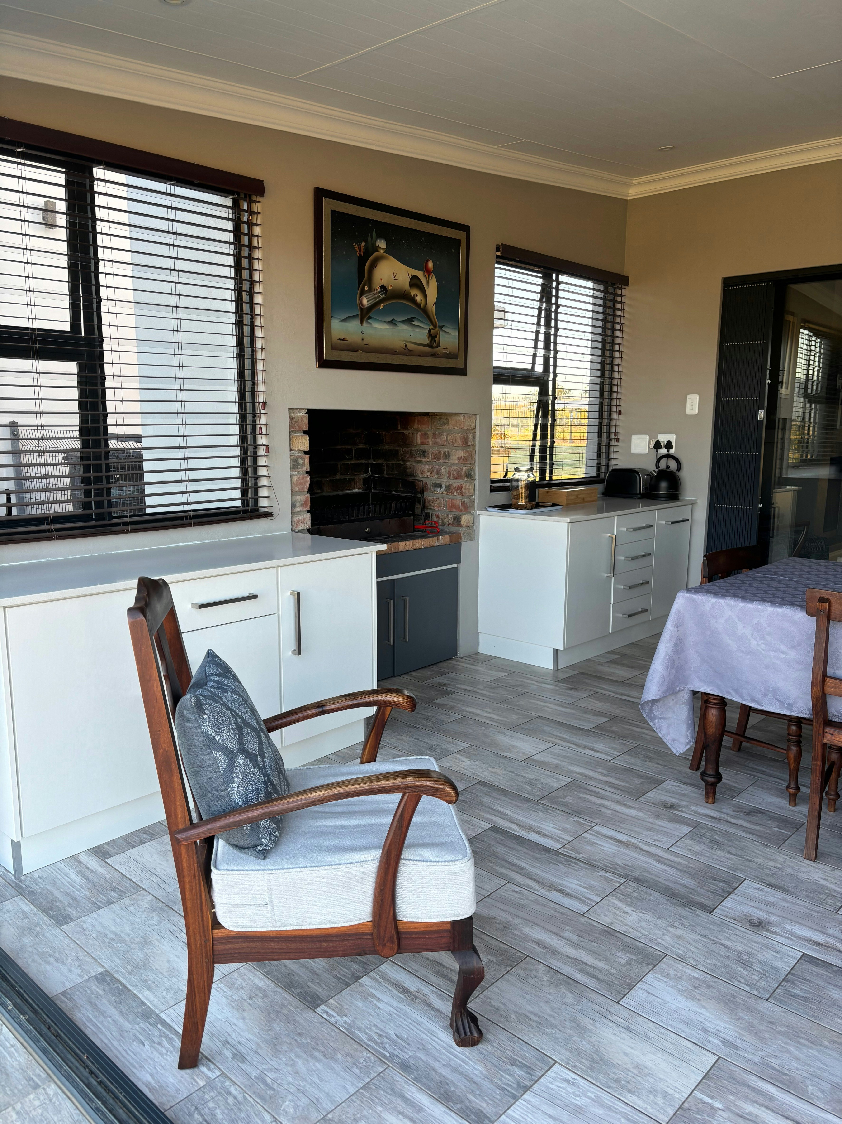 Through the sliding doors, there is a dining space that can seat 6 guests and includes a built-in indoor braai as well as a coffee station. This area has stacking doors that completely open up onto a large lawn where guests can relax with a morning coffee or a sundowner.