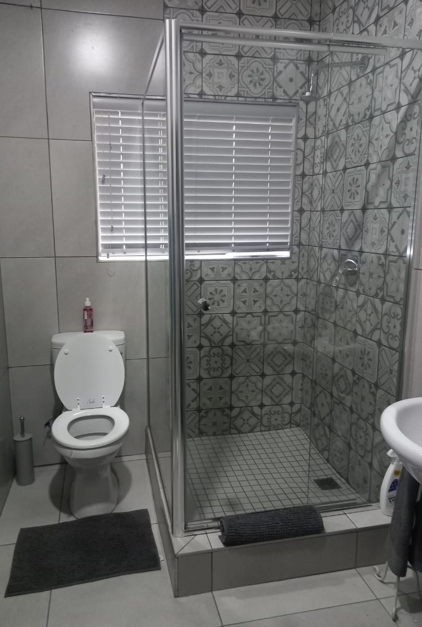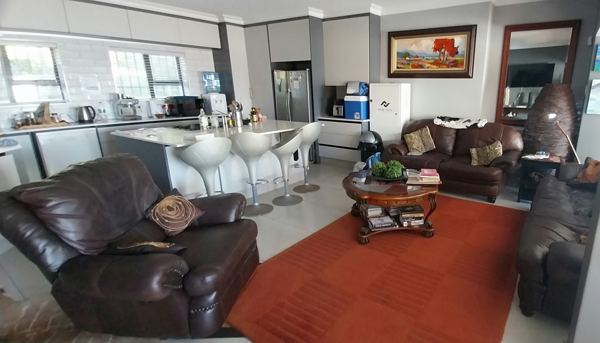 The open-plan living space features a lounge furnished with comfortable couches and a TV with DStv. The kitchen is fully equipped with a fridge-freezer, stove, oven, and microwave. There is also a washing machine for guests' convenience.