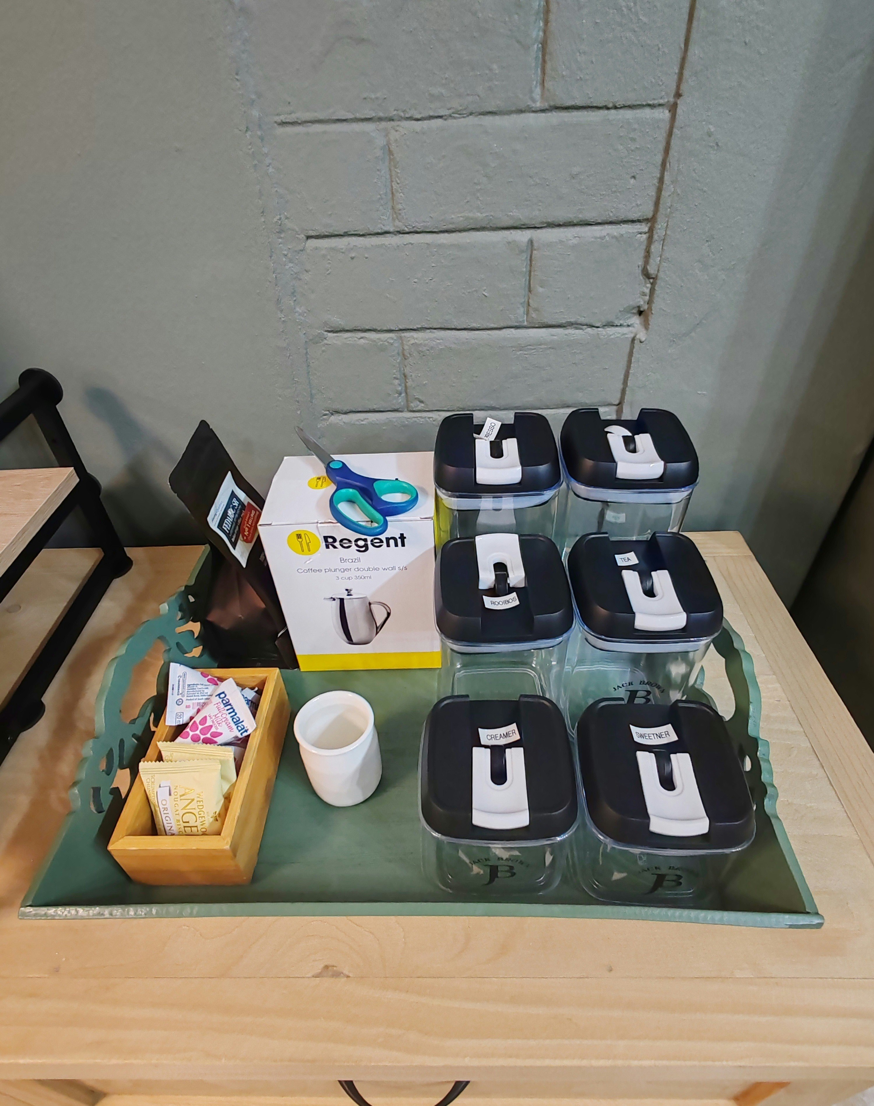Die kombuisie is toegerus met 'n yskas-vrieskas, tweeplaat-induksiestoof, mikrogolfoond, eetgerei, breekware, tee- en koffiemaakgeriewe en 'n eetkamertafel vir twee. Die leefarea is gemeubileer met 'n lessenaar, 'n gemaklike bank en 'n TV. WiFi-toegang is beskikbaar. 'n Voorafbetaalde lugversorgingseenheid word voorsien met volledige instruksies oor hoe om elektrisiteit aan te koop. Daar is ook 'n kragopwekker op die perseel.