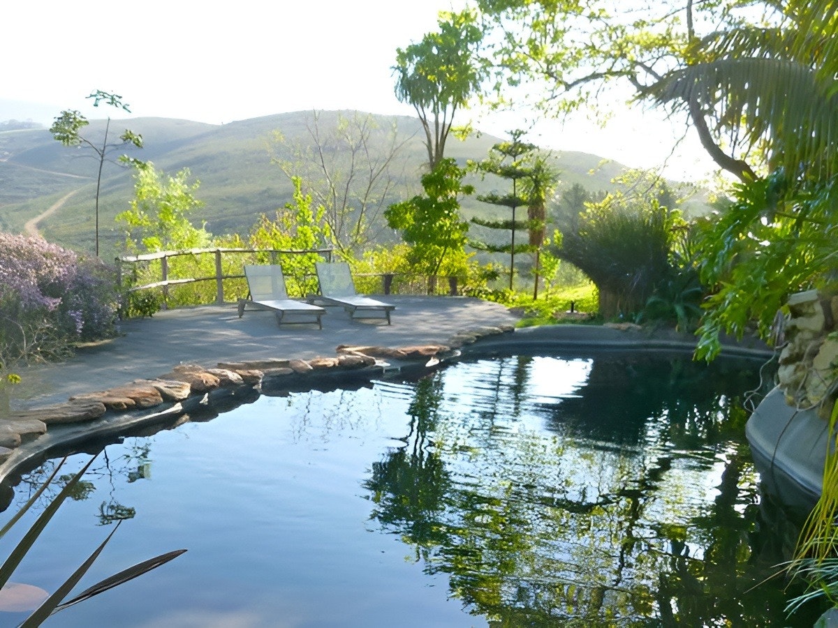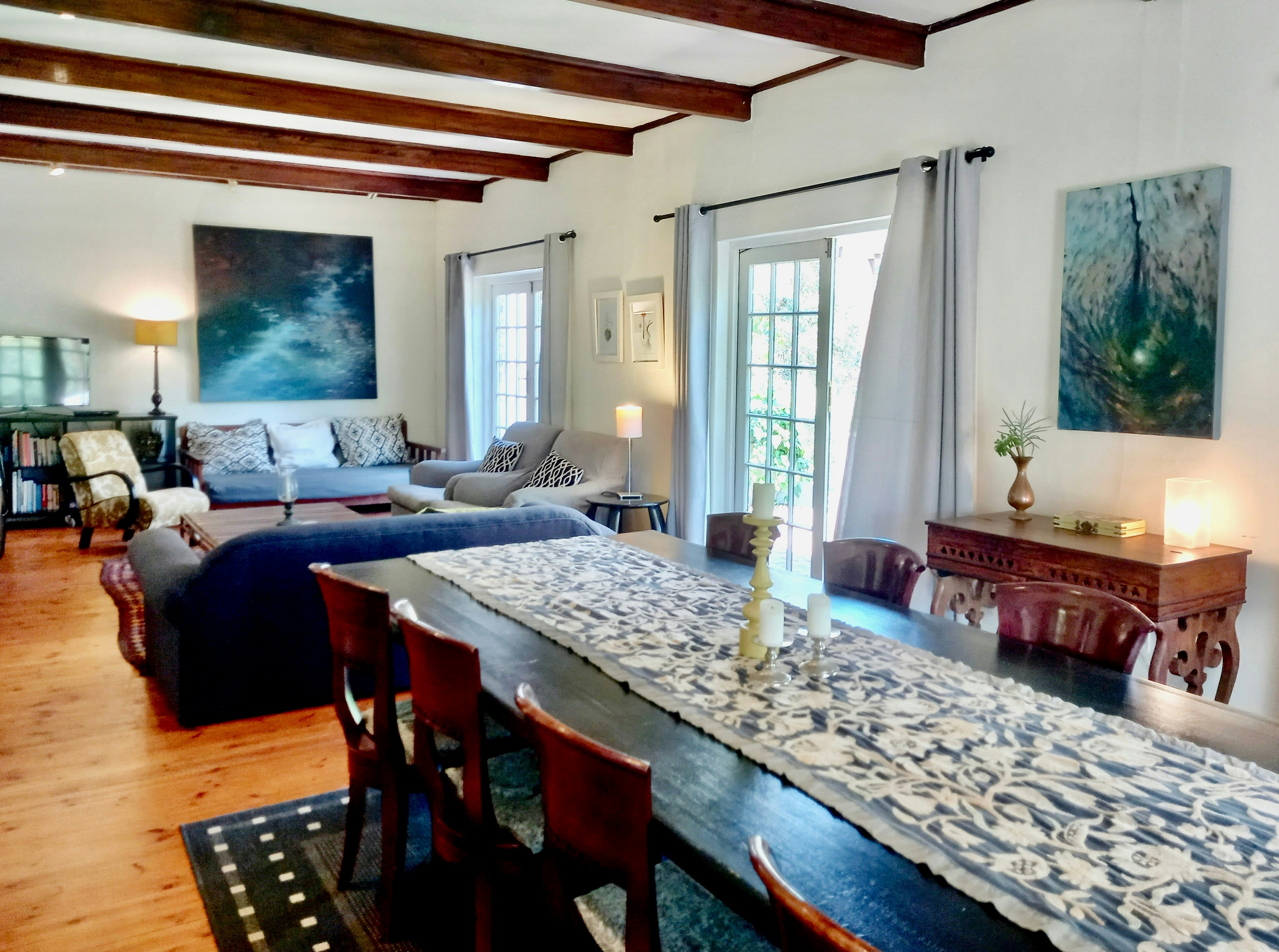 Die leefarea maak oop na 'n lieflike patio-area met buitemeubels, 'n eetkamertafel, 'n klein boma en braaigeriewe. Die patio kyk uit oor die tuin en die berge. Verder het gaste toegang tot 'n swembad, 'n groot dek met 'n houtvuur-warmbad en 'n privaat tuin.