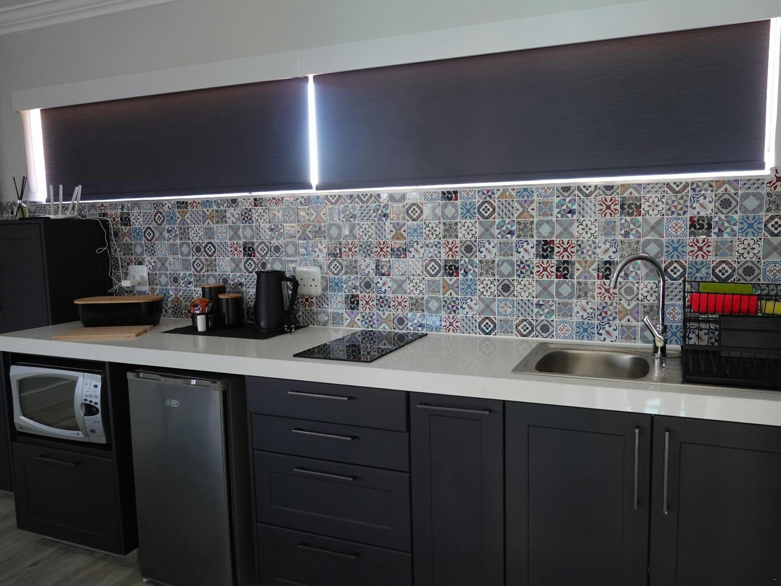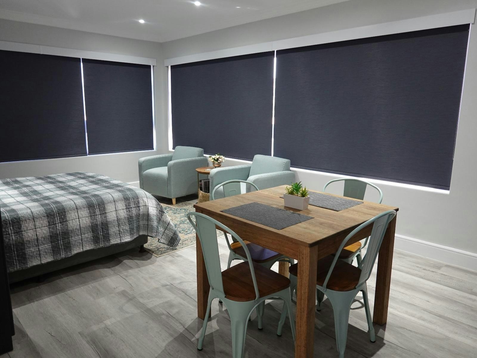 The living area includes comfortable seating, a TV, a dining table, and a kitchenette well equipped with a bar fridge, stove, microwave, and coffee- and tea-making facilities, ensuring a relaxed and convenient self-catering experience.