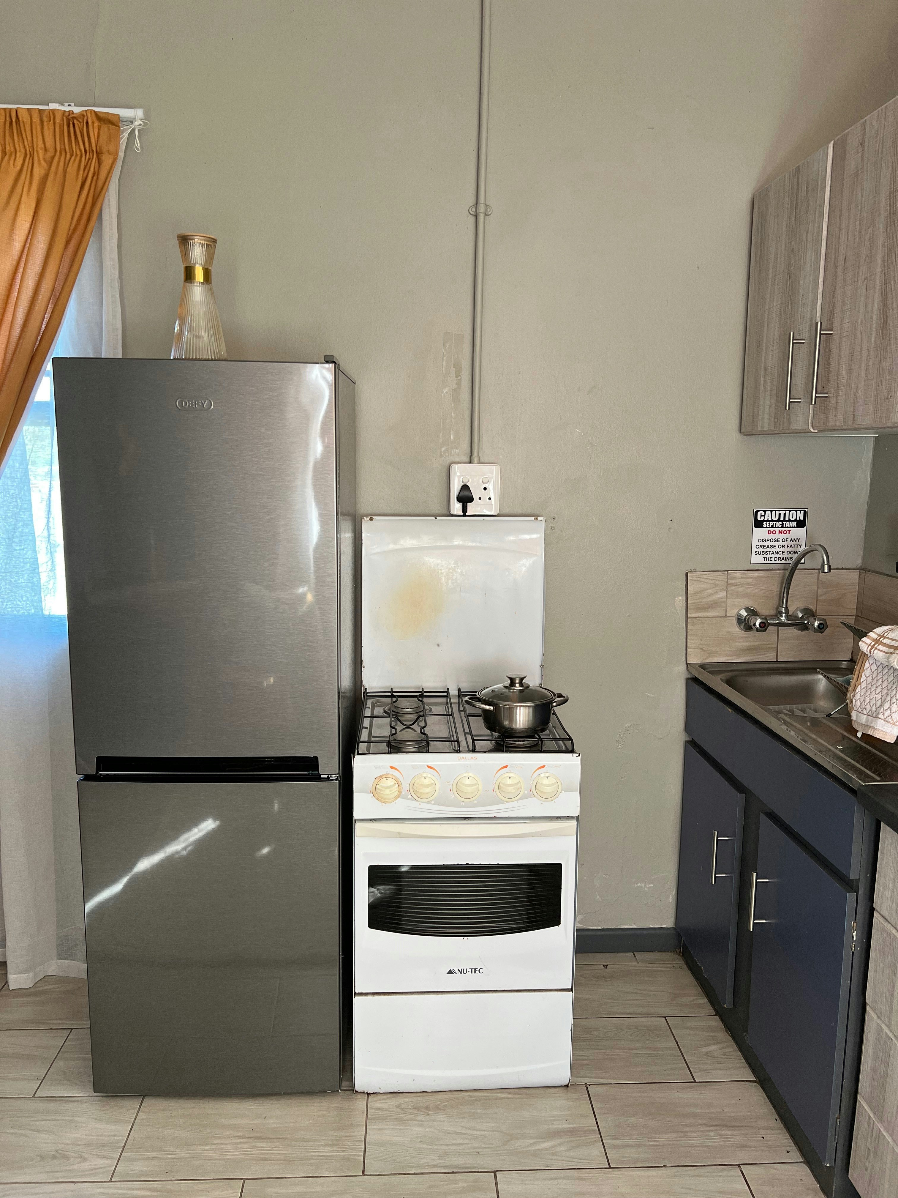 The Protea cottage’s open-plan living space features a dining area and a lounge with a Smart TV and comfortable seating. The kitchen is fully equipped with a fridge-freezer, gas stove, oven, toaster, kettle, and microwave, as well as tea-and-coffee-making facilities. There is also a washing machine for added convenience.