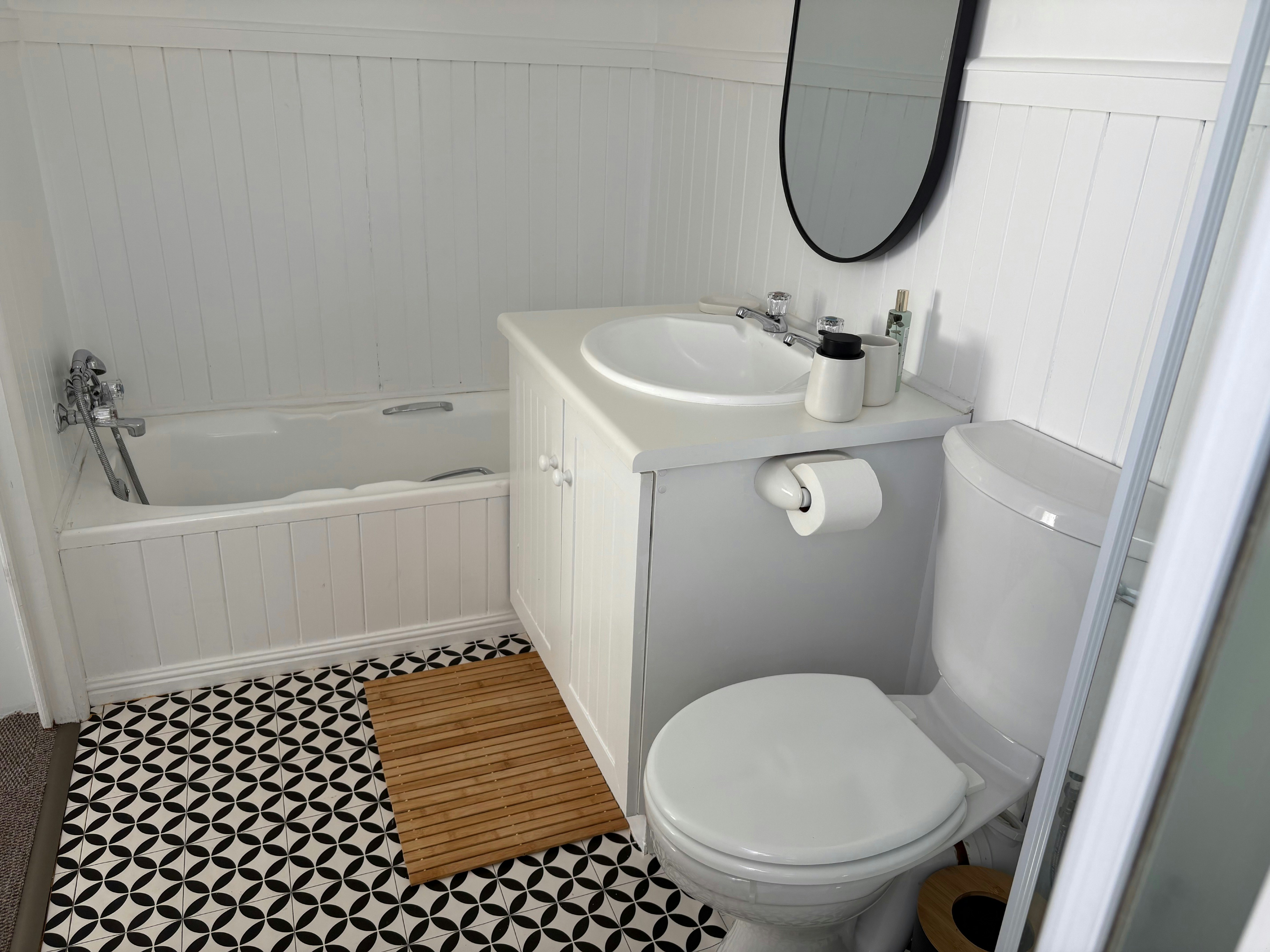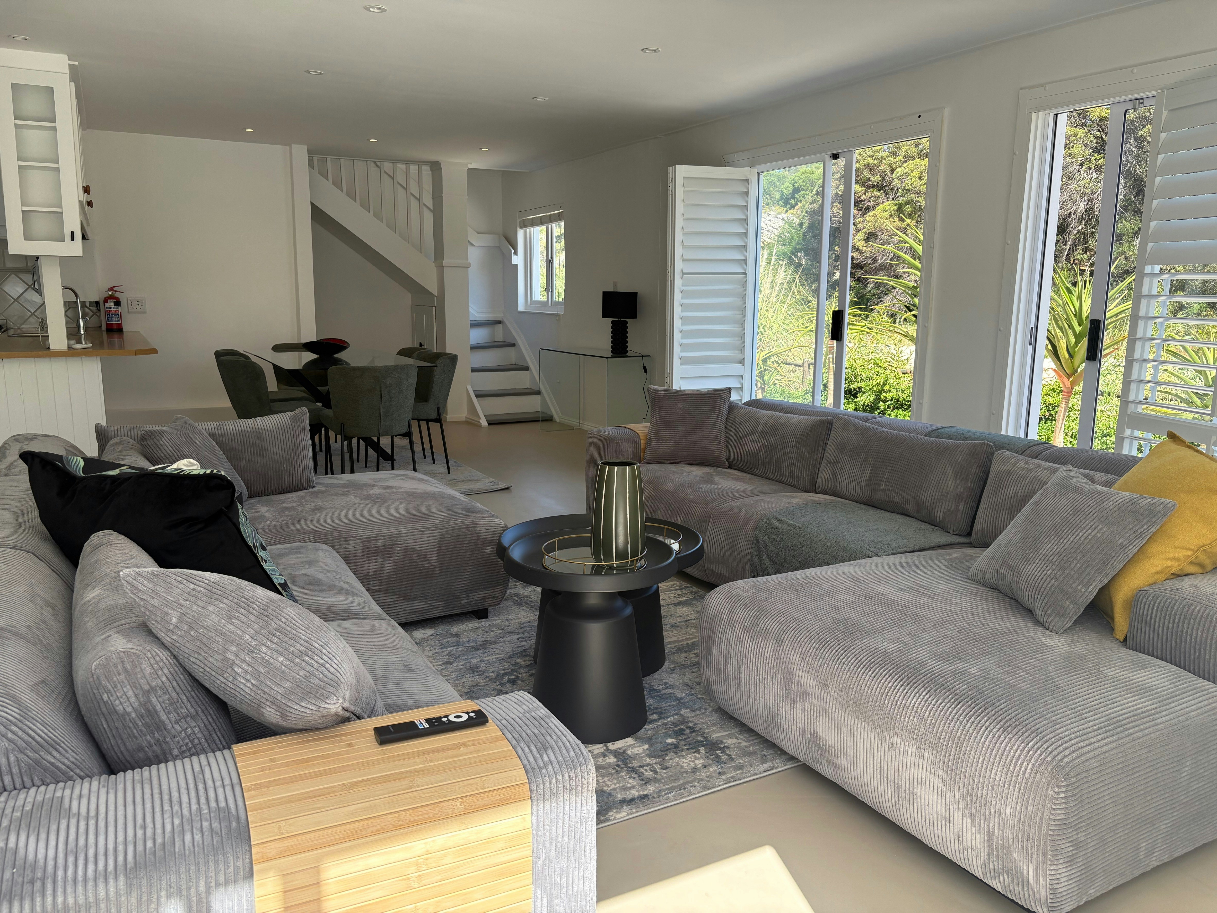 The open-plan living area offers a fully equipped kitchen with a stove, air fryer, dishwasher, cutlery, crockery, utensils, kettle, microwave, fridge-freezer, and breakfast counter that flows to the dining area, furnished with a 6-seater dining table and the lounge that offers comfortable seating, a TV with streaming options, and Wi-Fi for your convenience.