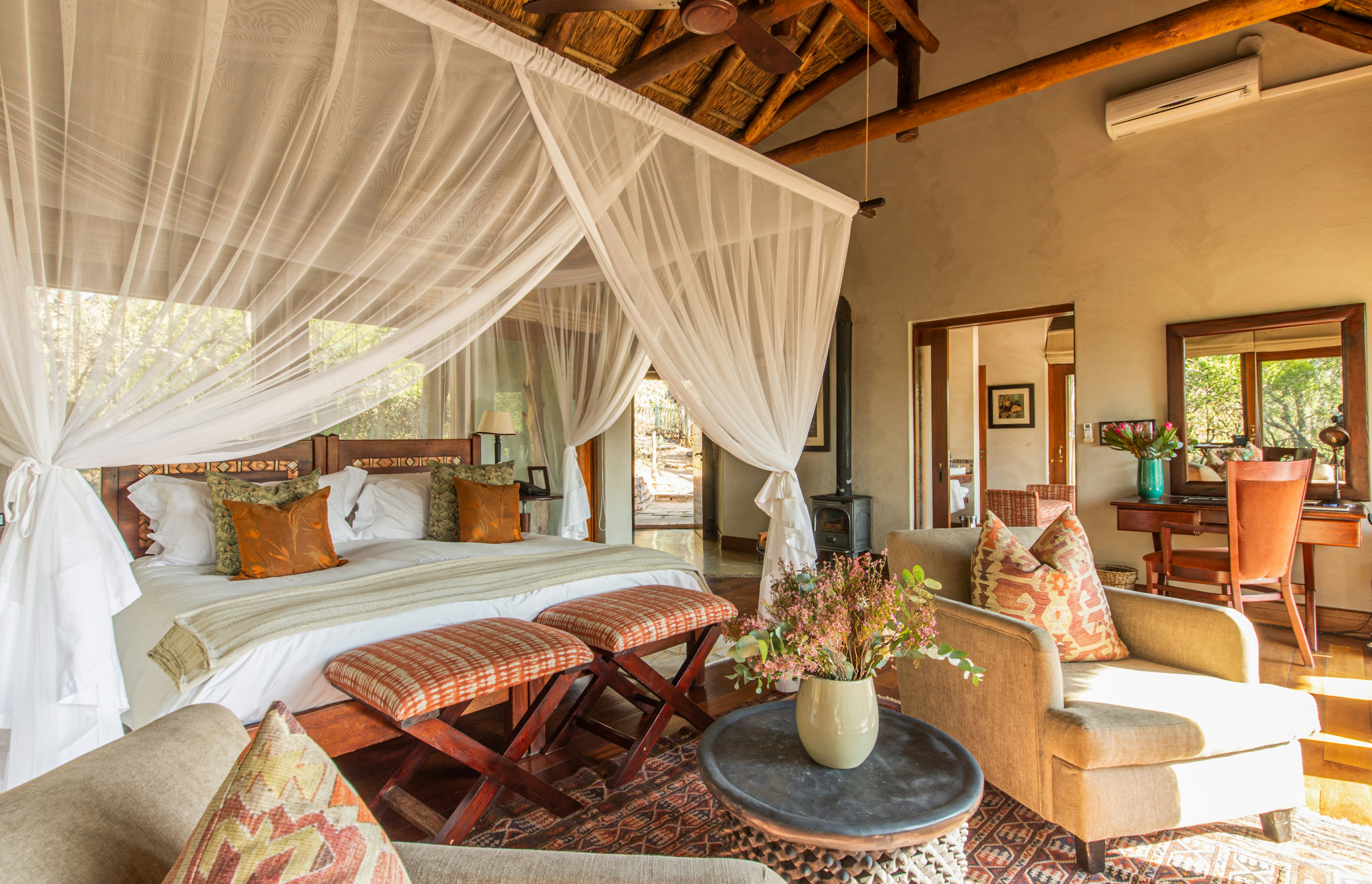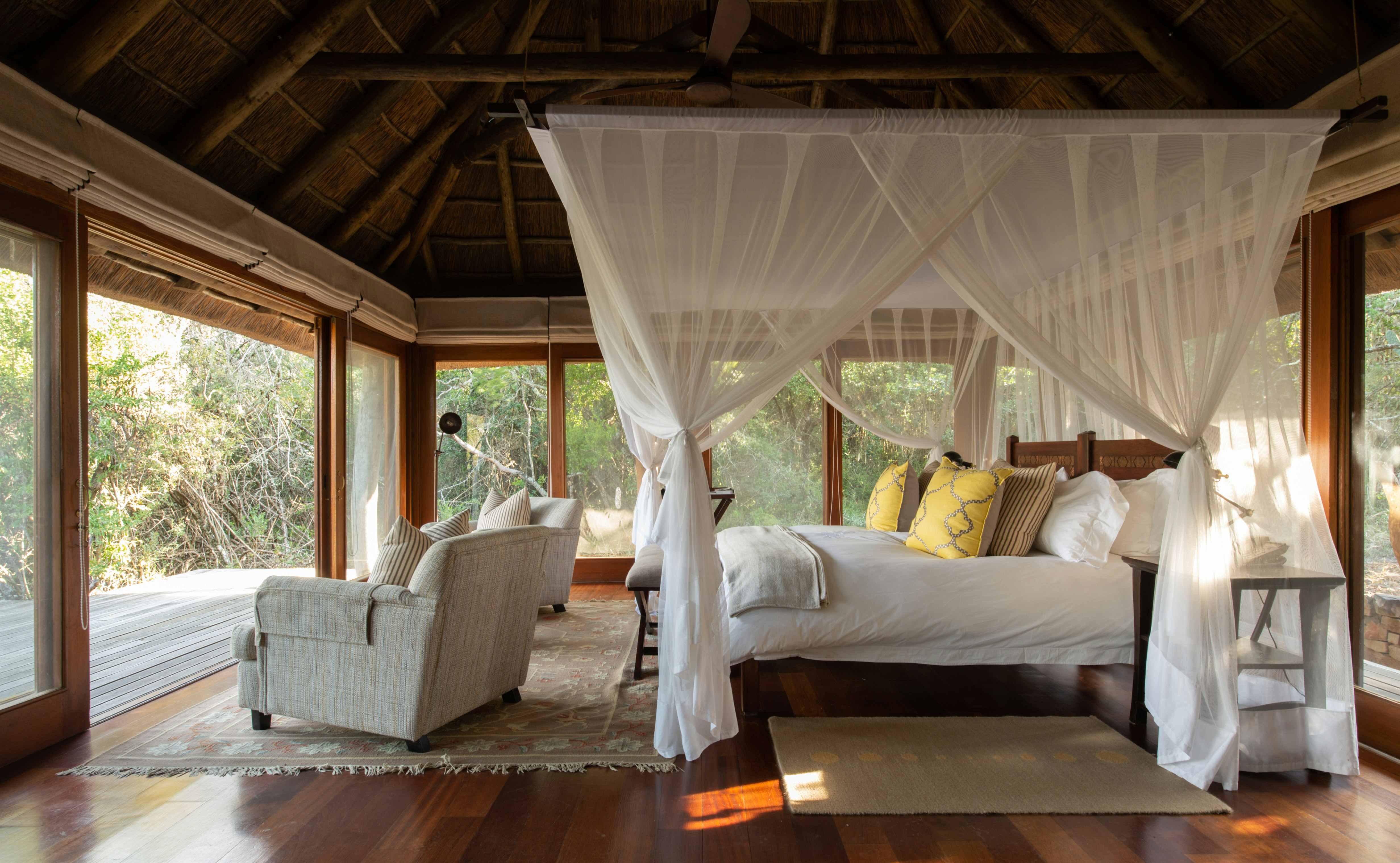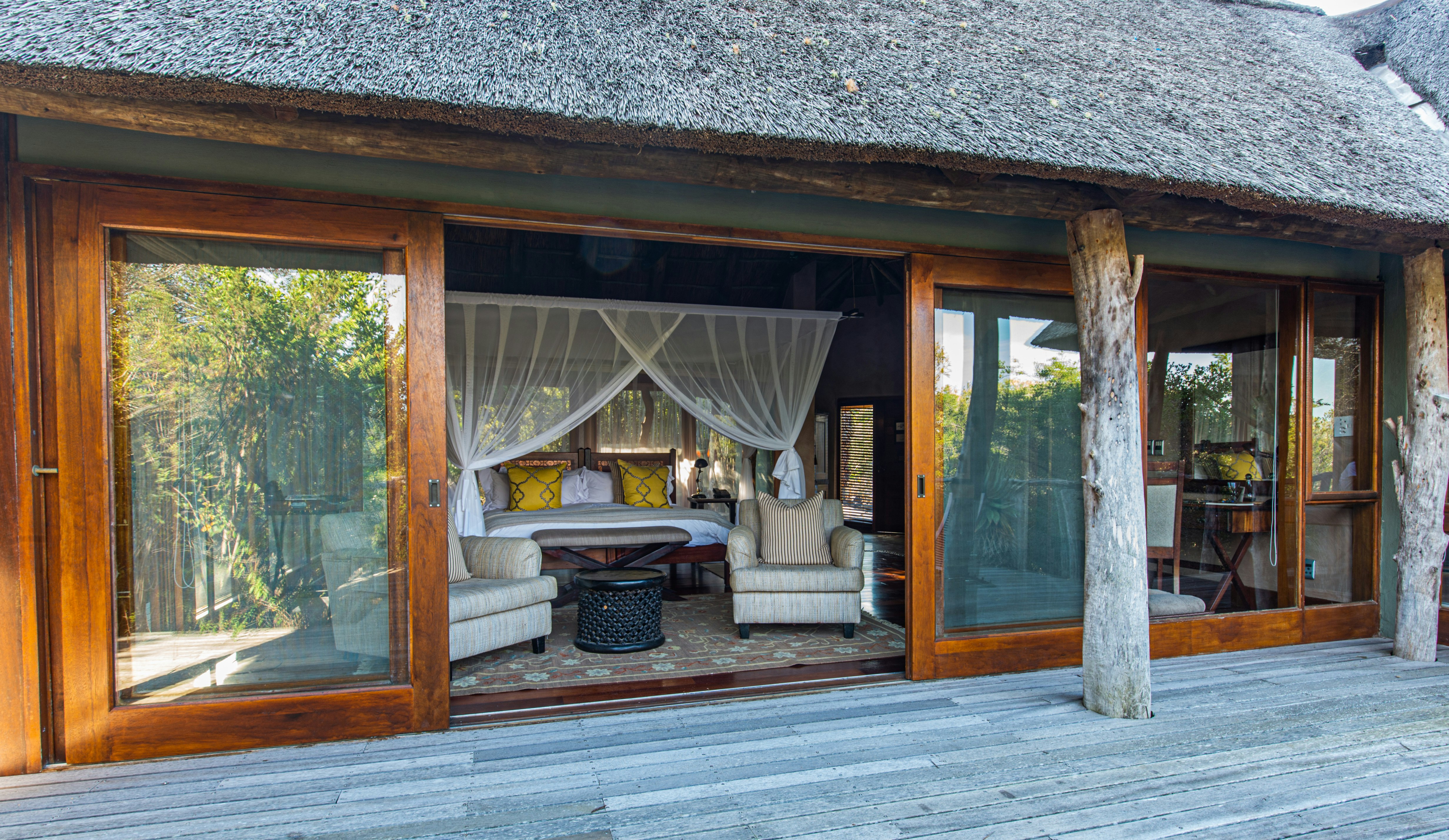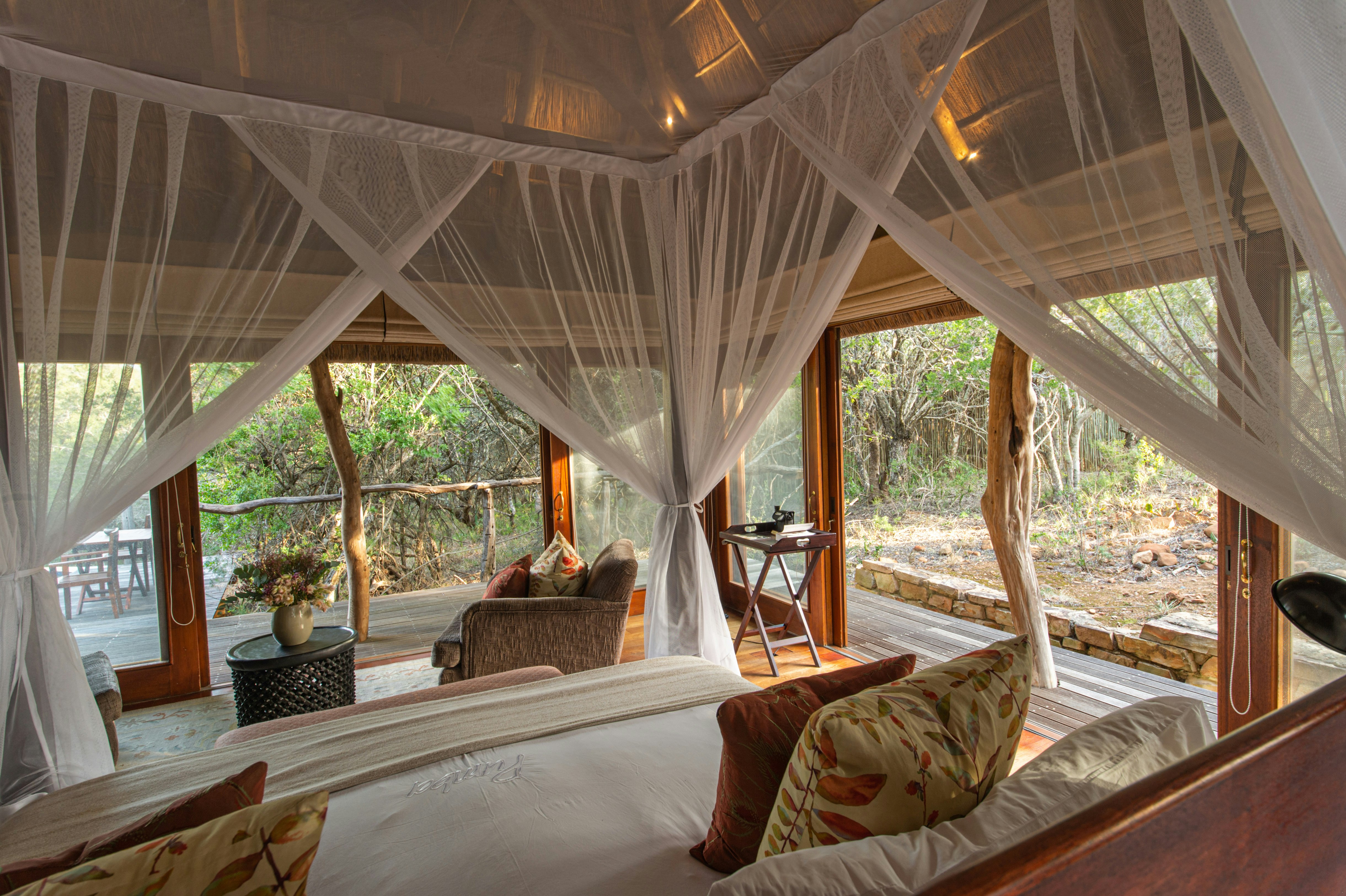 The Bush Lodge offers accommodation in luxurious, glass-enclosed thatched chalets situated in a bush setting, that flow into the surroundings. Each of the chalets is furnished with four-poster beds with mosquito nets, and have en-suite bathrooms fitted with heated towel rails, showers and baths with views of the surroundings. The air-conditioned chalets offer a lounge area, a mini-bar and hospitality trays, a cosy fireplace, an electronic safe, as well as a direct-dial telephone. The chalets open onto private wood viewing decks with plunge pools and outdoor showers, and overlook the waterhole on the flood plain.