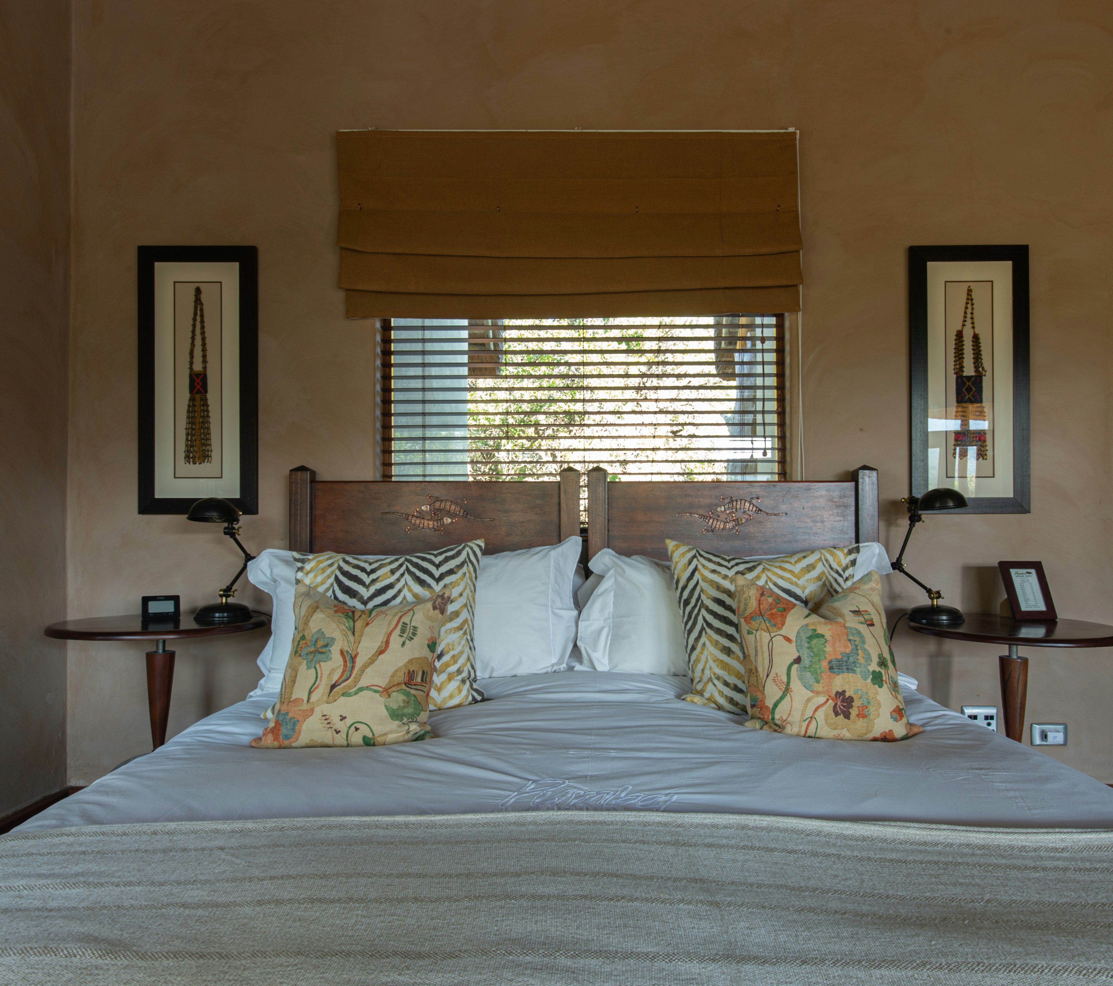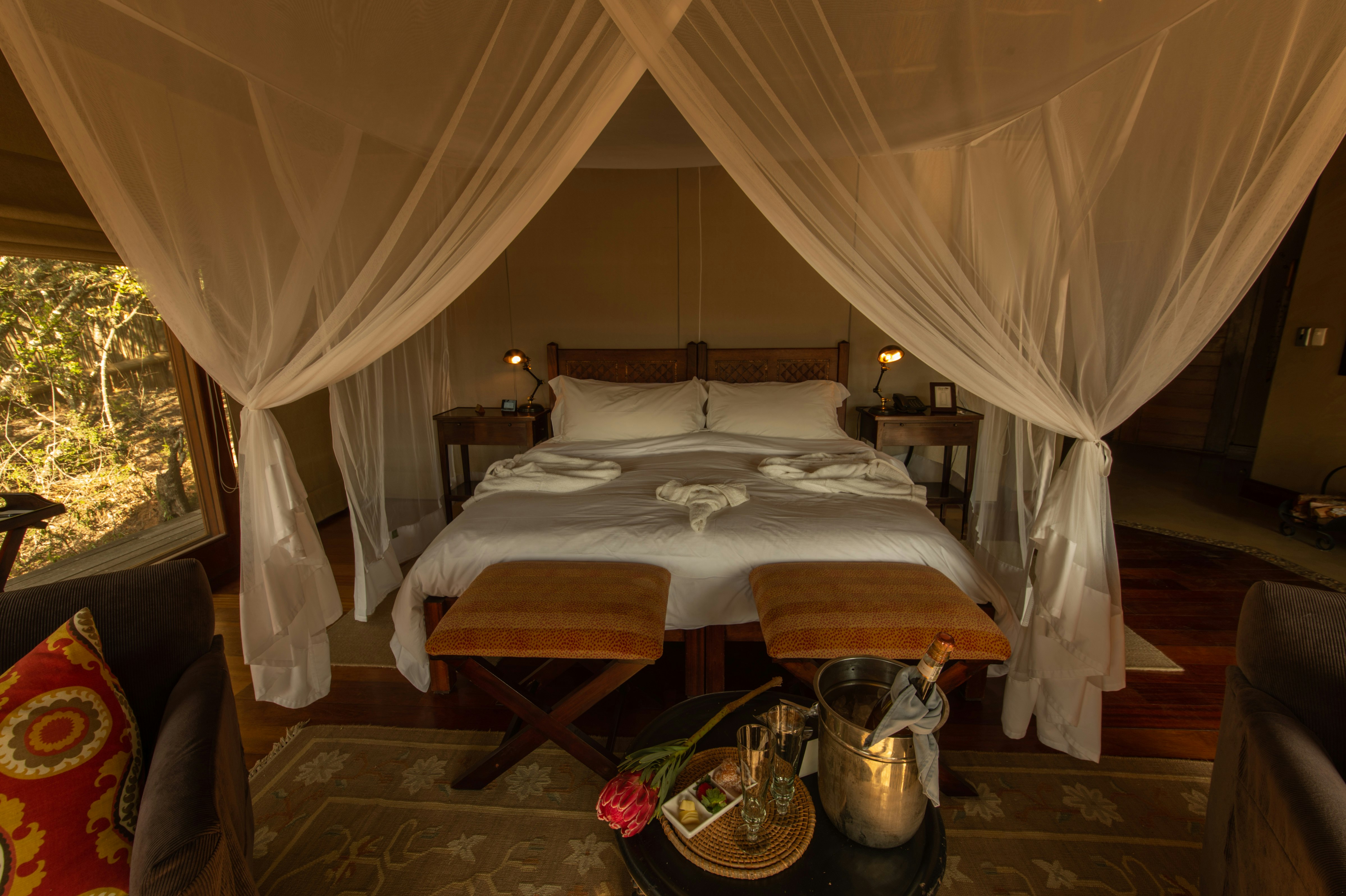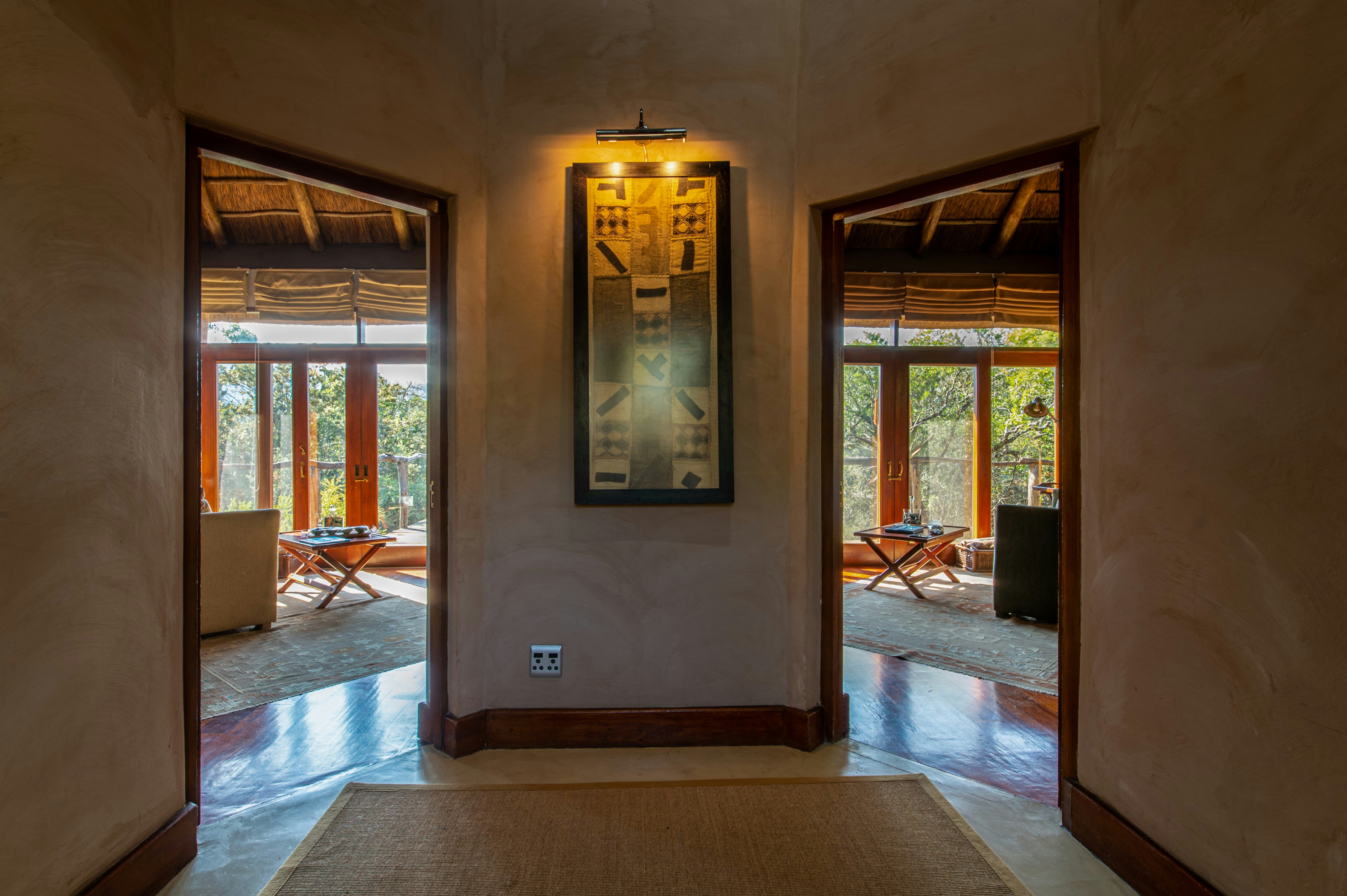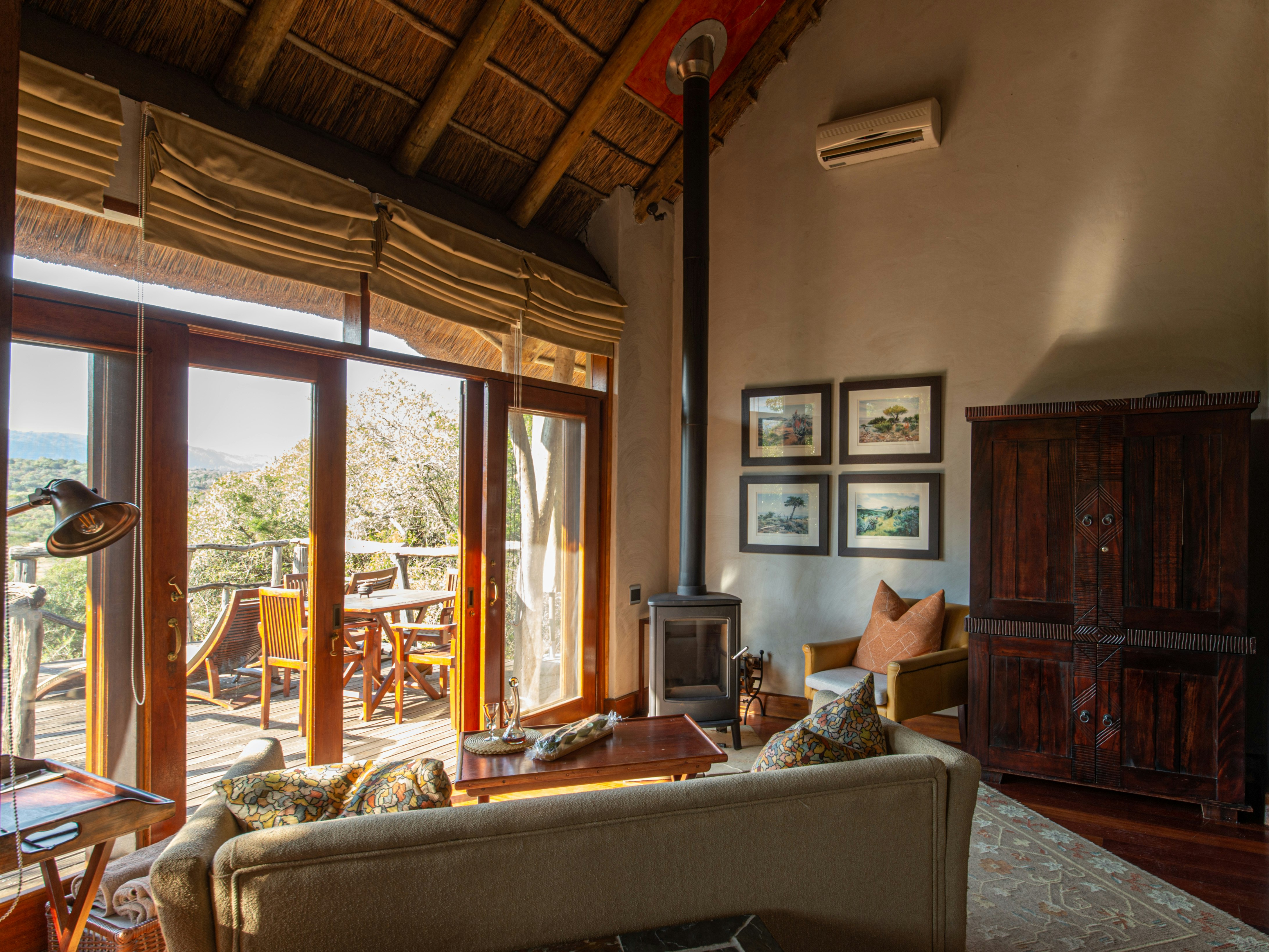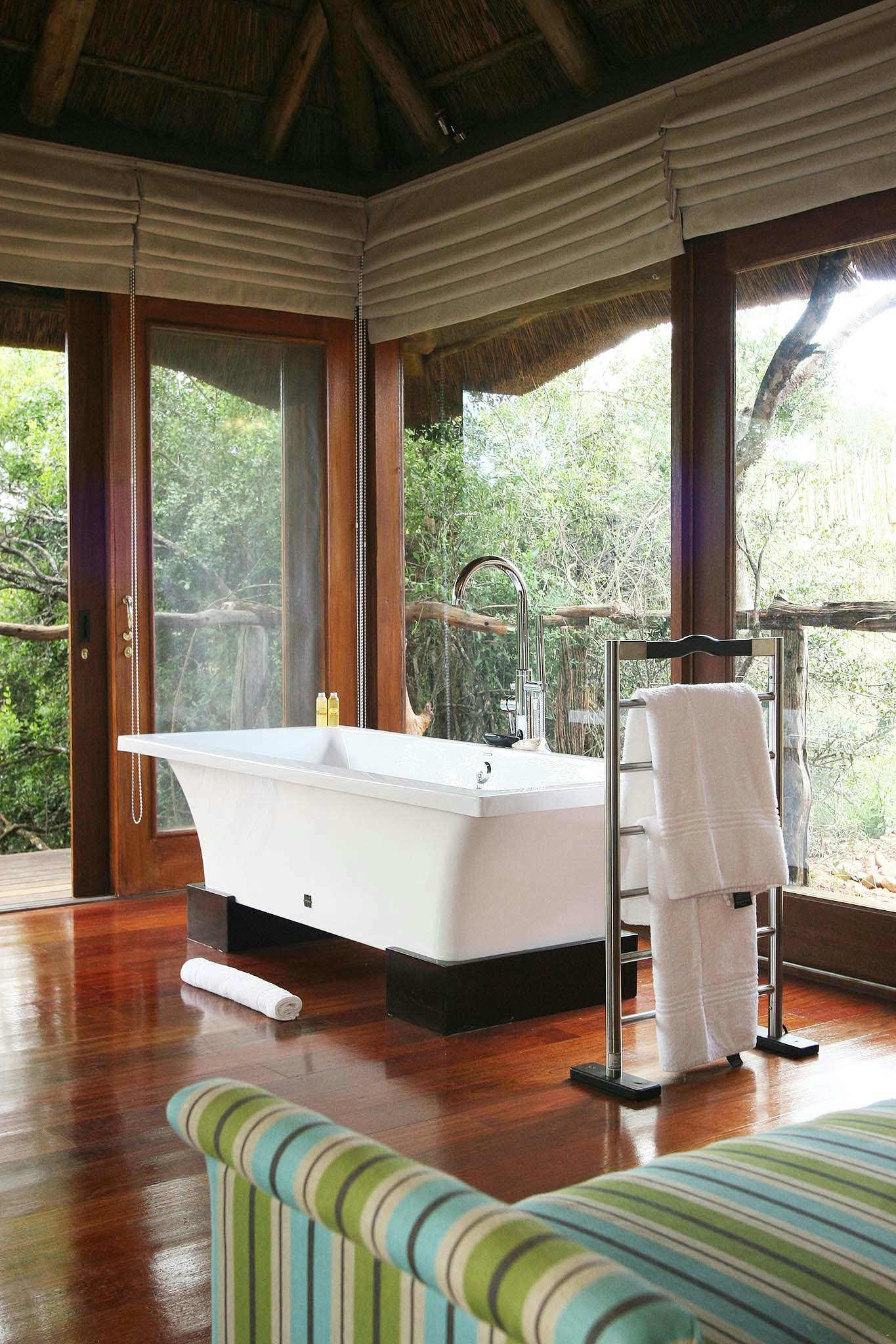 The Bush Lodge offers accommodation in luxurious, glass-enclosed thatched chalets situated in a bush setting, that flow into the surroundings. Each of the chalets is furnished with four-poster beds with mosquito nets, and have en-suite bathrooms fitted with heated towel rails, showers and baths with views of the surroundings. The air-conditioned chalets offer a lounge area, a mini-bar and hospitality trays, a cosy fireplace, an electronic safe, as well as a direct-dial telephone. The chalets open onto private wood viewing decks with plunge pools and outdoor showers, and overlook the waterhole on the flood plain.