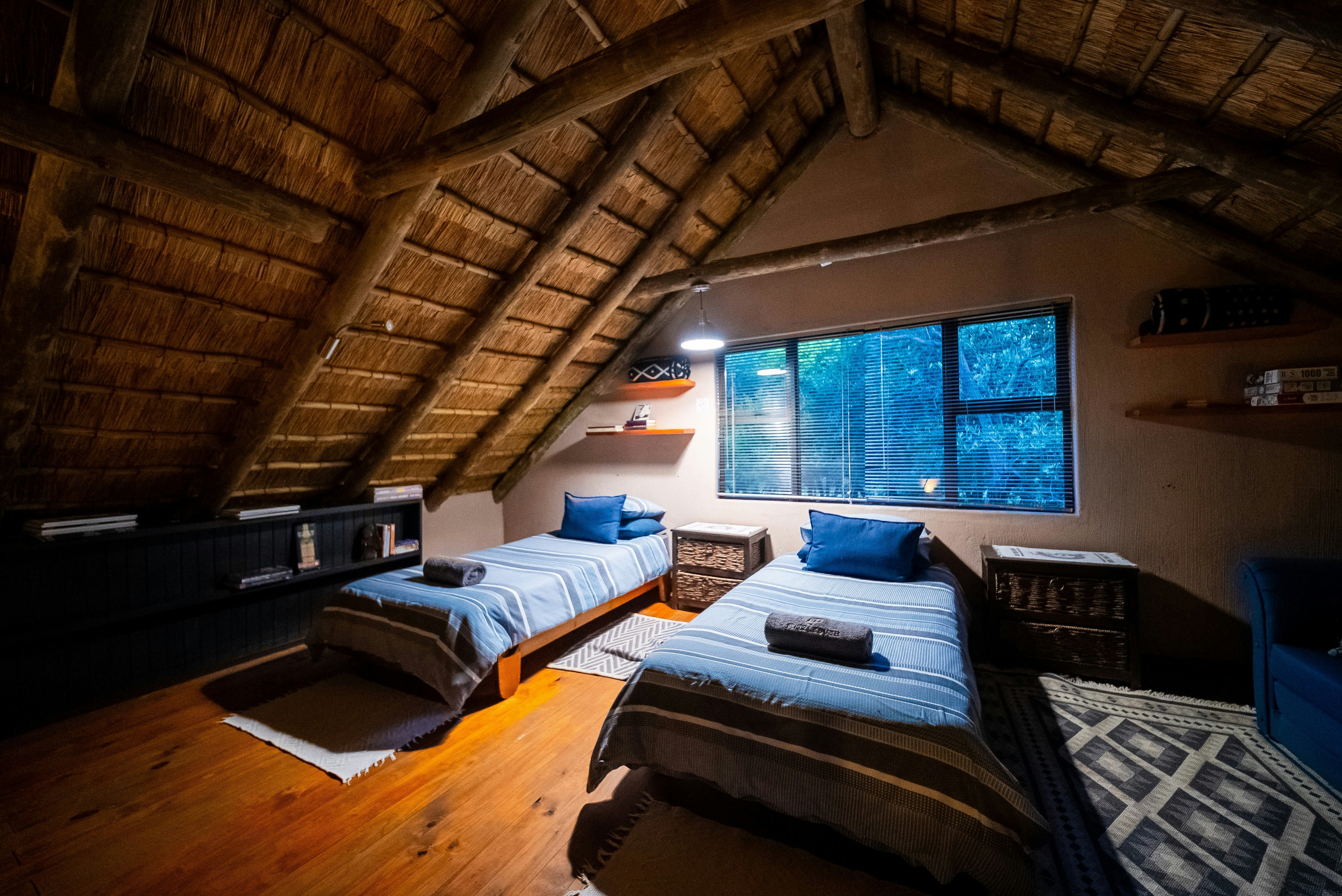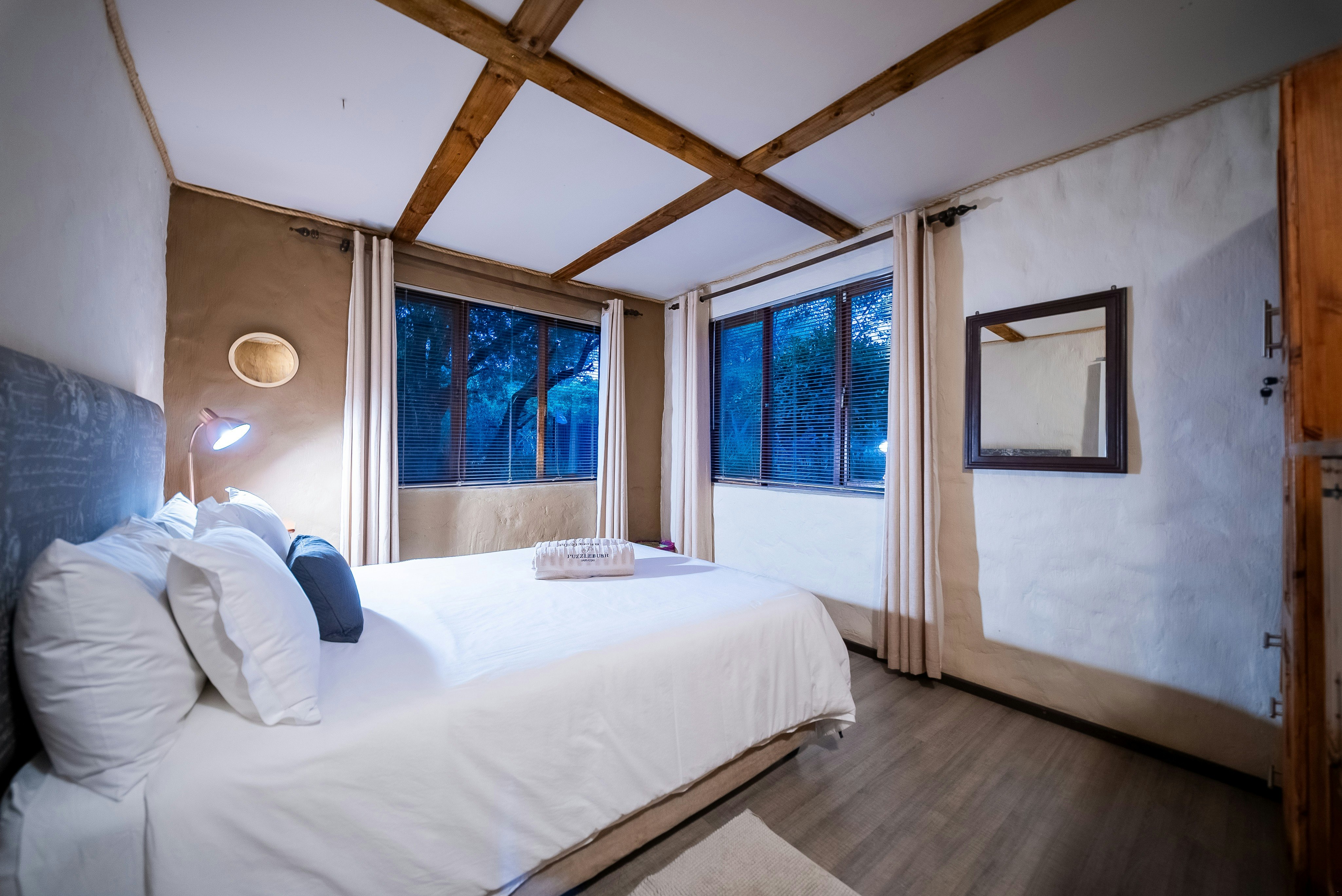 Puzzlebush Farmstay offers a tranquil farm experience with large trees, abundant birdlife, chickens, bushbuck, and red hartebeest. There are mountain biking and hiking trails on the farm. The property is solar- and gas-powered, so guests are not affected by load-shedding.