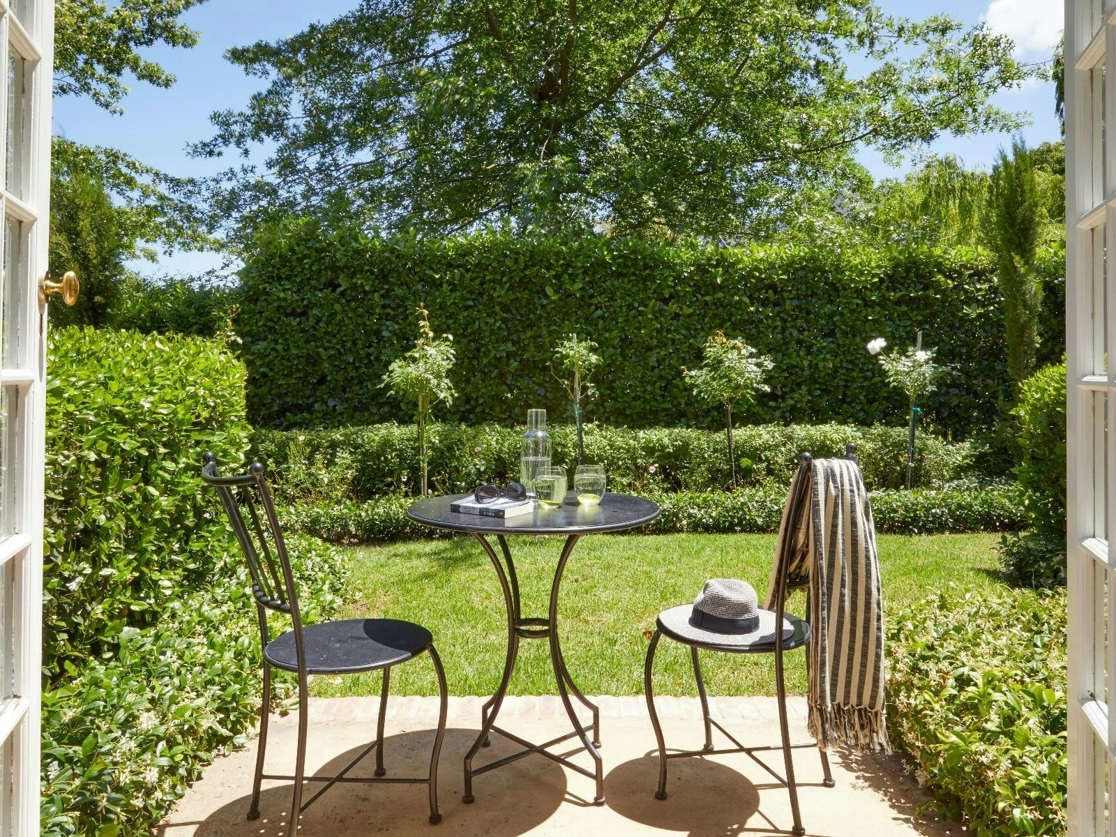 The highlight is the outdoor space: a sparkling swimming pool, sun loungers on the lawn, and a shaded veranda with plenty of seating for long breakfasts, lazy afternoons and evening sundowners. It’s the kind of place where you’ll spend most of your time outside — swimming, reading, chatting, or simply enjoying the quiet.