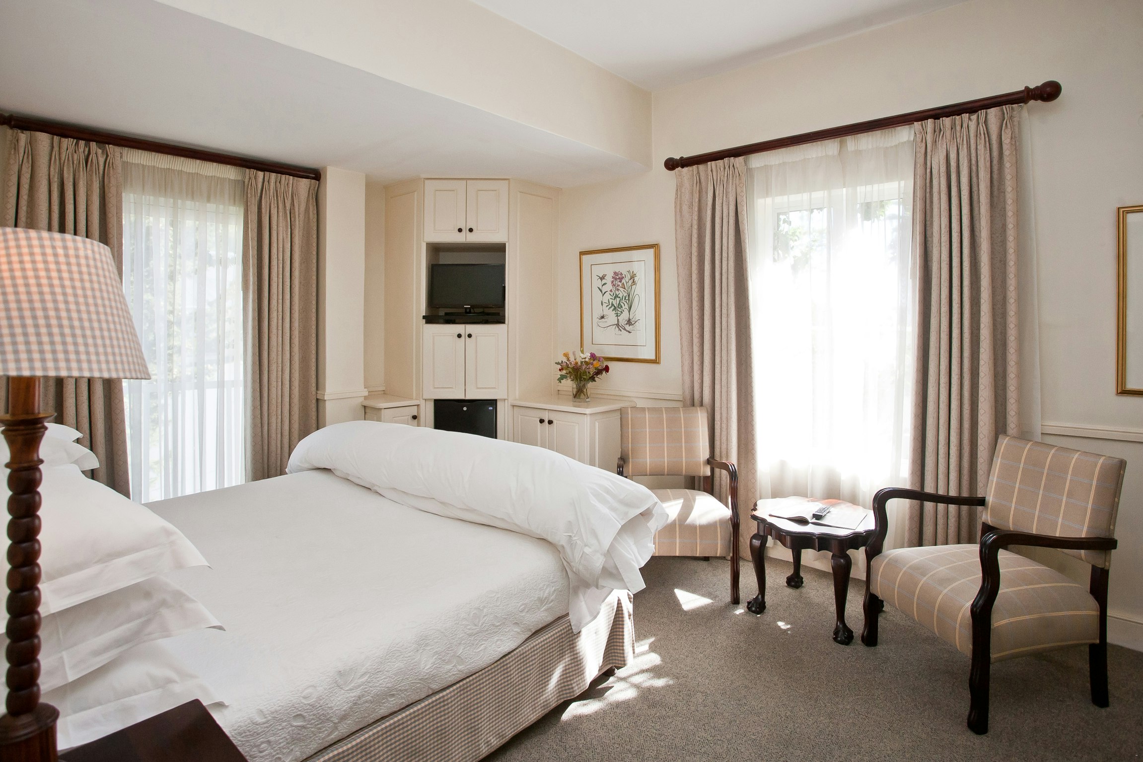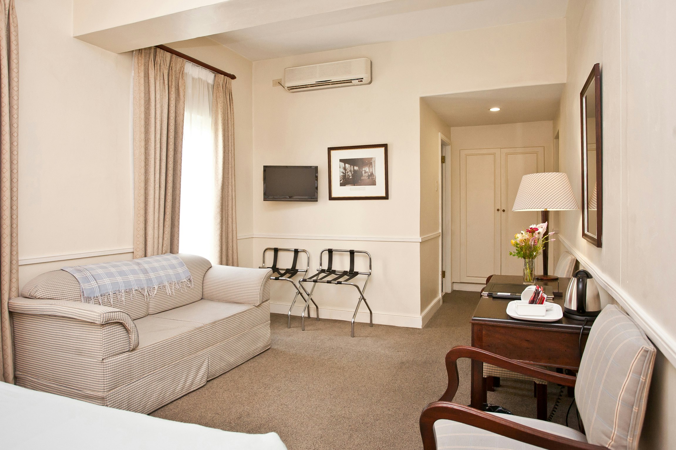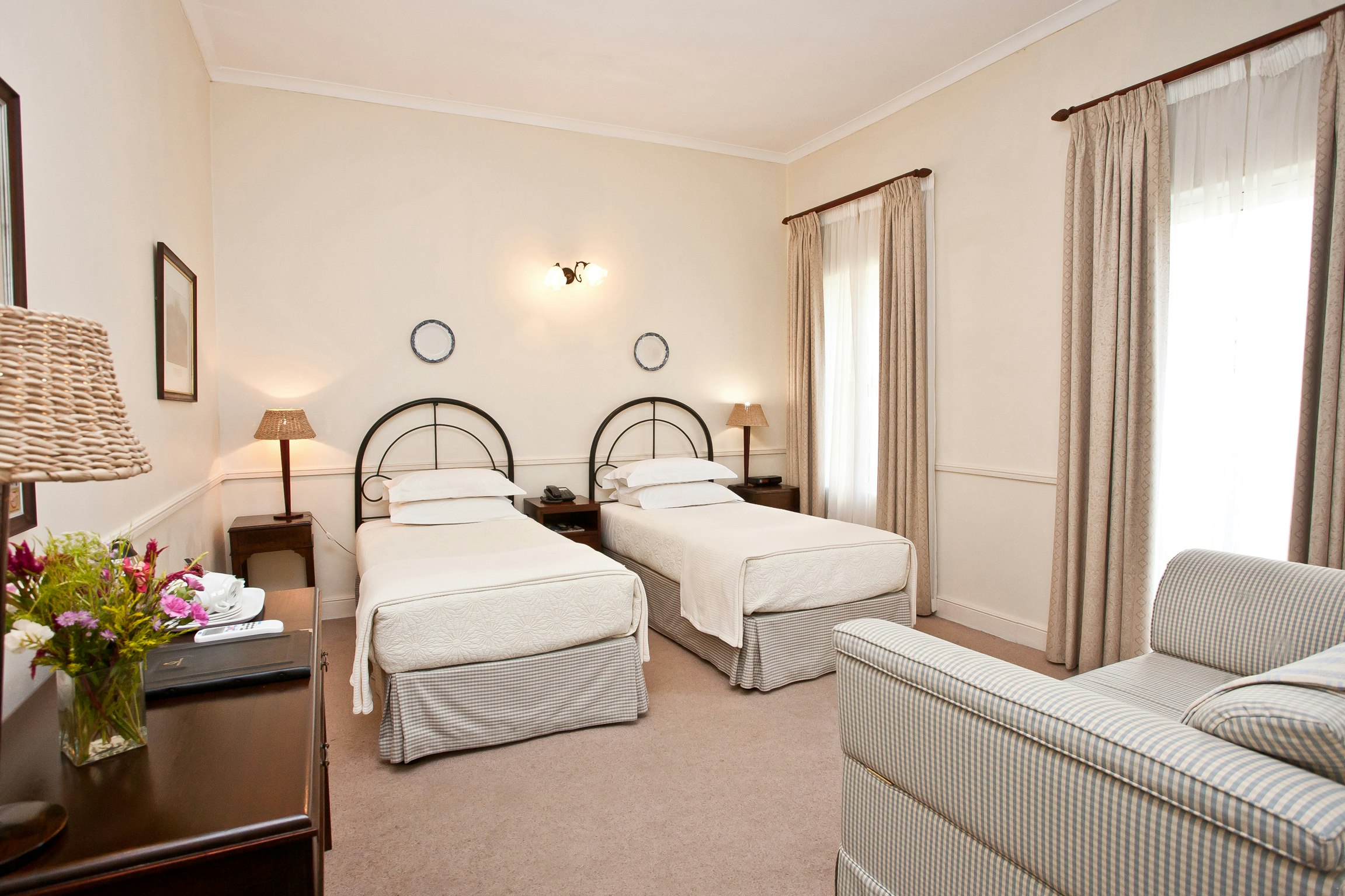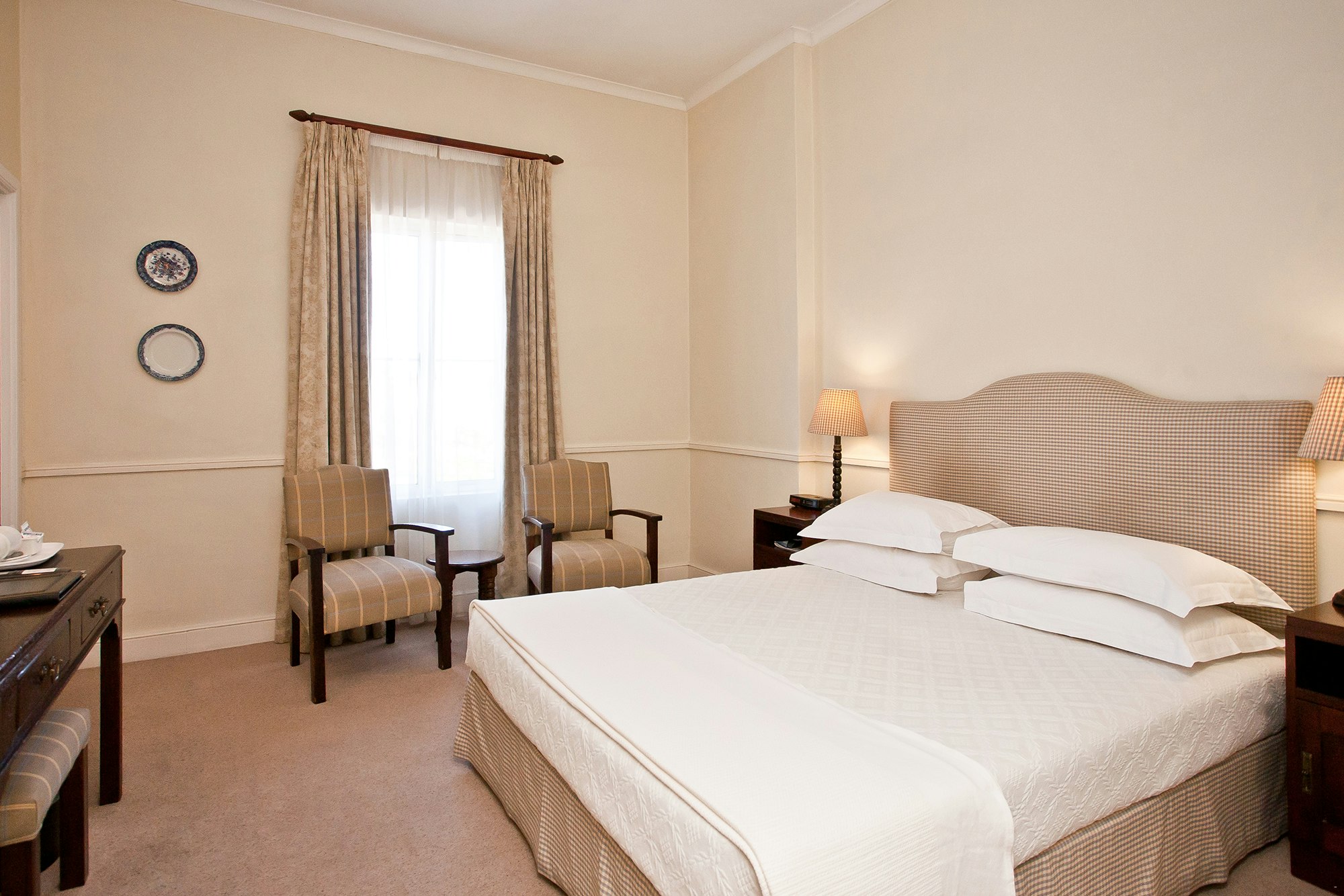 The air-conditioned rooms are equipped with TV's with selected DStv channels, Wi-Fi access, clock radios, direct dial telephones, safes for valuables, desks, as well as tea- and coffee-making facilities. Two of the rooms, the Queen’s Residence and the King’s Residence, are also equipped for self-catering and have private entrances. Breakfast in the Hotel is not included for Residence guests.