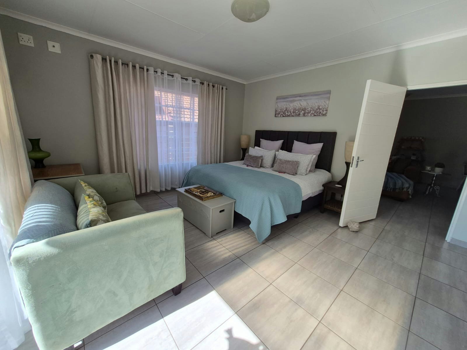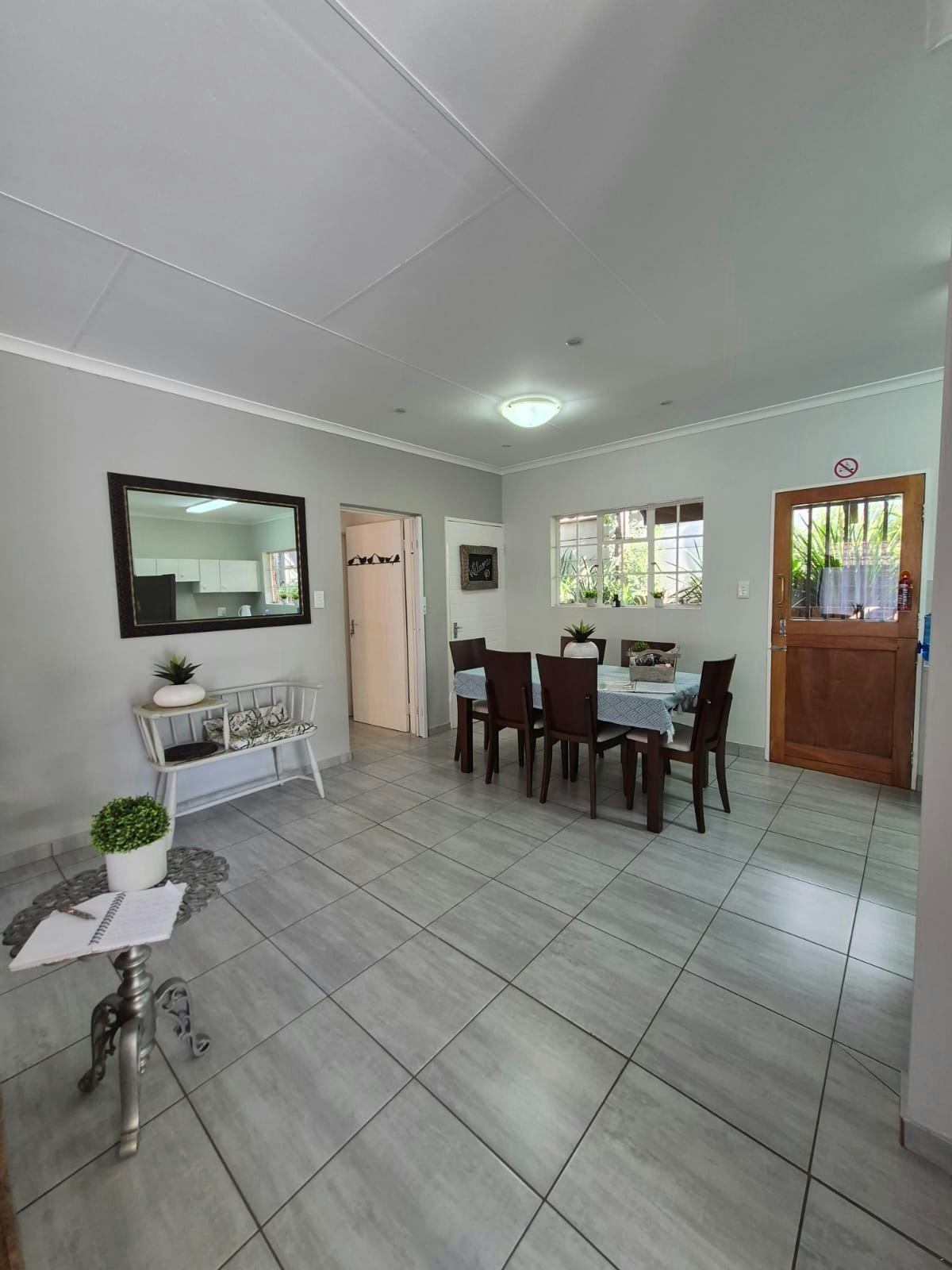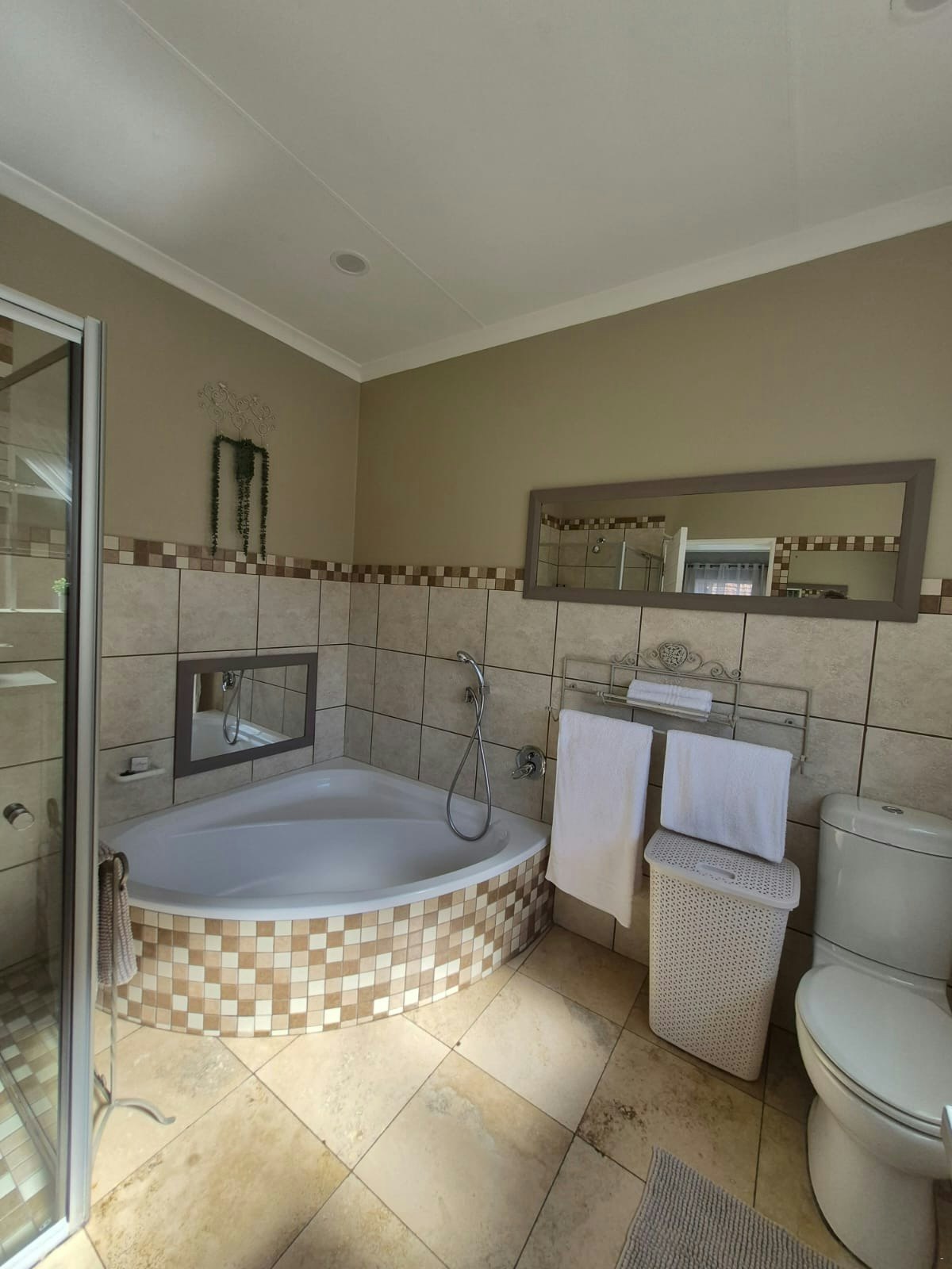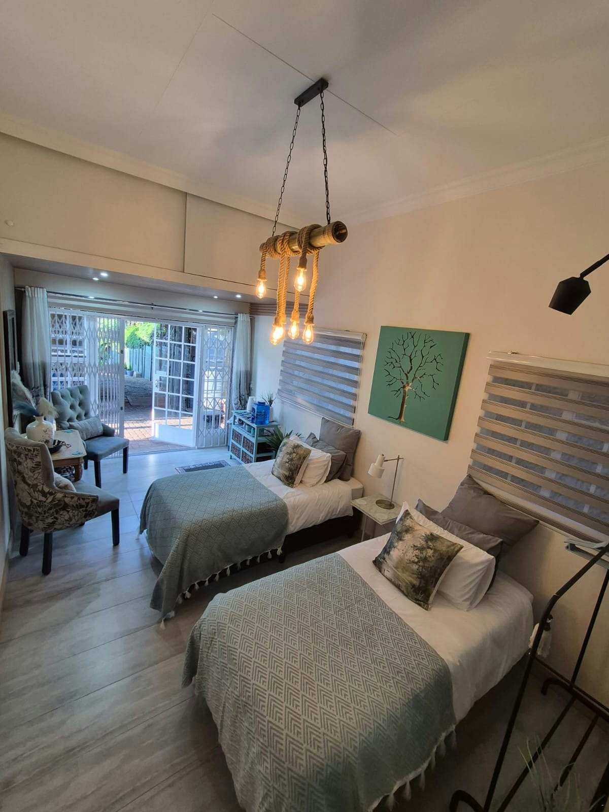 Accommodates 3 guests (2 Adults and 1 child under 10). This homely unit is very spacious with an open-plan lounge, dining room and a fully equipped kitchen with a fridge, kettle, gas stove, microwave, and air fryer. We provide tea, coffee, sugar, milk, rusks and bottled water. Enjoy watching Netflix & YouTube on a big screen Smart TV in the lounge. This unit also offers a hairdryer, steam iron, clothing steamer, washing machine, tumble dryer, heater and fan for guests who are staying a bit longer. The bedroom overlooking the swimming pool and is furnished with a king-size bed (2 single beds placed together but can be separated if required). We can accommodate a younger child in the lounge by adding an extra mattress and bedding or the child can sleep on the very comfortable L-shape couch. The ensuite bathroom is very spacious and is fitted with a bath and big shower. We provide shower gel & towels.