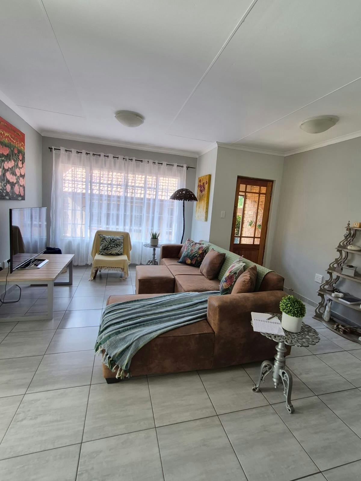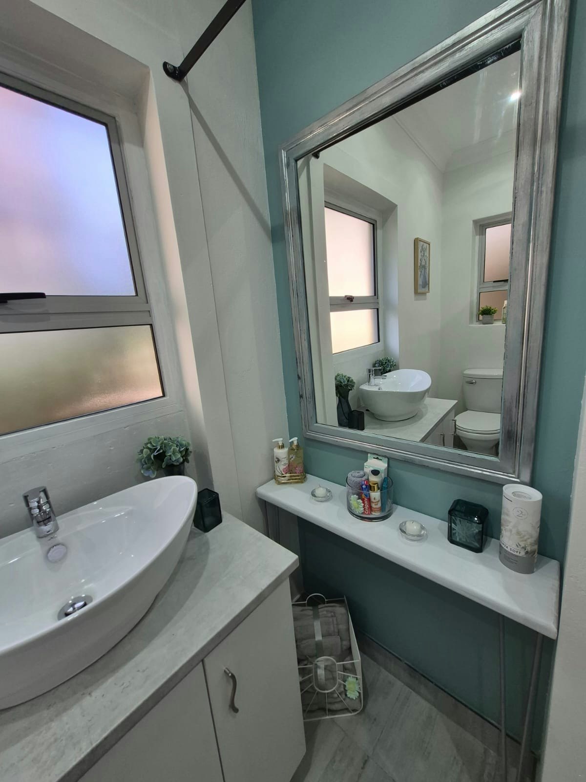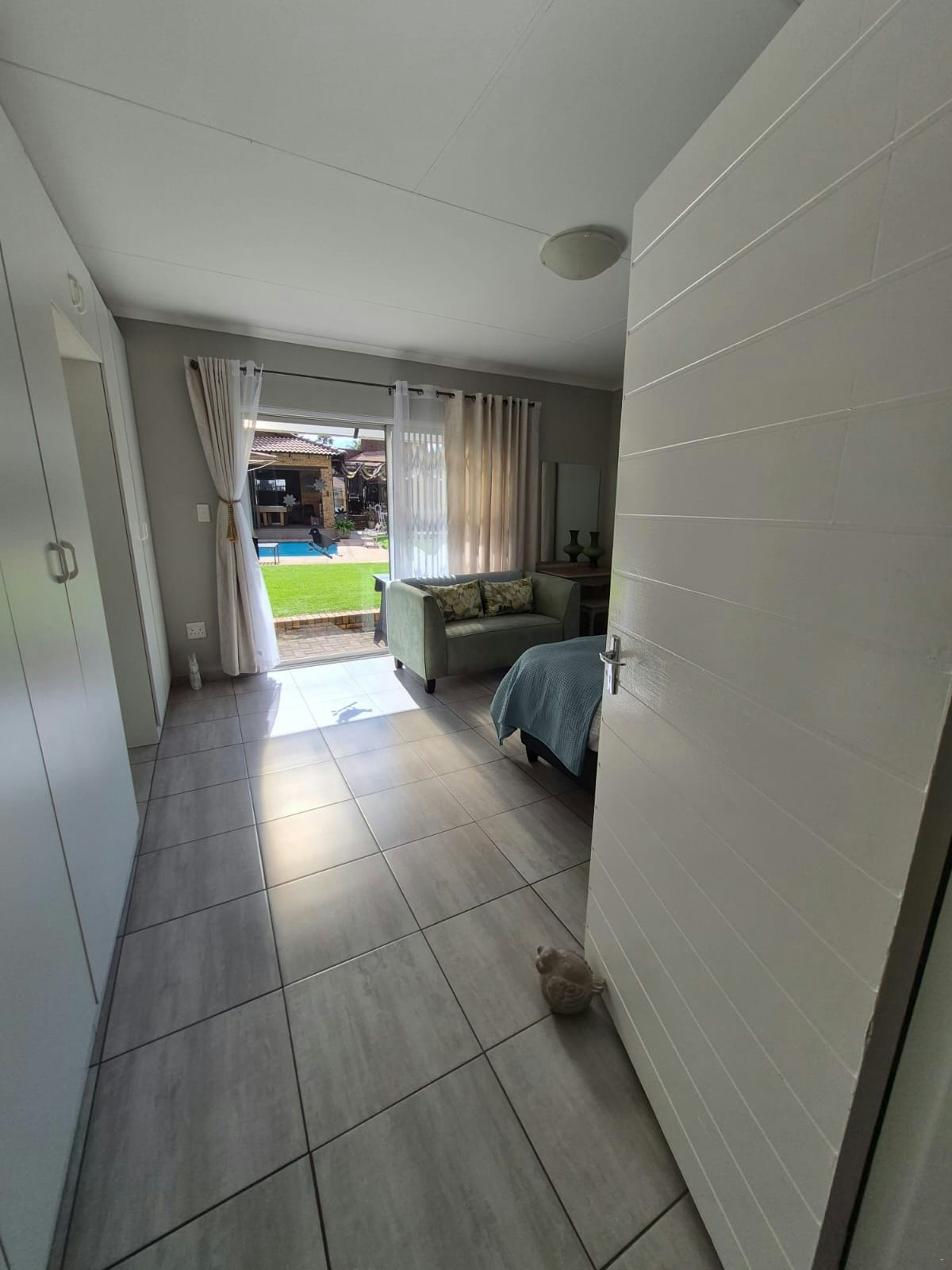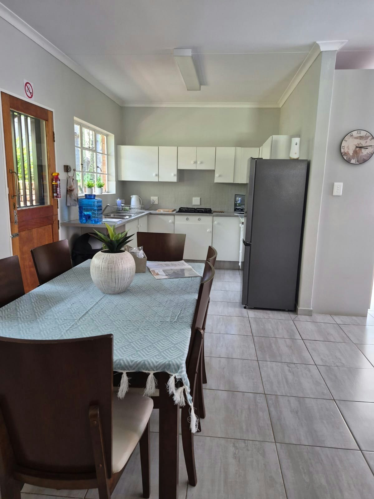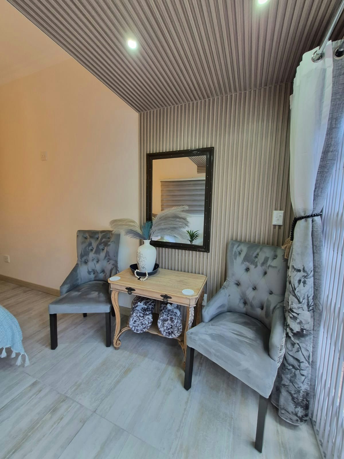 Accommodates 3 guests (2 Adults and 1 child under 10). This homely unit is very spacious with an open-plan lounge, dining room and a fully equipped kitchen with a fridge, kettle, gas stove, microwave, and air fryer. We provide tea, coffee, sugar, milk, rusks and bottled water. Enjoy watching Netflix & YouTube on a big screen Smart TV in the lounge. This unit also offers a hairdryer, steam iron, clothing steamer, washing machine, tumble dryer, heater and fan for guests who are staying a bit longer. The bedroom overlooking the swimming pool and is furnished with a king-size bed (2 single beds placed together but can be separated if required). We can accommodate a younger child in the lounge by adding an extra mattress and bedding or the child can sleep on the very comfortable L-shape couch. The ensuite bathroom is very spacious and is fitted with a bath and big shower. We provide shower gel & towels.