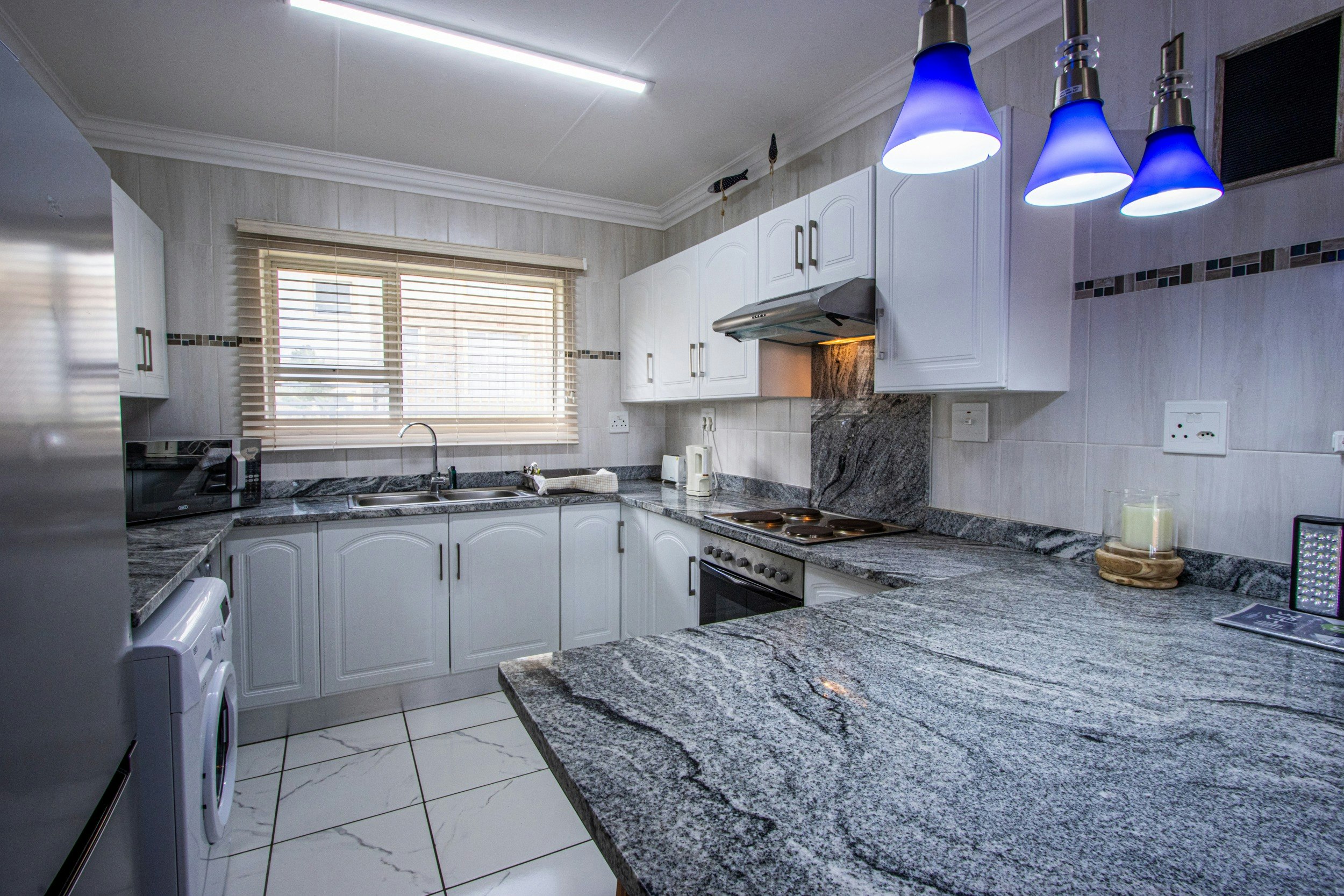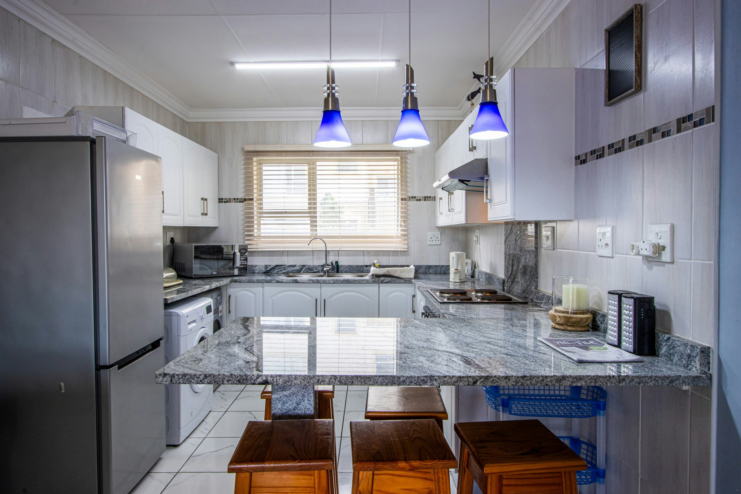 The kitchen is well-equipped for self-catering with a stove and oven, fridge-freezer, microwave, kettle, and a washing machine and tumble-dryer. The lounge contains couches and a flat-screen TV, and has sliding doors opening to a balcony with outdoor dining furniture and a kettle braai facility.