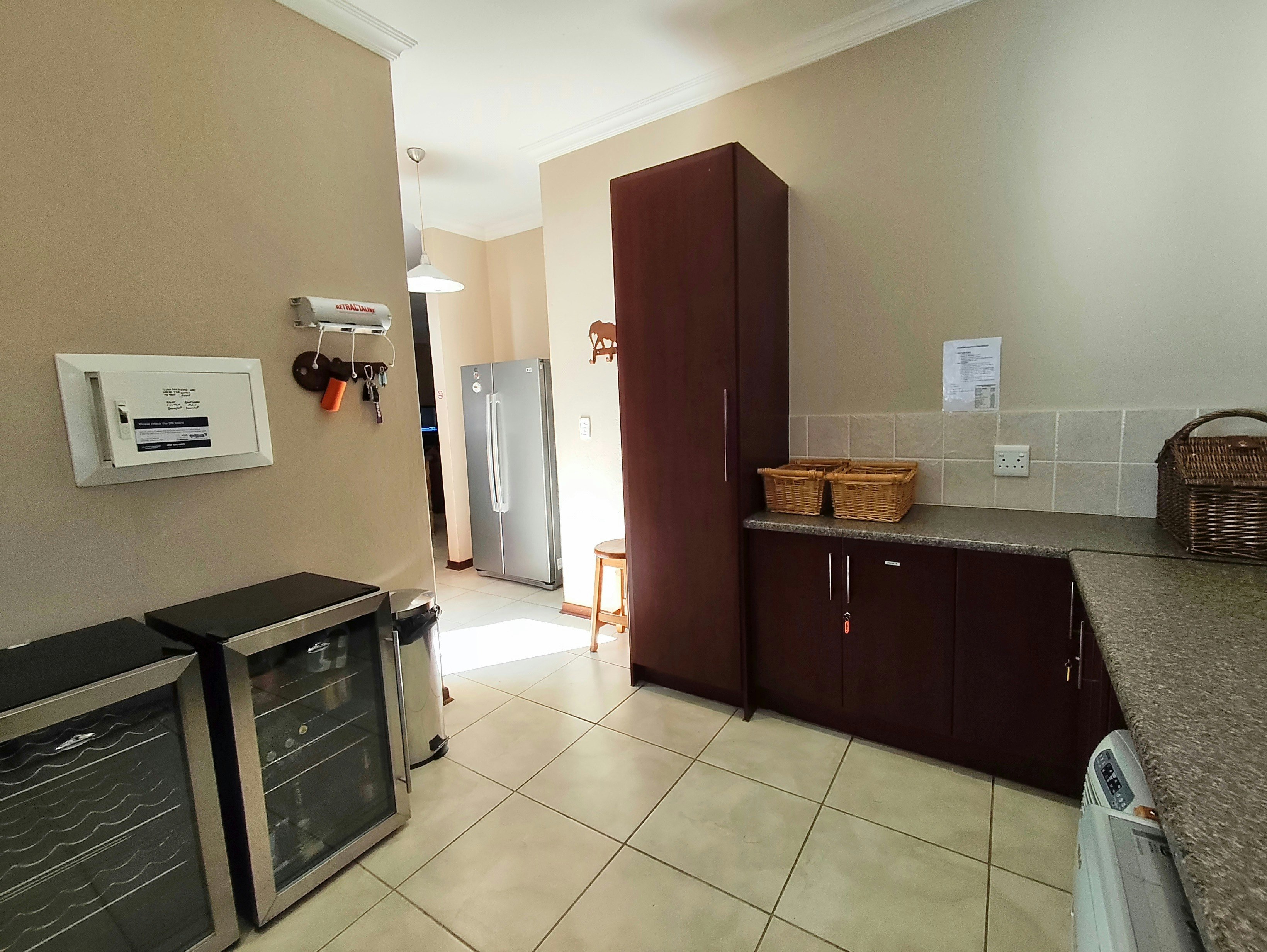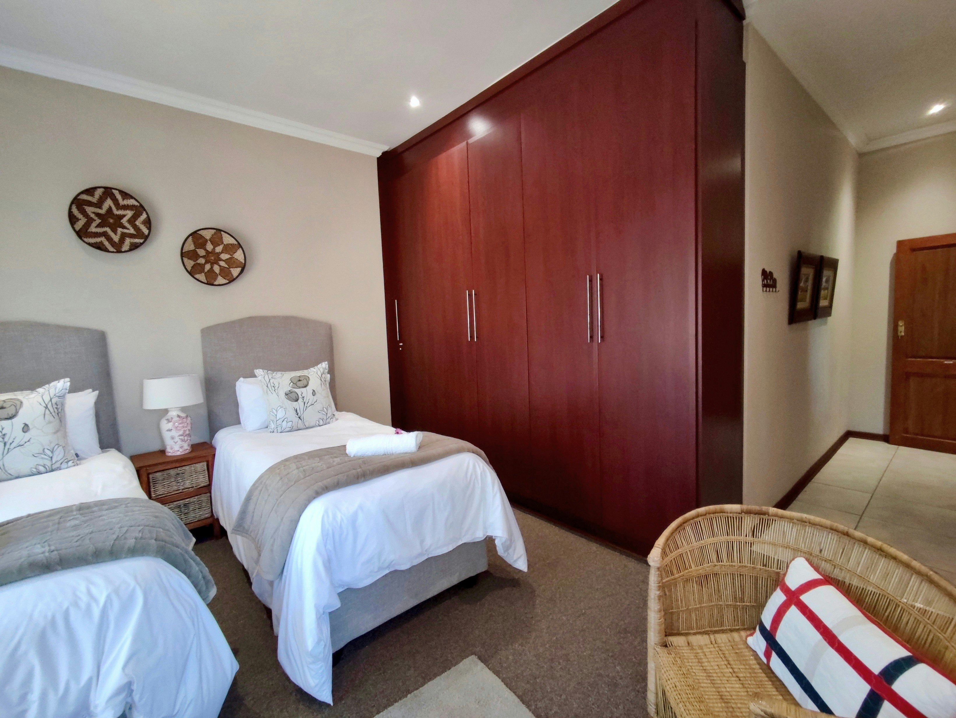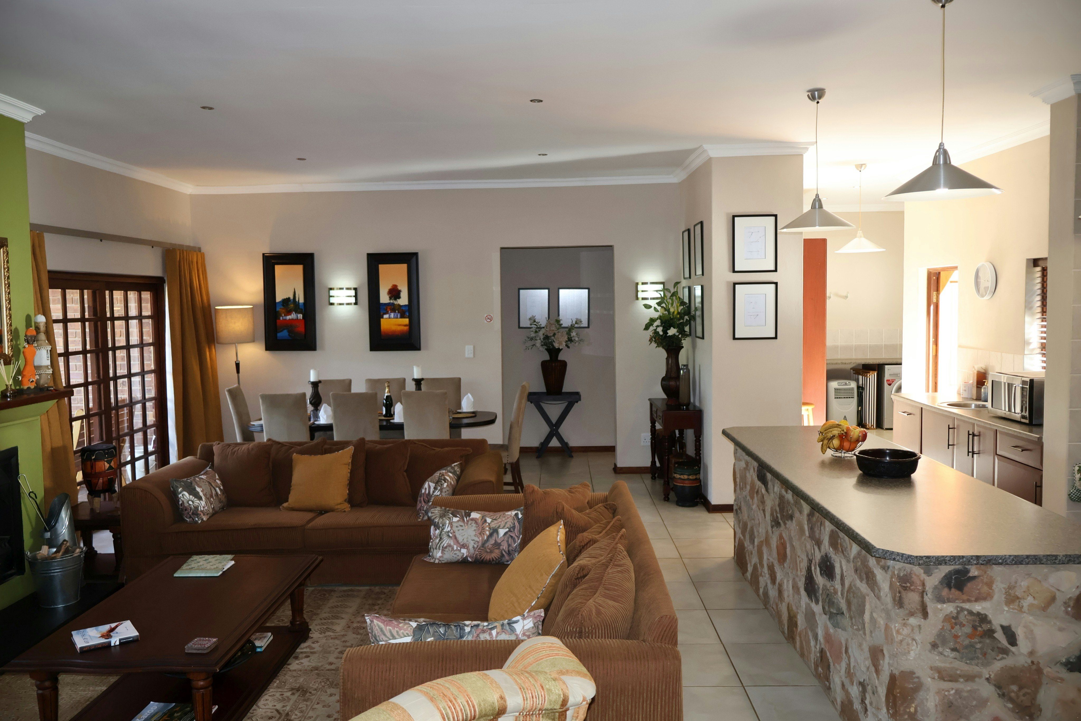 The living area leads onto a spacious furnished covered patio with built in braai and a Weber. Patio gas heater for chilly nights.