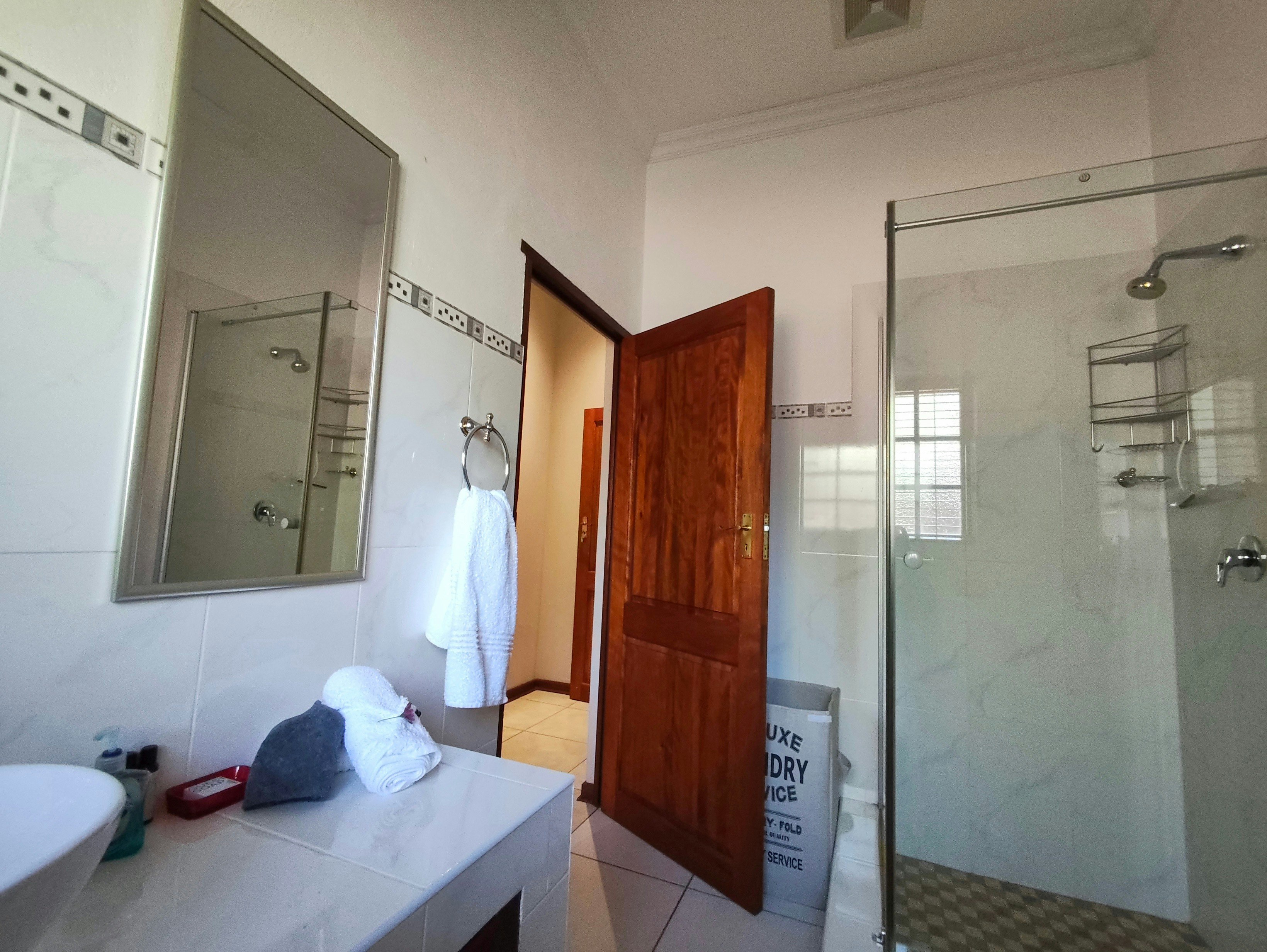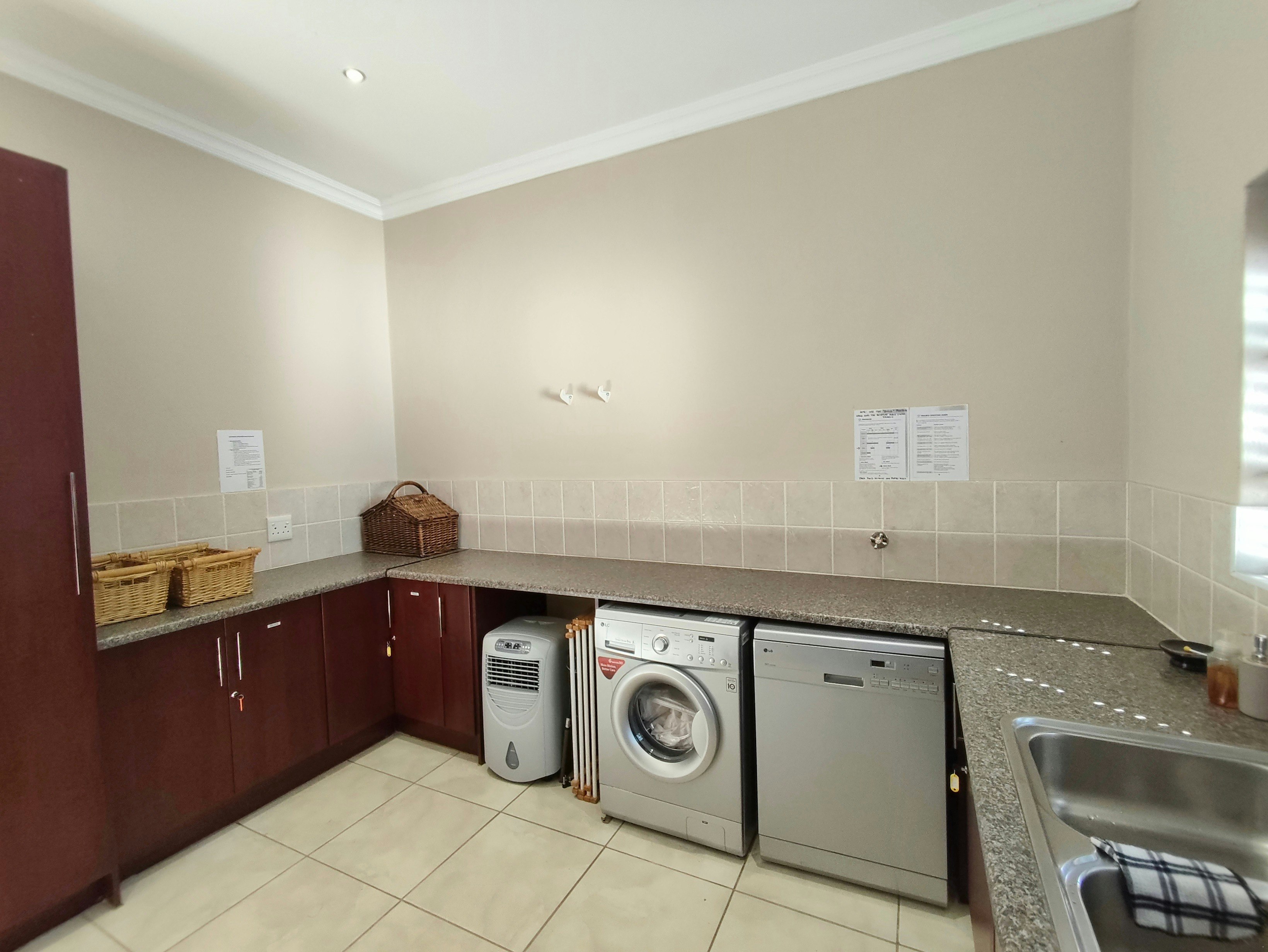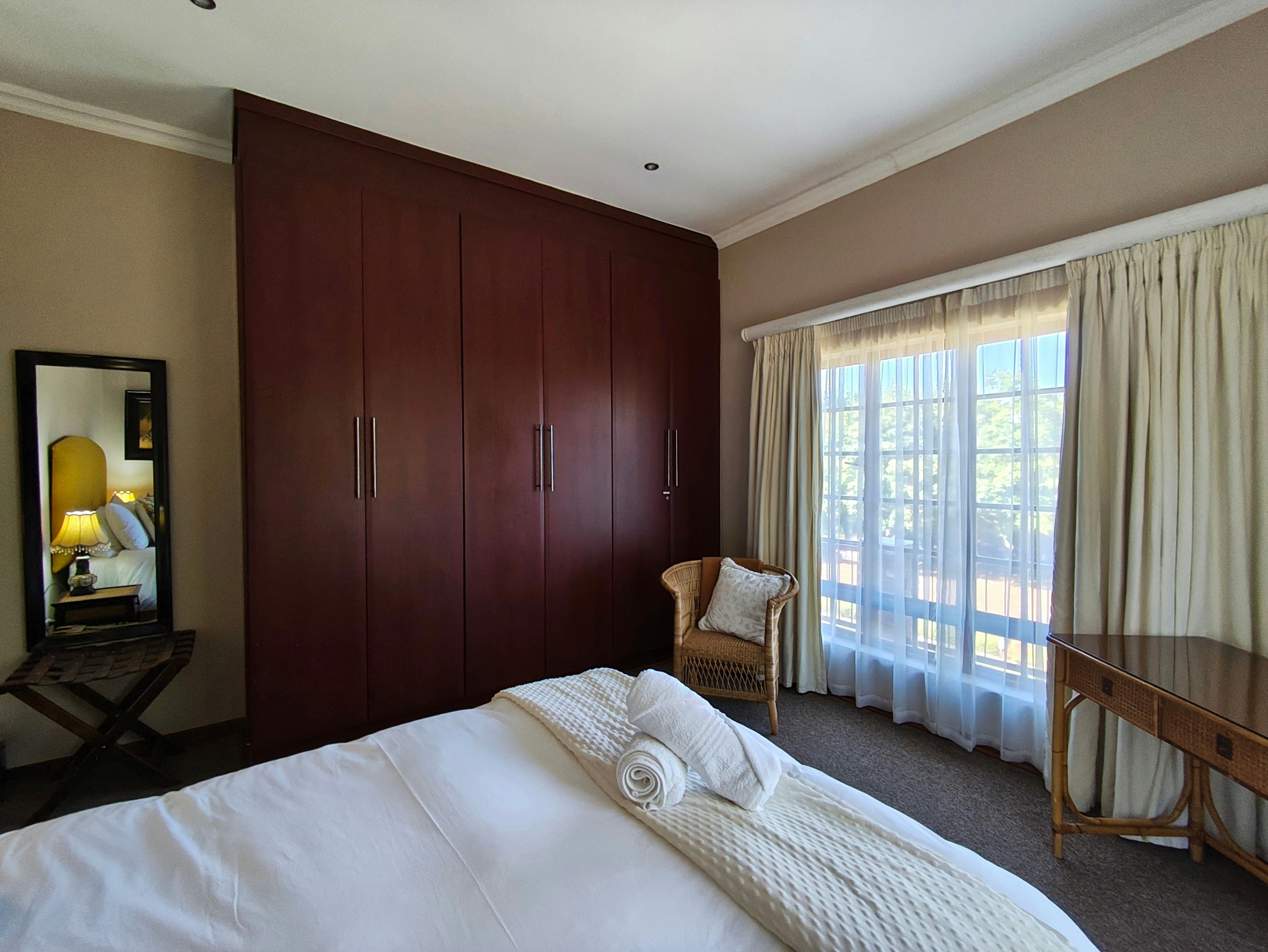 The living area leads onto a spacious furnished covered patio with built in braai and a Weber. Patio gas heater for chilly nights.