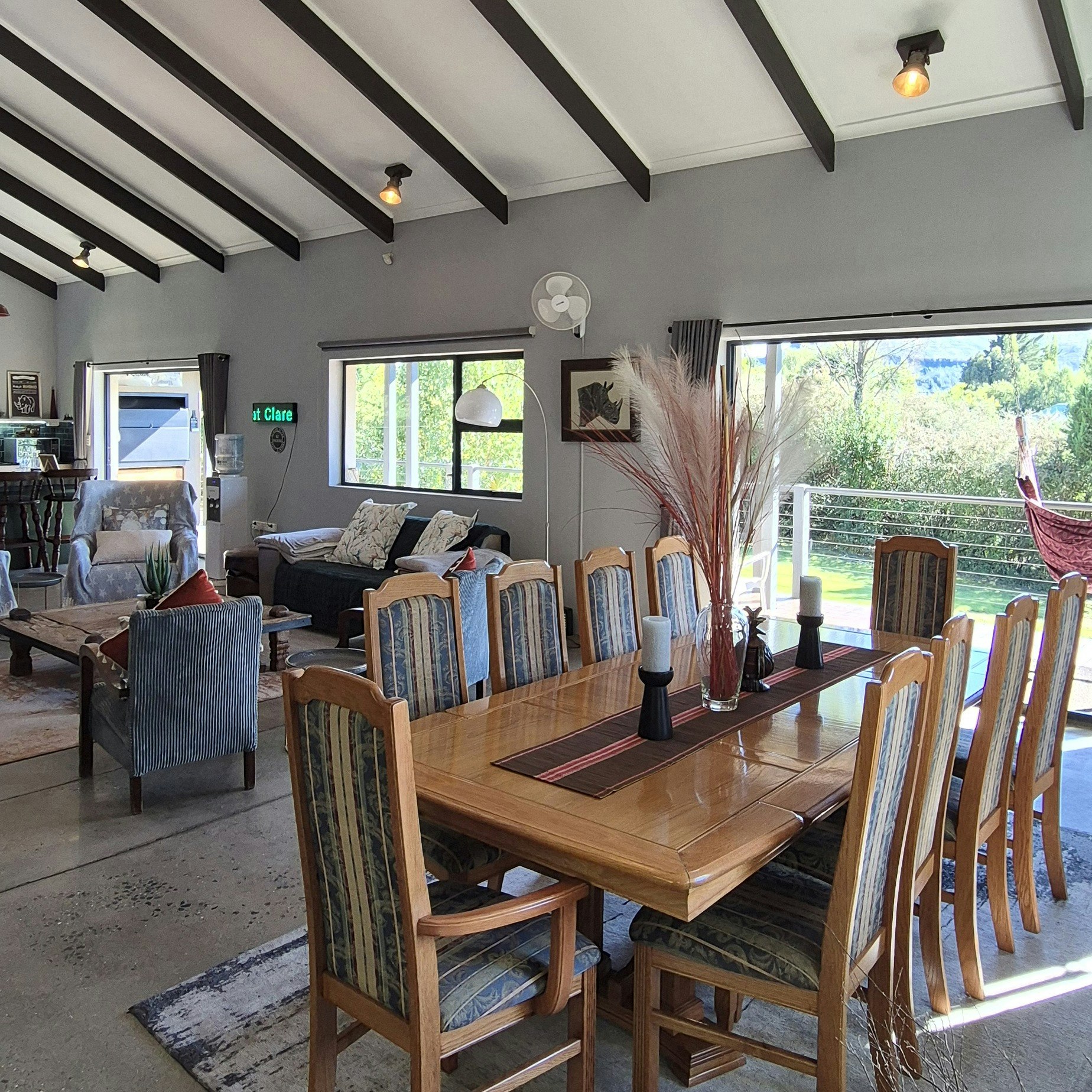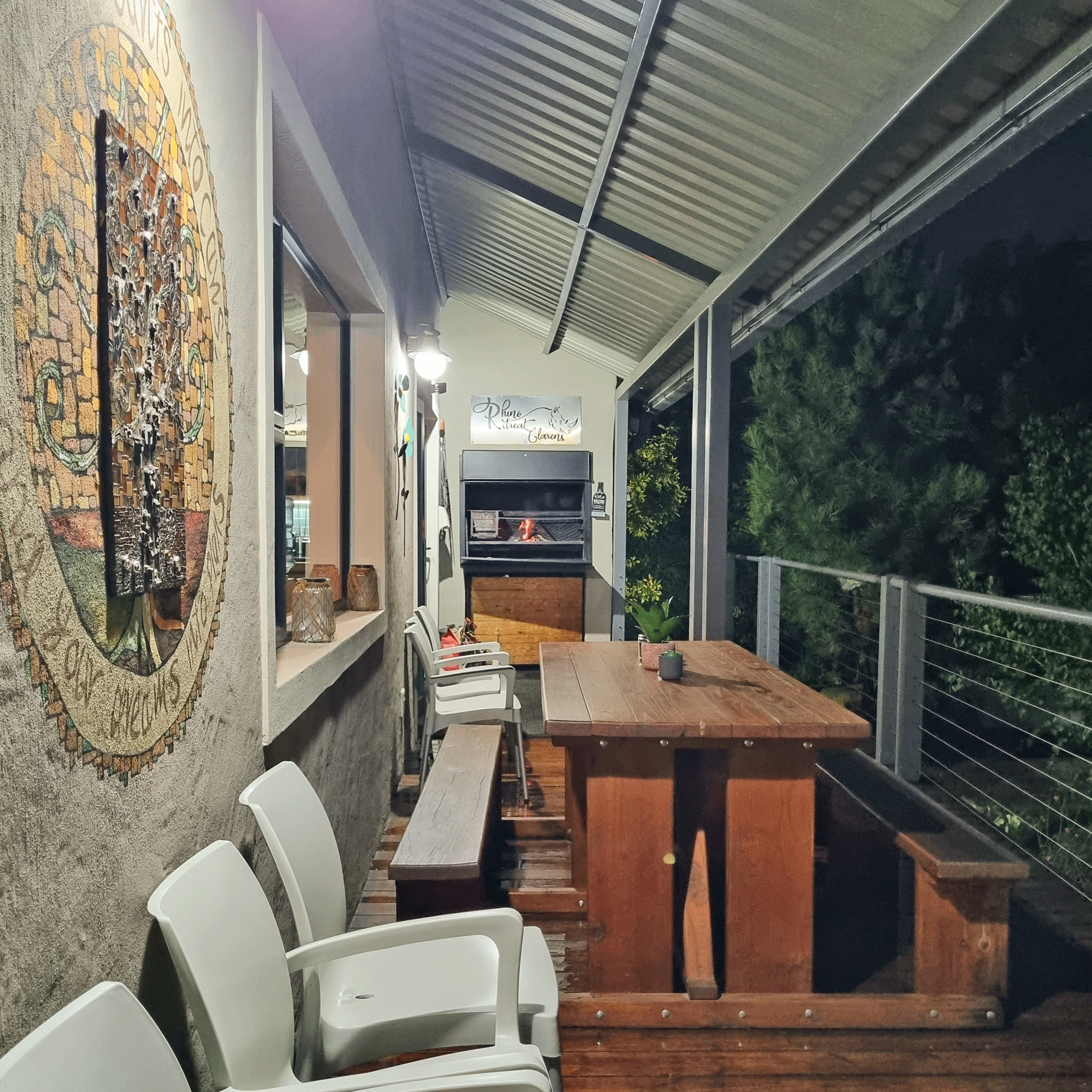 The living area opens onto a covered deck outside with beautiful views, braai facilities and an 8-seater wooden table with bench and chairs. Guests are afforded plenty of secure parking on the premises with a carport for 2 vehicles. Pets are welcome with prior arrangements. There is a beautiful fire pit in the garden area and a fully fenced-in yard with 3,000 m² of space.