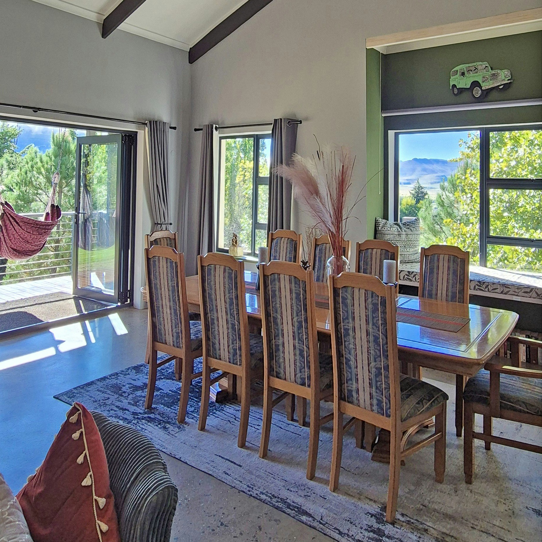 The lounge is furnished with a comfortable couch and chairs, a fireplace, a TV with an internet connection to access Netflix and YouTube, and complimentary Wi-Fi is available throughout the home. The living area leads onto a dining area with a 10-seater dining table. There is an electric fan which keeps the area cool in summer. You will find a reading nook in the dining area, where books, puzzles and games are provided for relaxation.