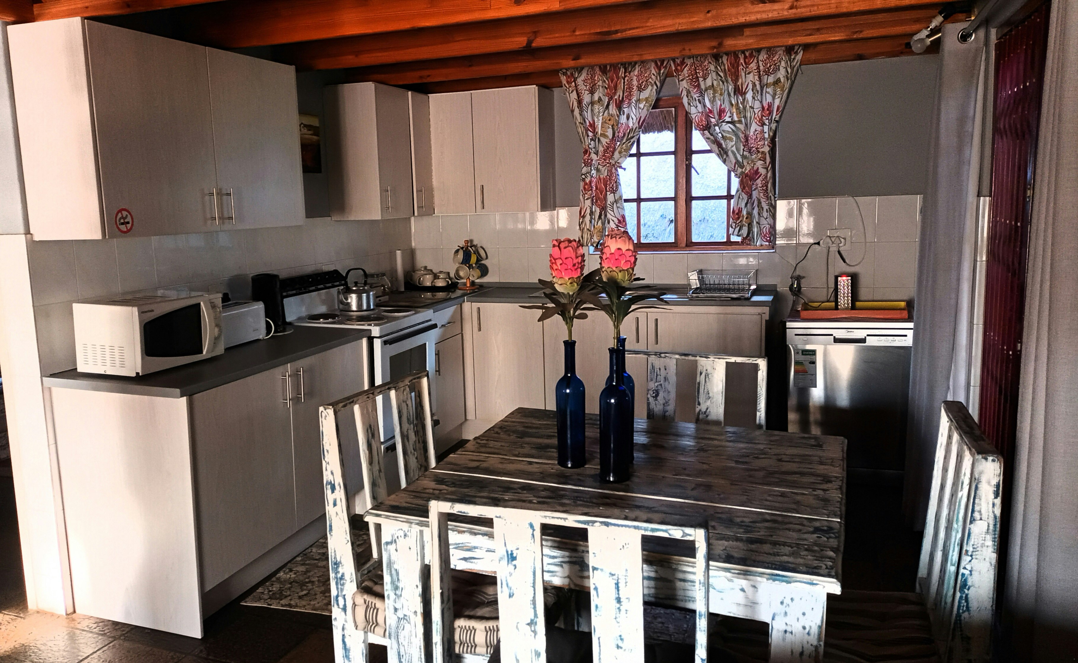 The kitchen contains a fridge-freezer, a microwave, a stove, an oven, crockery, and cutlery. The home leads out onto a large patio with outdoor seating and views over the Vaal River and garden. There are lock-up garages available for guests.