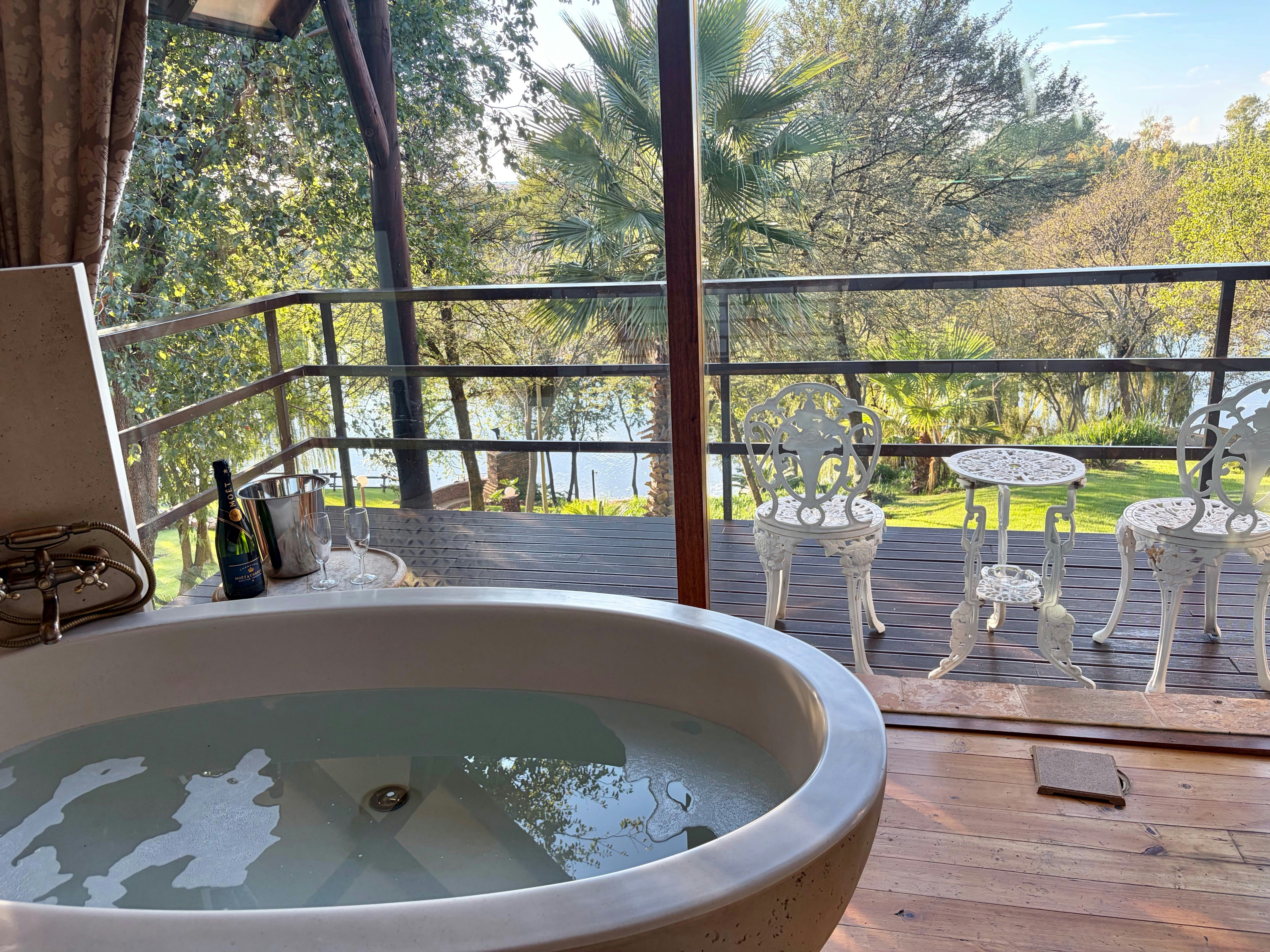 Outside, a true holiday experience awaits: a jacuzzi with river views, spacious balconies, braai facilities, and a boma/fire pit for cozy evenings under the stars. Direct river access via private steps makes it perfect for fishing, rowing, or simply enjoying nature.