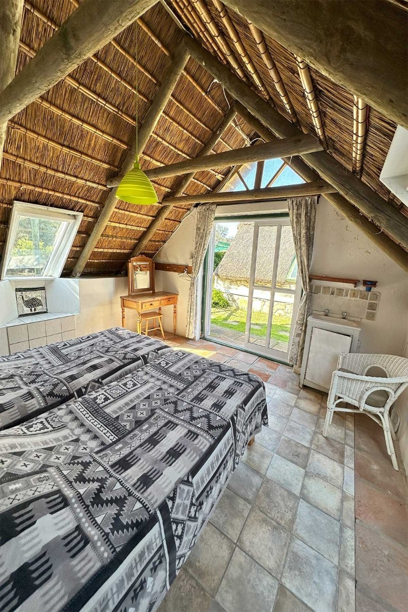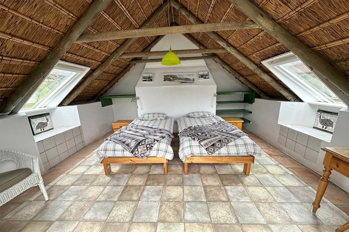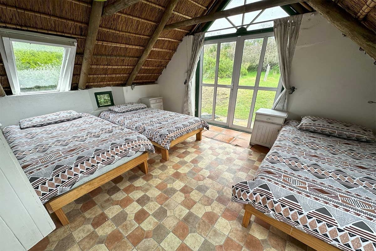 The cottage accommodates up to 12 guests across 5 bedrooms and 4 bathrooms, making it perfect for families or groups of friends. The main bedroom features a double bed and an en-suite bathroom fitted with a shower. The second bedroom also offers a double bed, while the fourth bedroom contains 2 single beds. The remaining 2 bedrooms each have 3 single beds, with one of these rooms also boasting an en-suite bathroom with a shower. Guests share a separate bathroom fitted with a bath and an outdoor shower. Wi-Fi is available for added convenience.