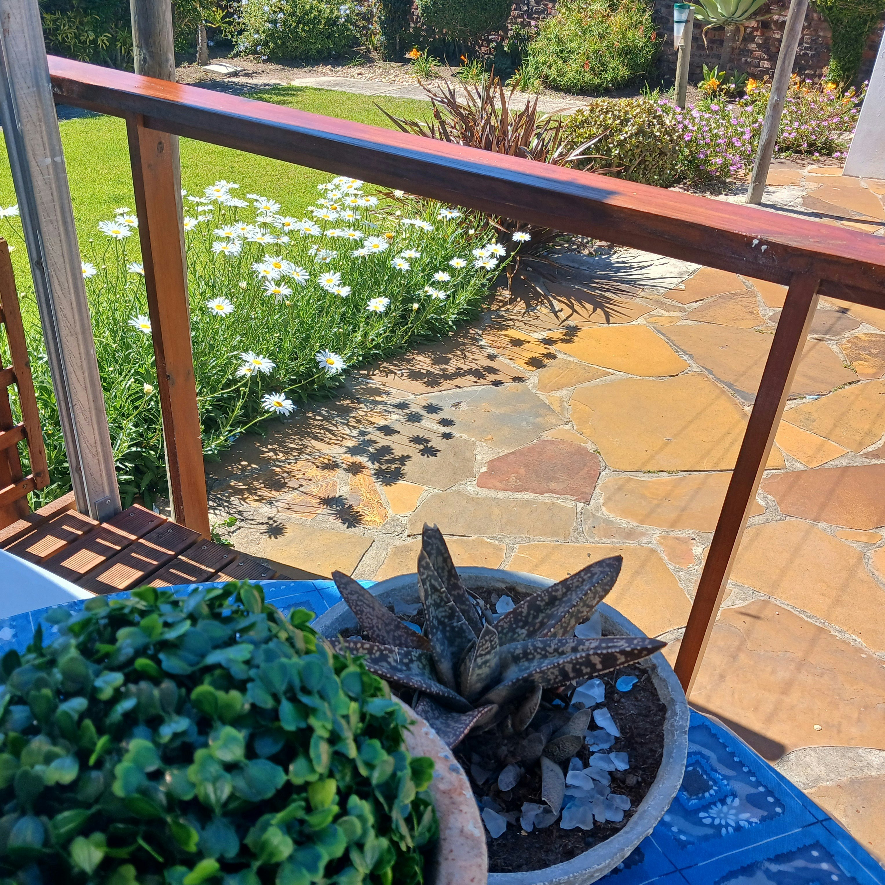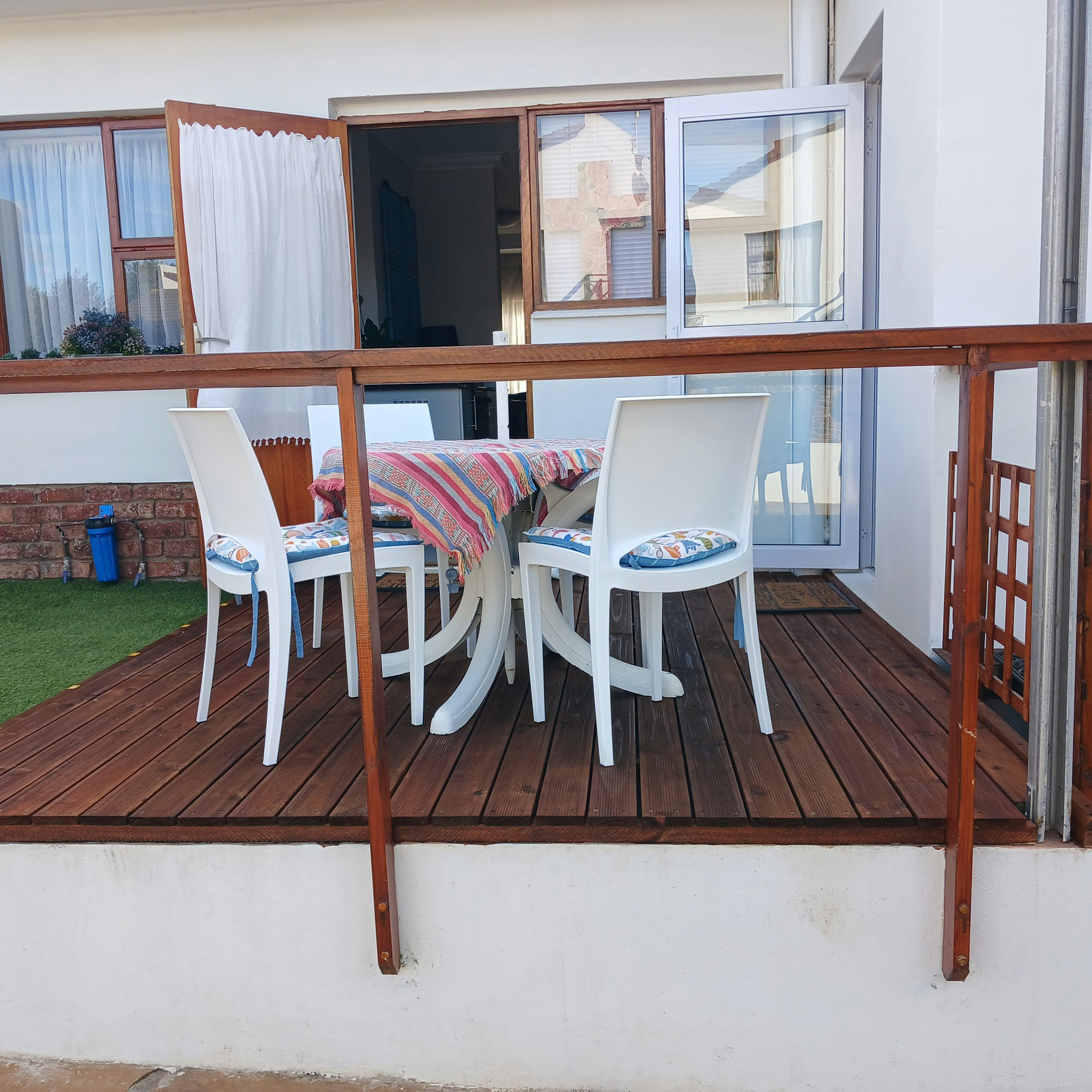 It walks out to a lovely patio with outdoor furniture and an outside braai. There is also a big, fenced lawn for small pets.