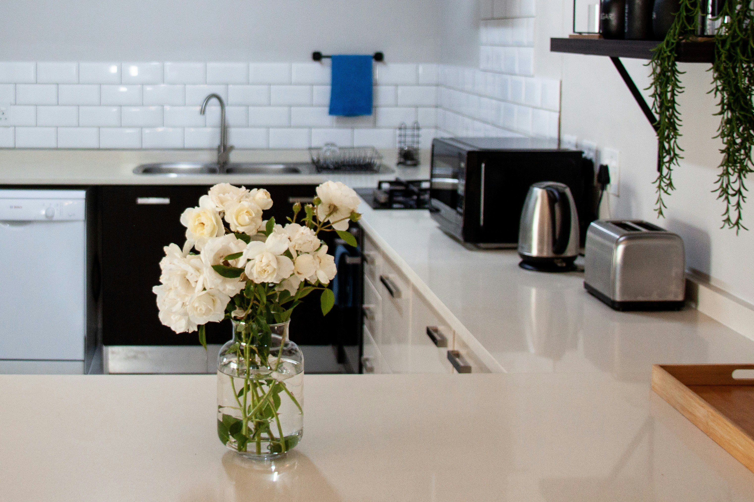 The cosy living area includes a modern kitchen equipped with a fridge-freezer, gas stove, electric oven, microwave, cutlery and crockery, tea- and coffee-making facilities, and a breakfast bar with stools. Adjacent to the kitchen, the lounge offers ample comfortable seating as well as a smart TV with streaming services and complimentary Wi-Fi access.
