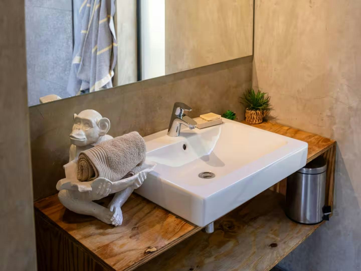 Below the wide deck overlooking the dam, there is a raised fire pit braai with chairs. There is a wood-fired hot tub on the other side of the deck, next to the dam. Guests can enjoy views across the Banhoek Valley and the swimming dam to the Drakenstein peaks beyond.