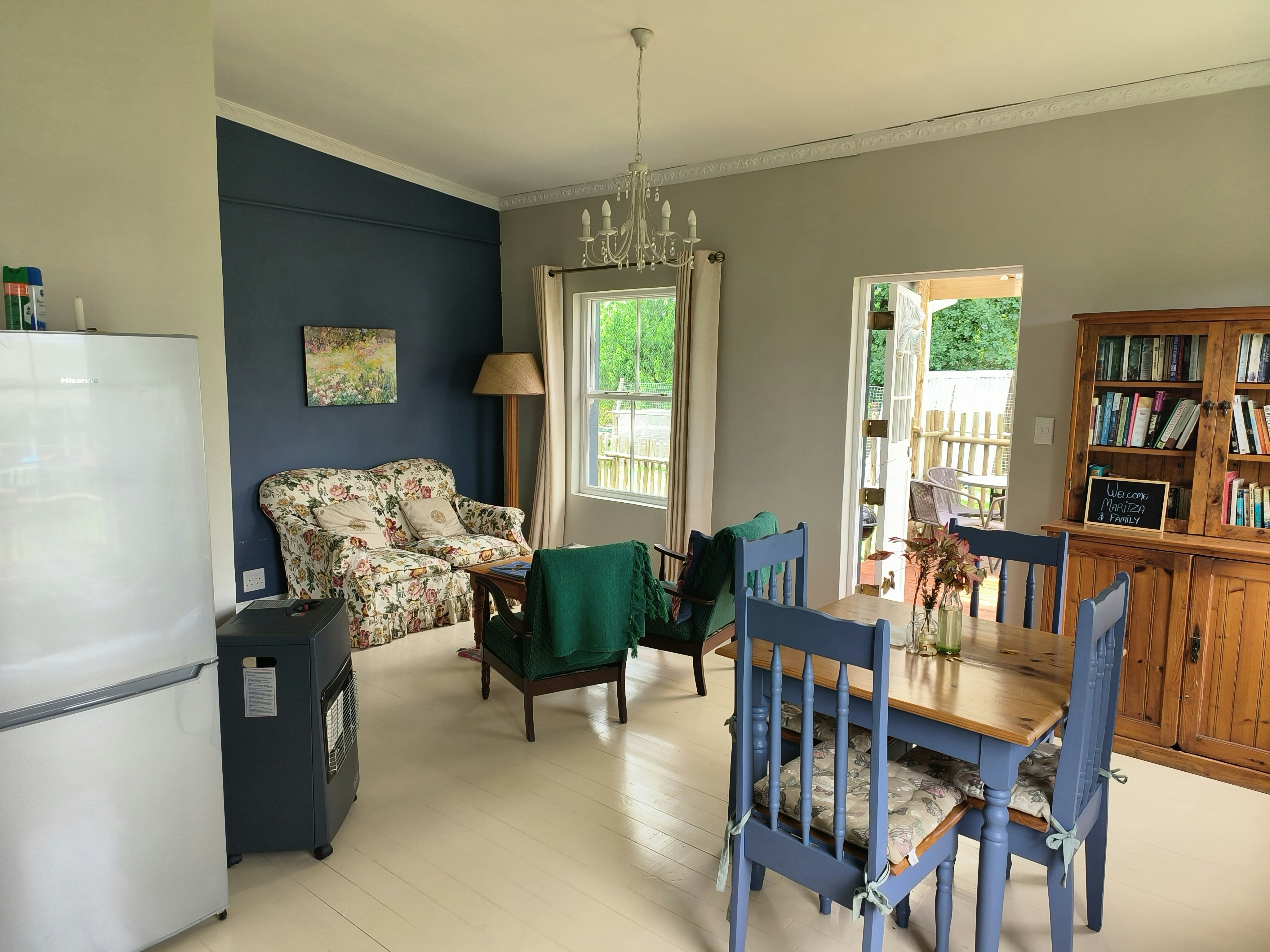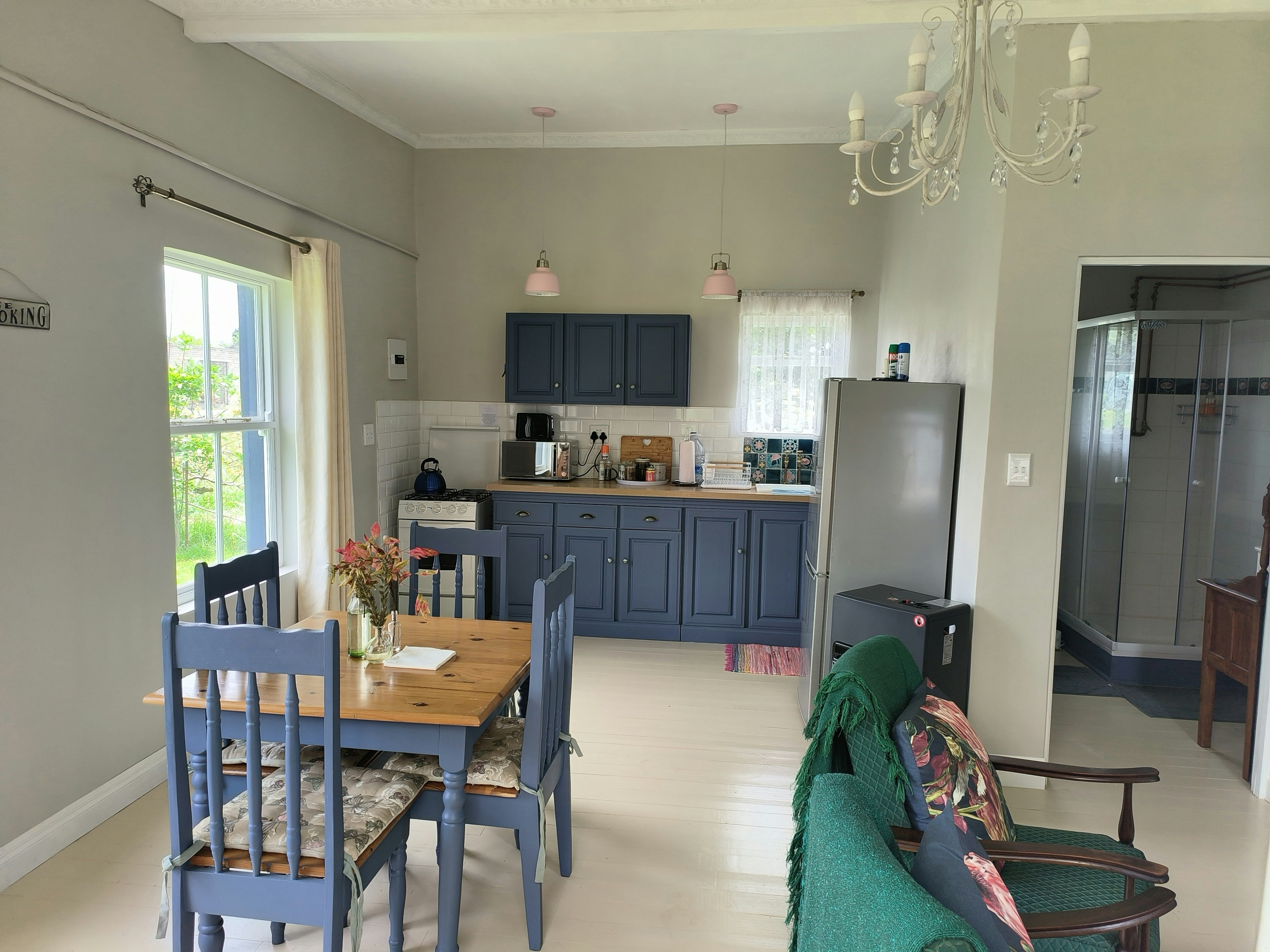 The kitchen is equipped with a fridge-freezer, gas stove, oven, microwave, cutlery and crockery, as well as tea- and coffee-making facilities. There’s a dining table with chairs and this area further extends into the living area which has a comfortable couch, 2 chairs and a gas heater.