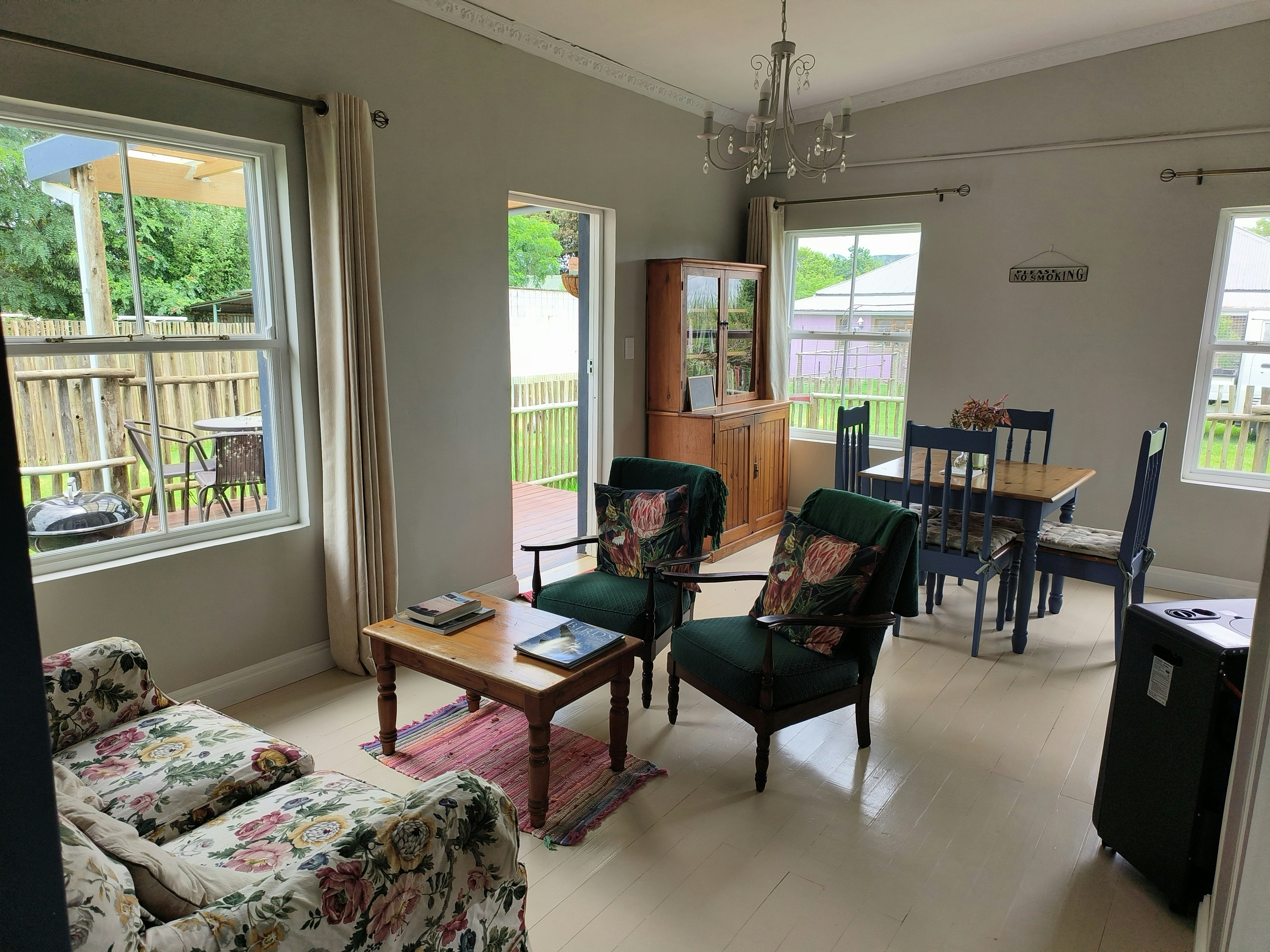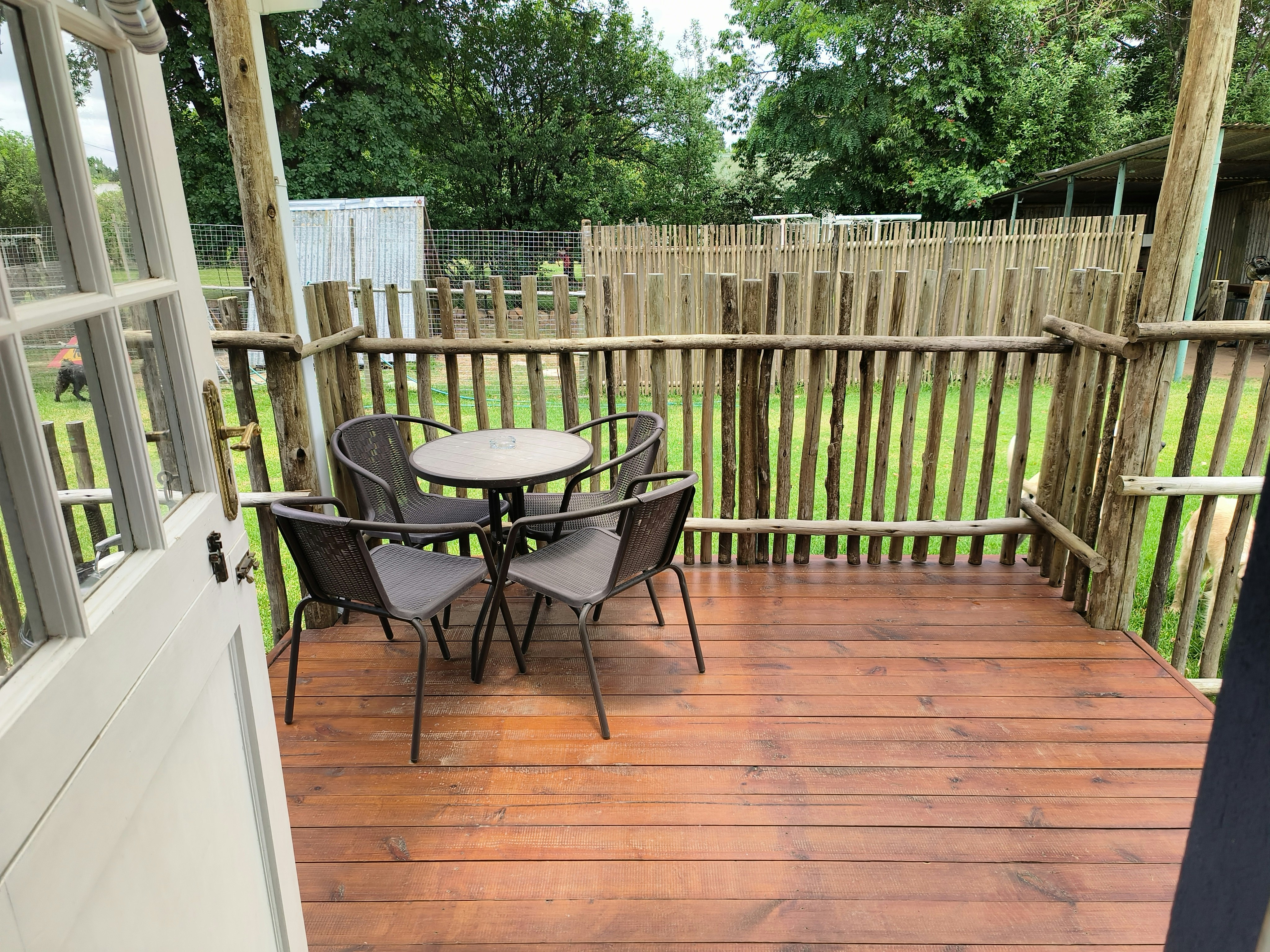 The lounge area leads out to the wooden deck with a Weber braai, where guests can enjoy the sights and sounds of the garden and the view of Ossewa Kop. Secure parking is available on the premises.
