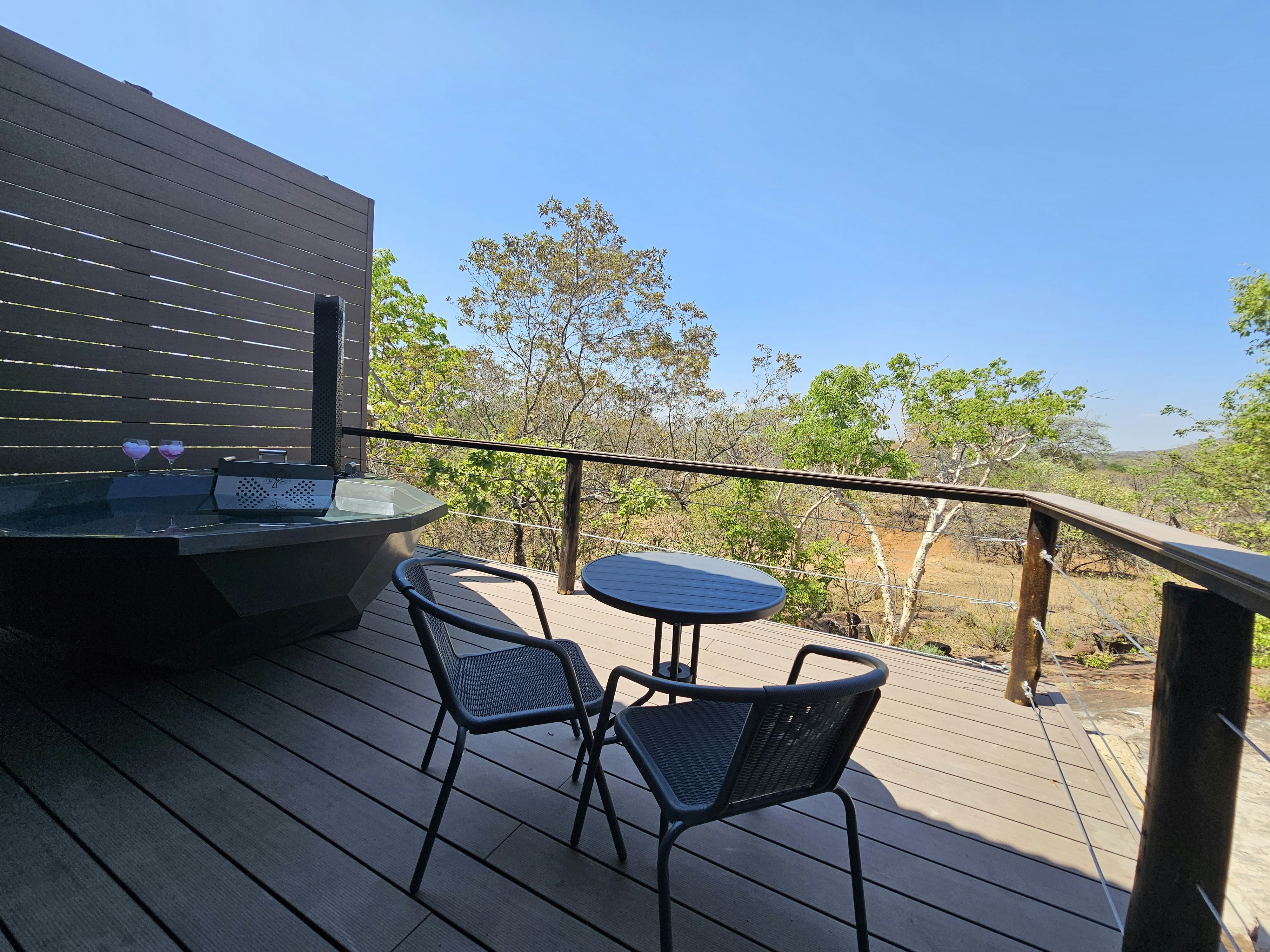 The kitchen is equipped with a gas stove, fridge-freezer and tea-and-coffee-making facilities. The living area has an indoor braai from which you can enjoy a lovely sunset. The unit is spoiled with its own wood-fired hot tub on the veranda and also features with DStv, Wi-Fi, air-conditioning and solar power. There is a communal pool for guests.