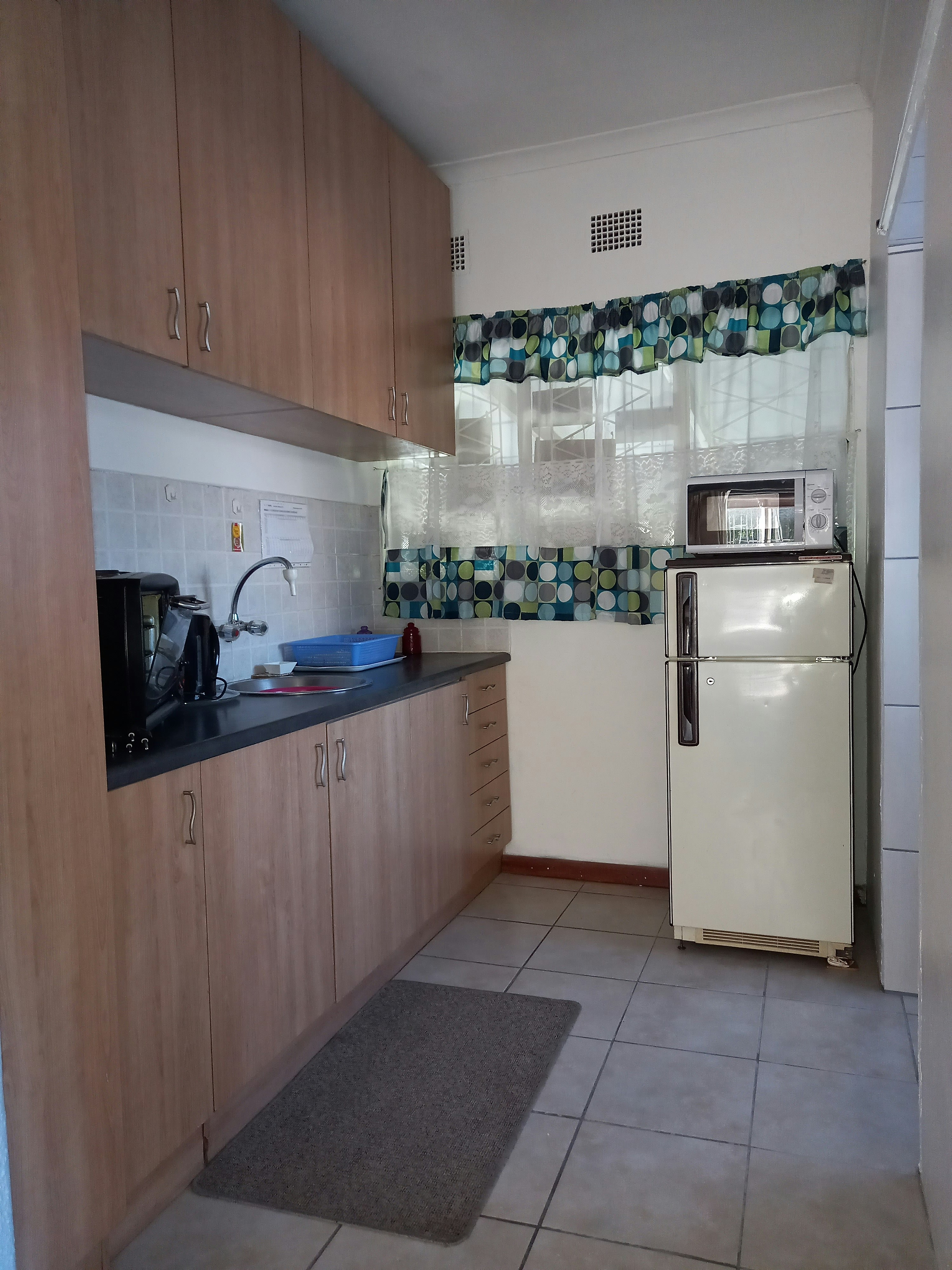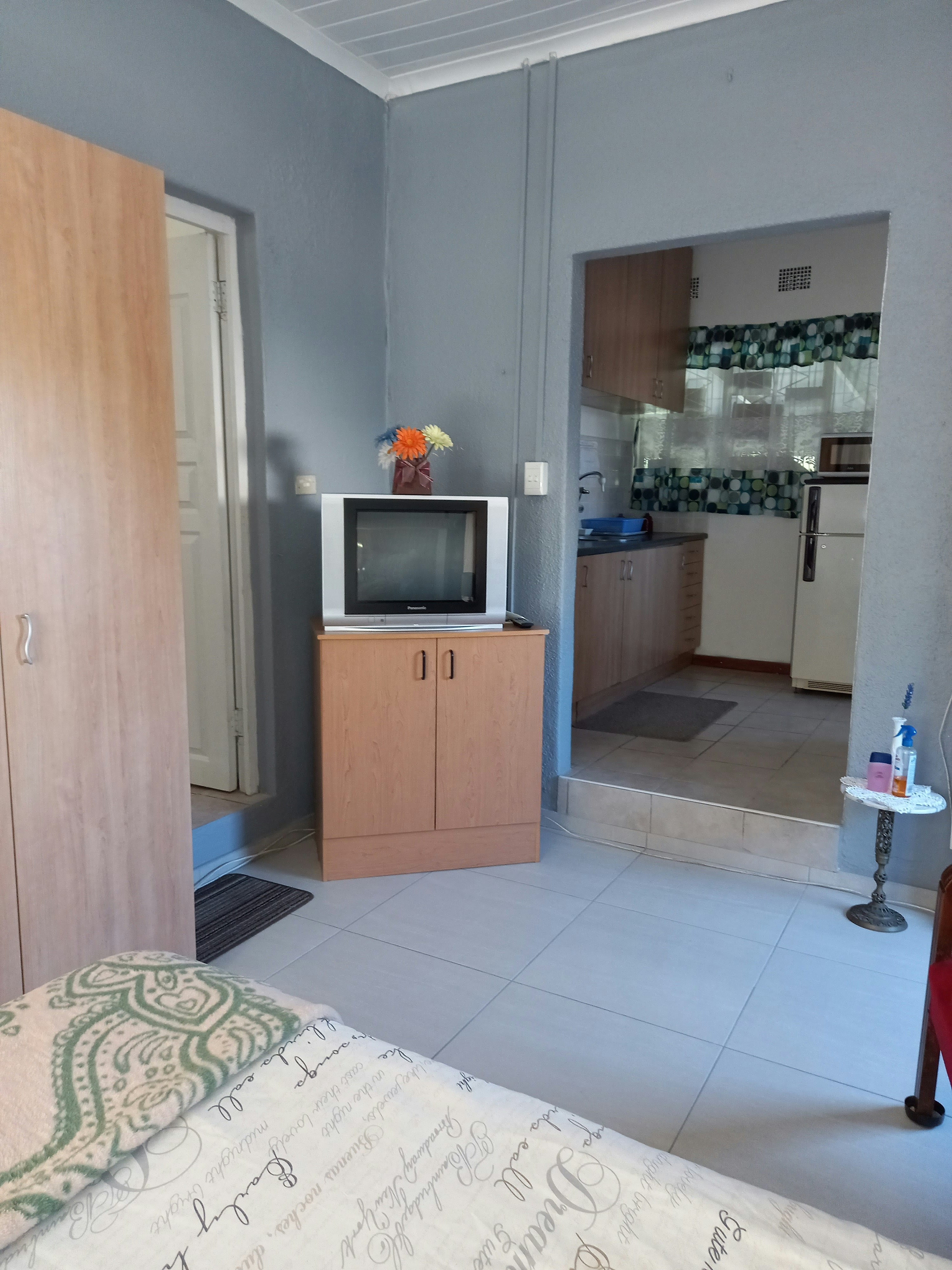 This studio apartment comprises an open-plan bedroom with a small lounge area and en-suite bathroom. The bedroom is furnished with a single bed and has a TV. DStv is shared with the main house. The bathroom has a shower, basin, and toilet. The open-plan kitchen contains a fridge-freezer, a microwave, 2-plate stove and mini-oven and crockery and cutlery.