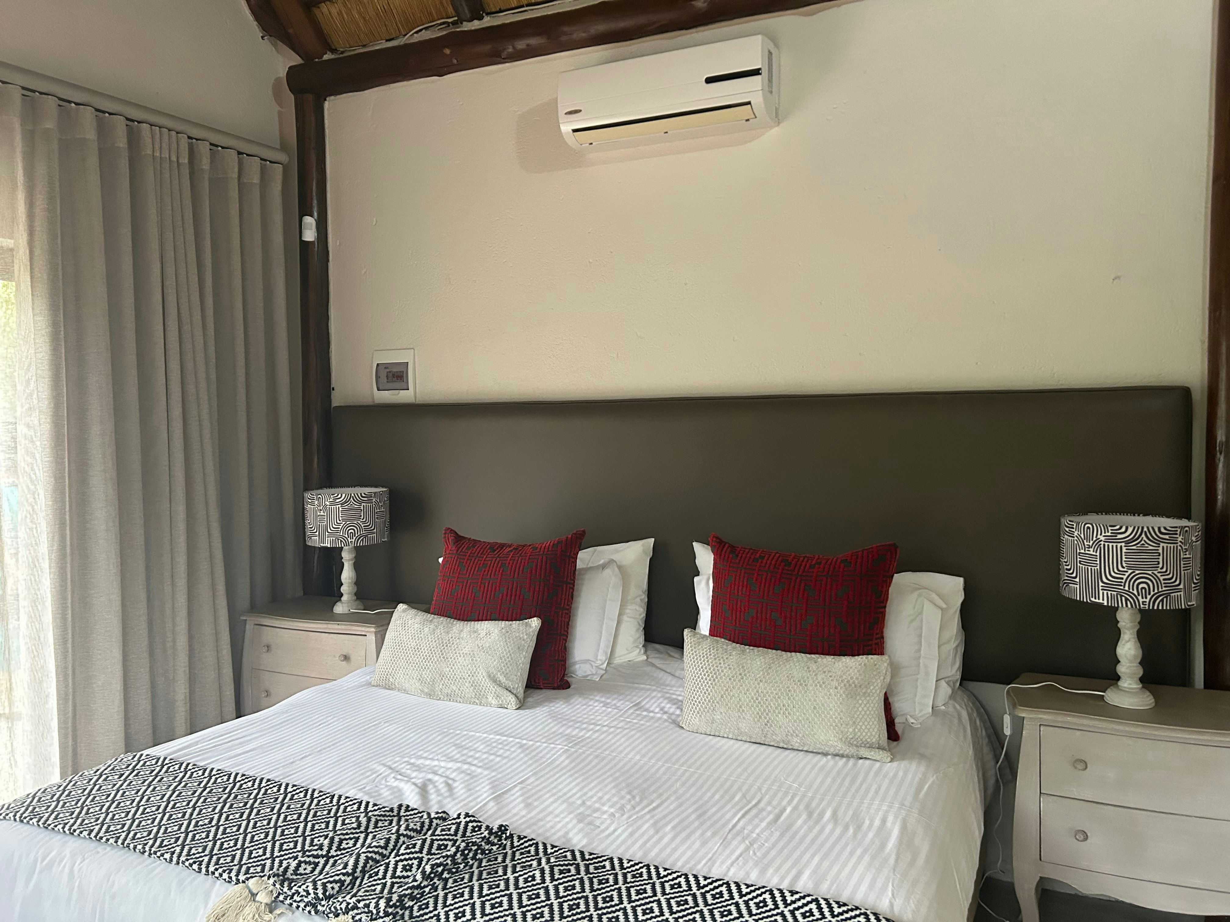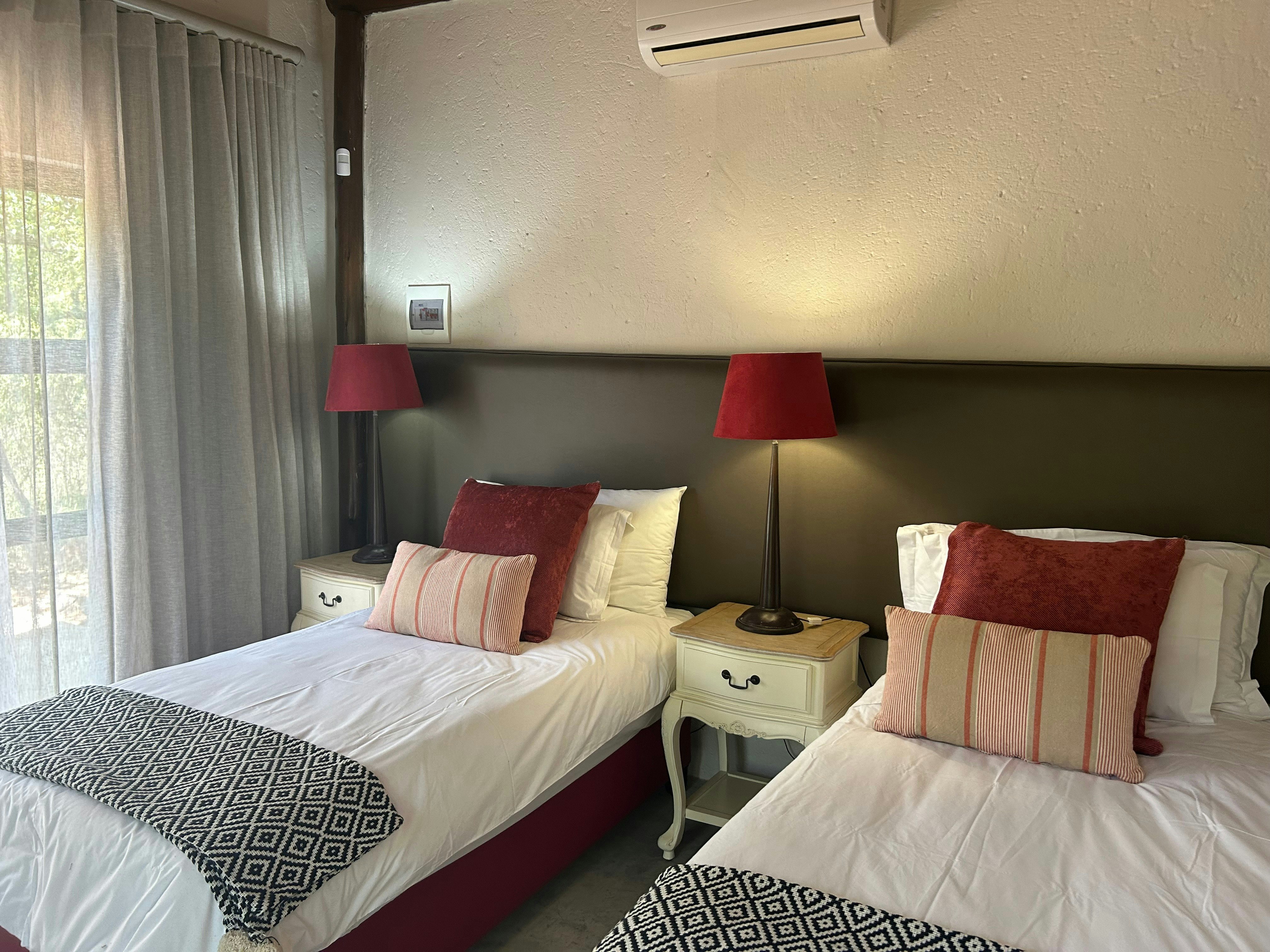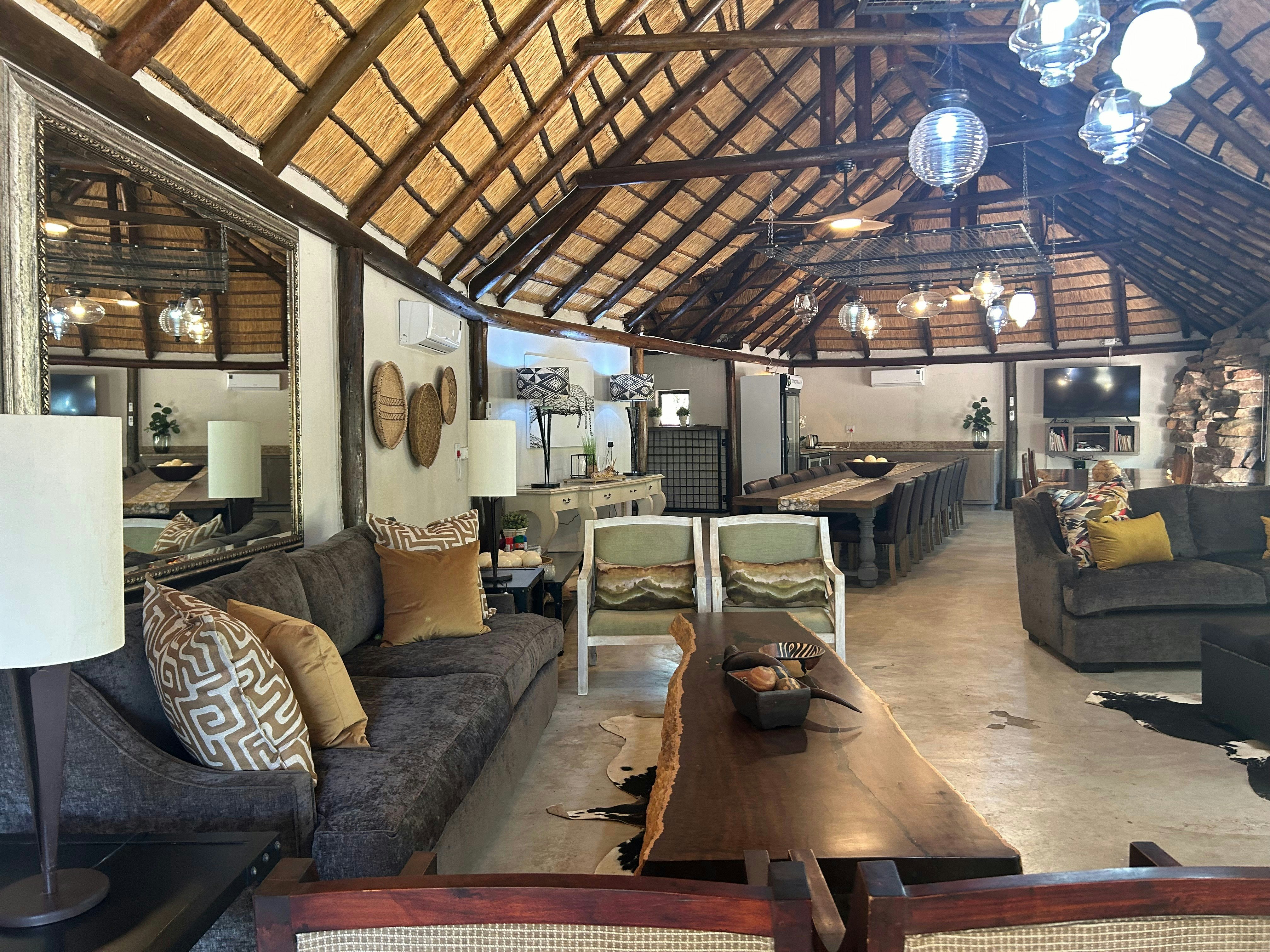 The lodge can accommodate up to 14 guests in 6 air-conditioned chalets, all with their own en-suite bathroom. Five of the chalets are furnished with a king-size bed that can be converted into 2 single beds and have an en-suite bathroom that is fitted with a shower, washbasin and toilet. The sixth chalet is a family unit and is furnished with a king-size bed and 2 single beds and the bathroom is fitted with a bath, shower, double washbasins and a toilet. All 6 chalets are equipped with tea- and coffee-making facilities, and have their own patio with seating. Quality linen and towels are provided.