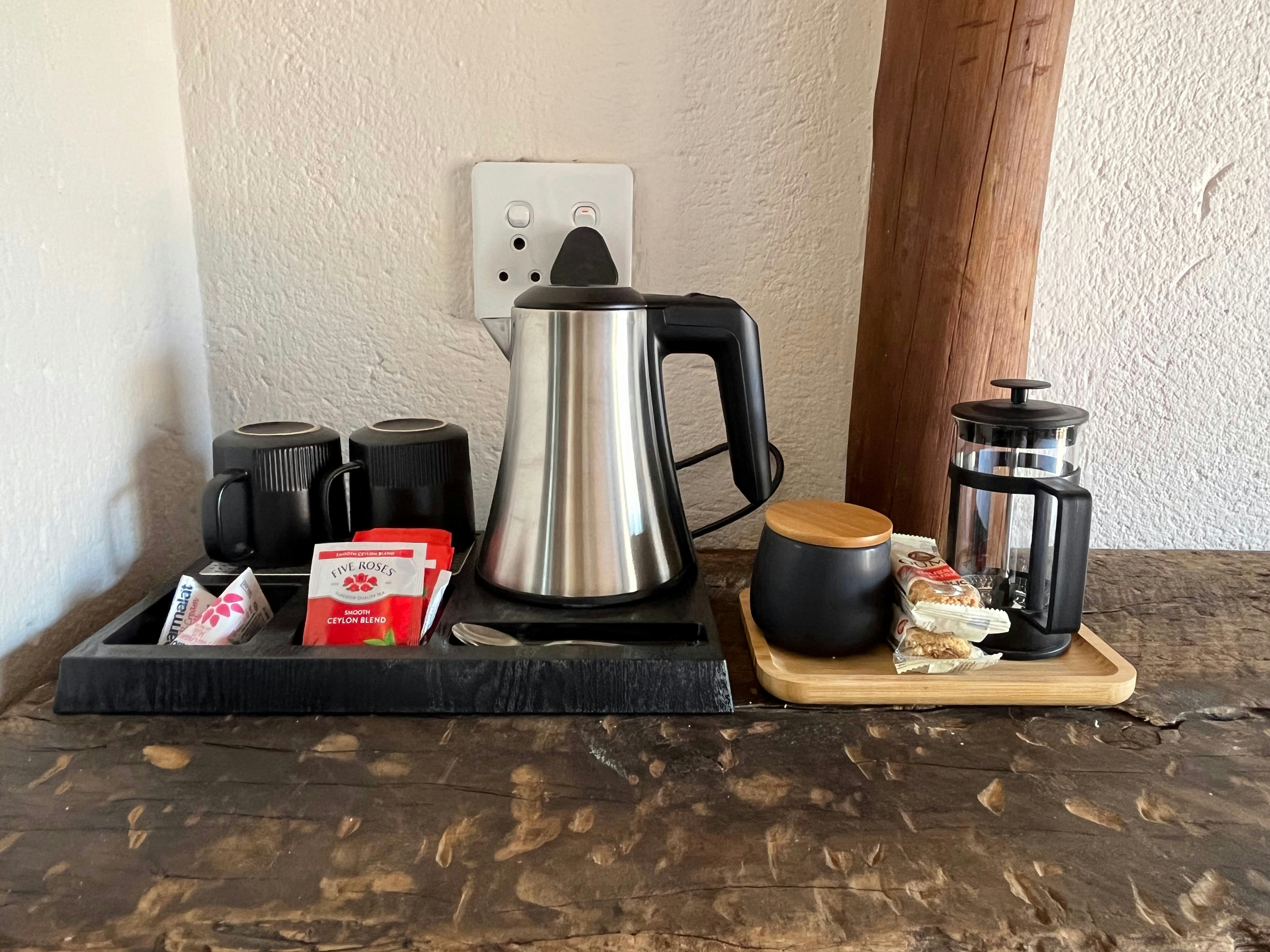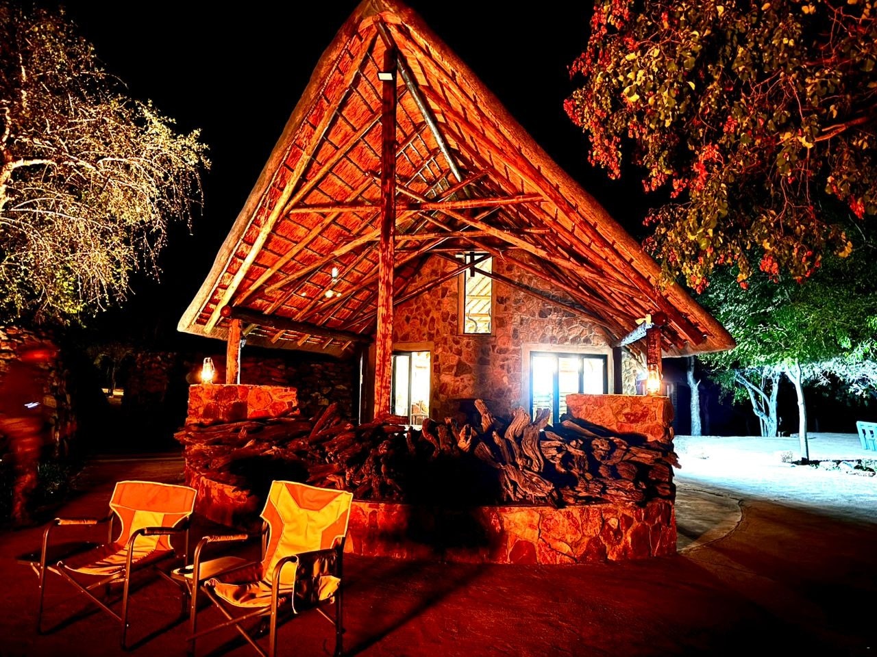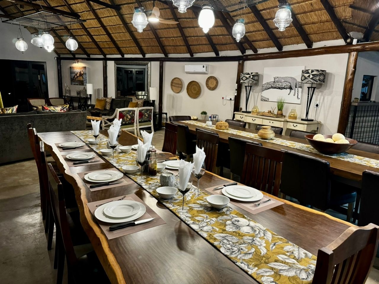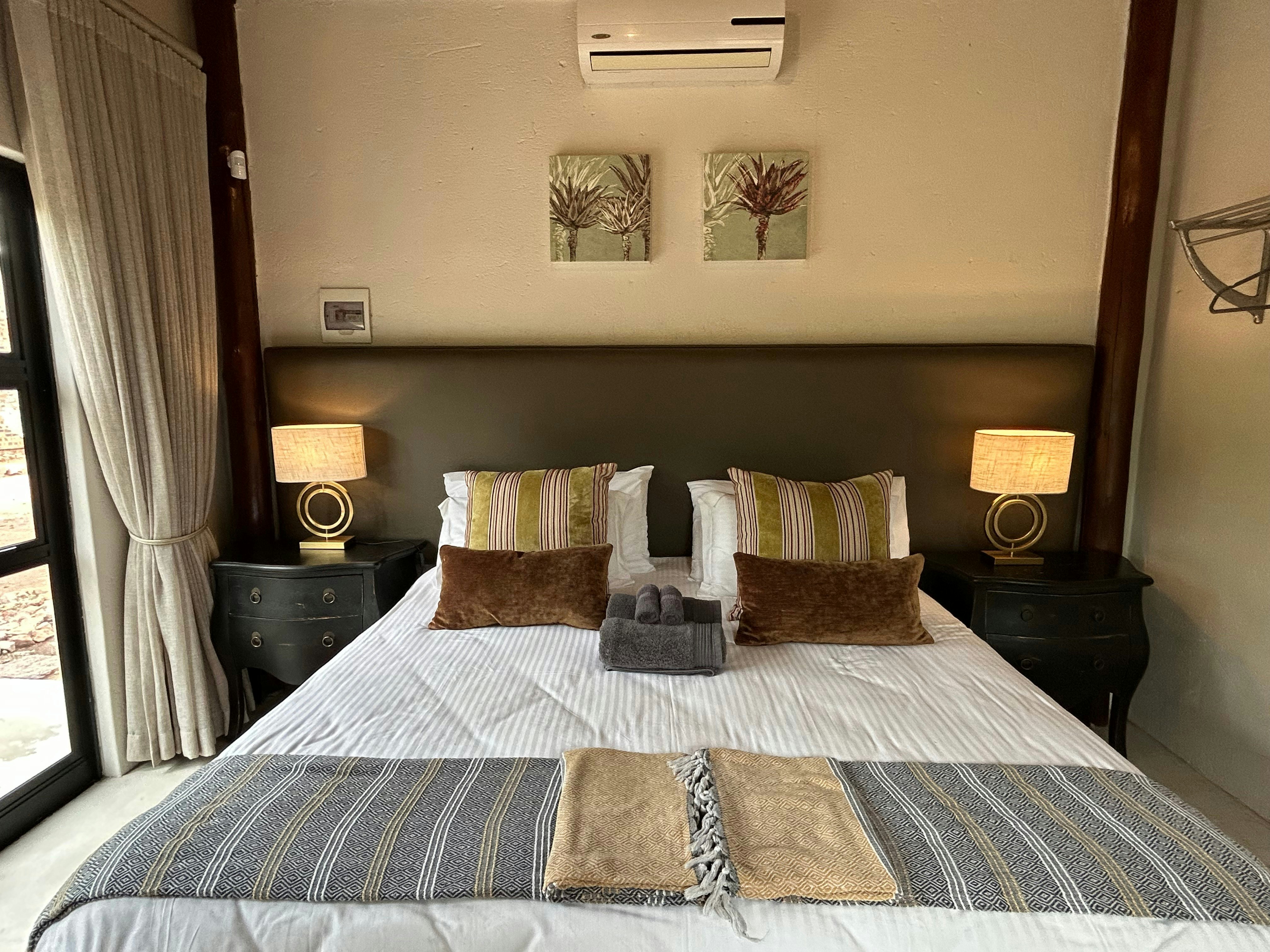 The lodge can accommodate up to 14 guests in 6 air-conditioned chalets, all with their own en-suite bathroom. Five of the chalets are furnished with a king-size bed that can be converted into 2 single beds and have an en-suite bathroom that is fitted with a shower, washbasin and toilet. The sixth chalet is a family unit and is furnished with a king-size bed and 2 single beds and the bathroom is fitted with a bath, shower, double washbasins and a toilet. All 6 chalets are equipped with tea- and coffee-making facilities, and have their own patio with seating. Quality linen and towels are provided.