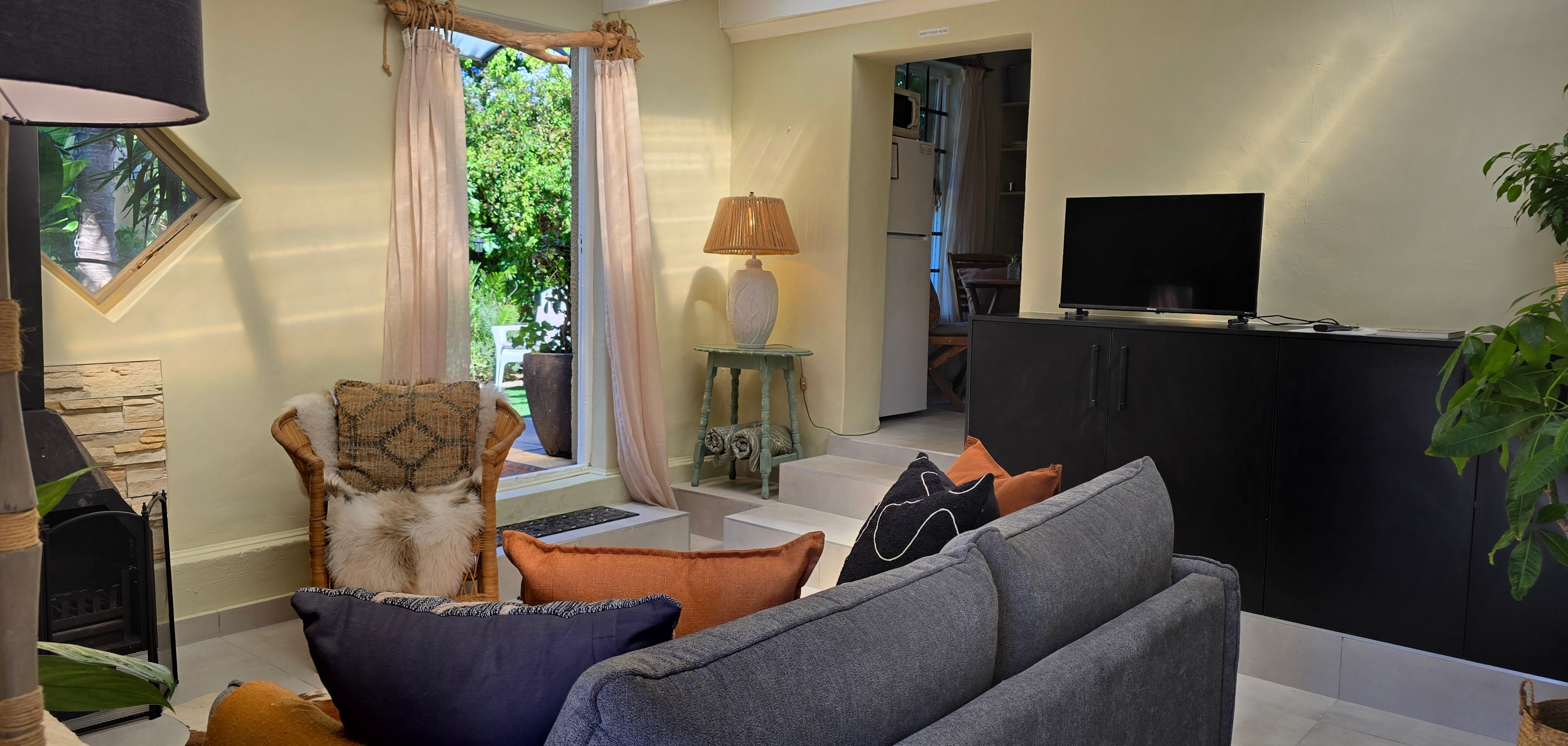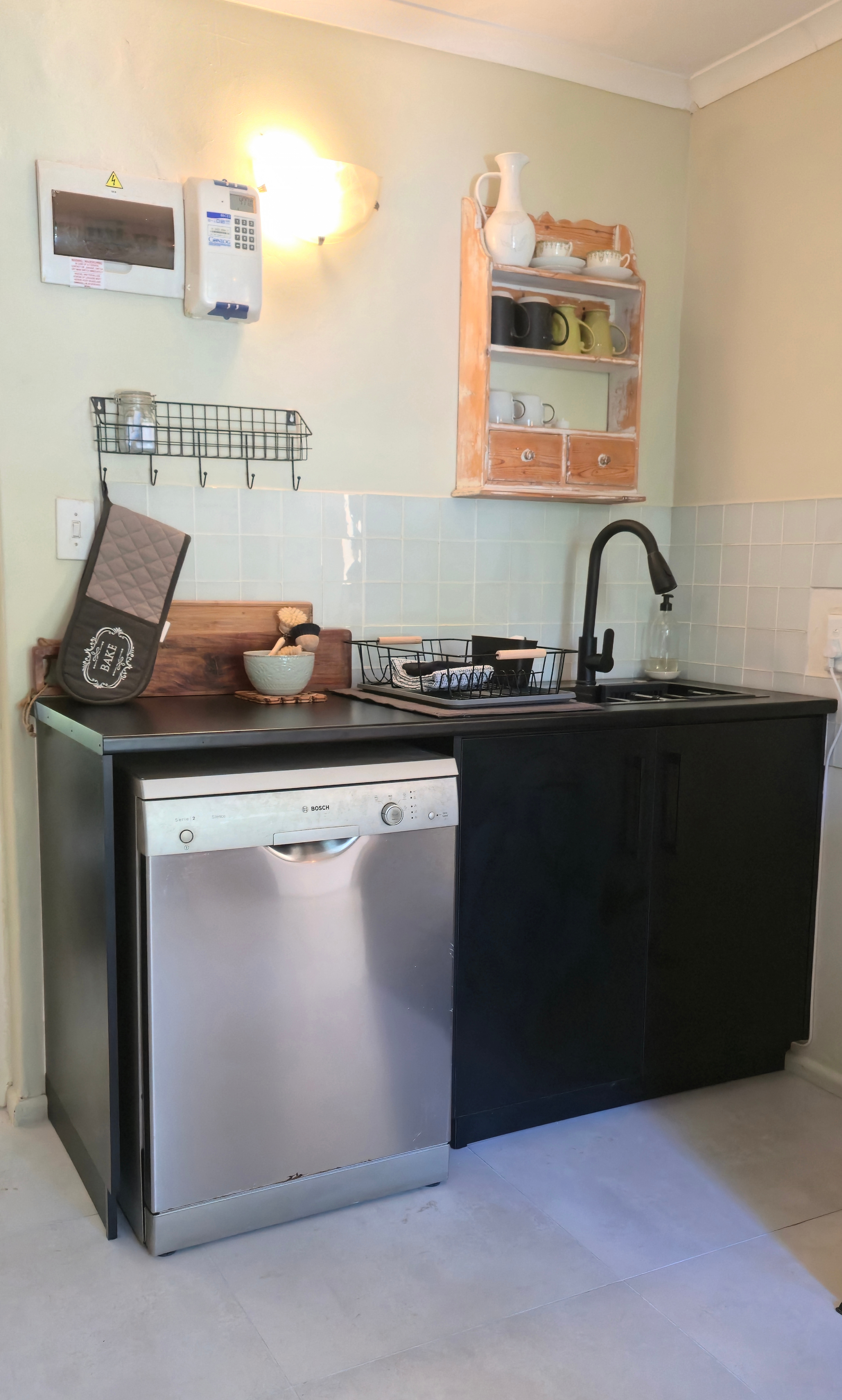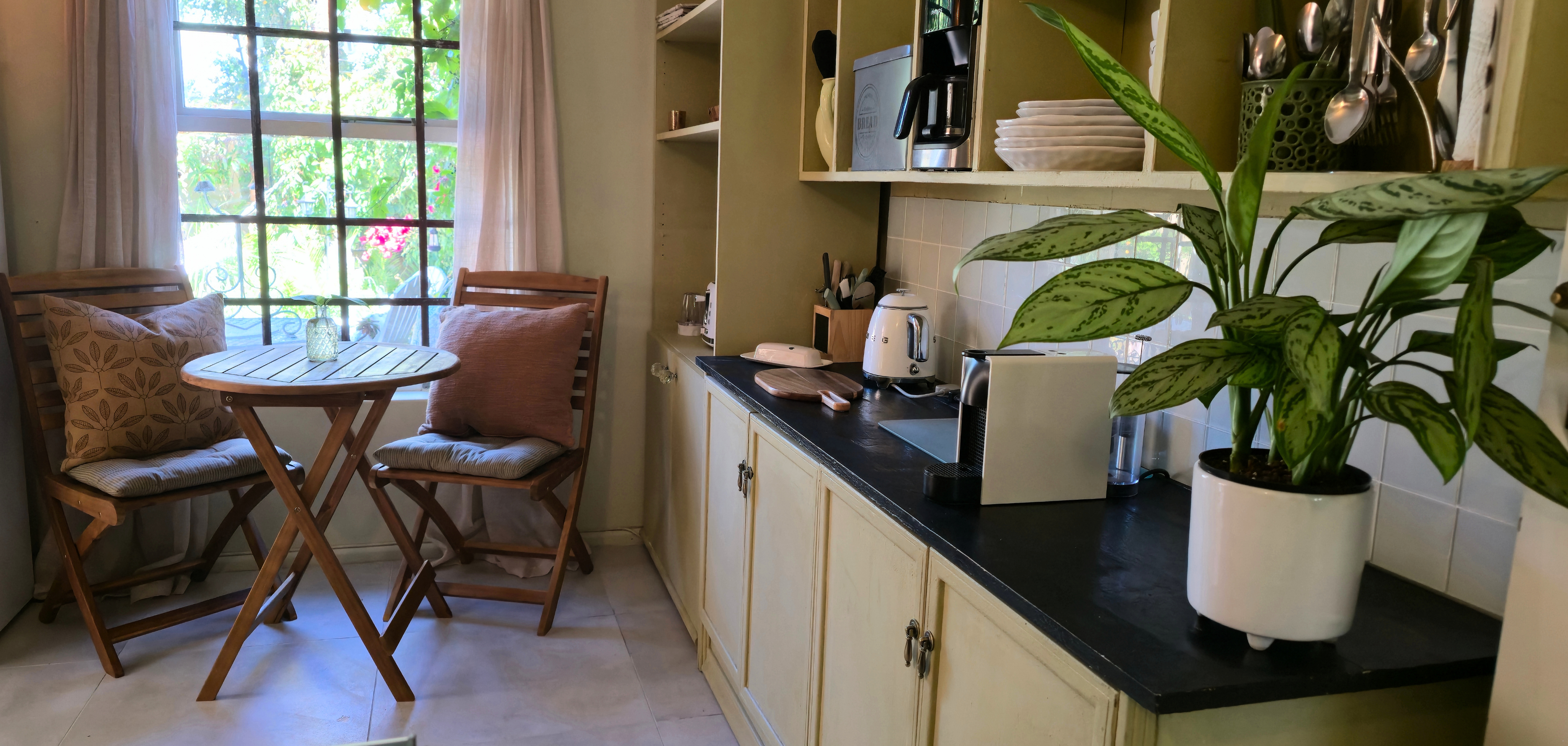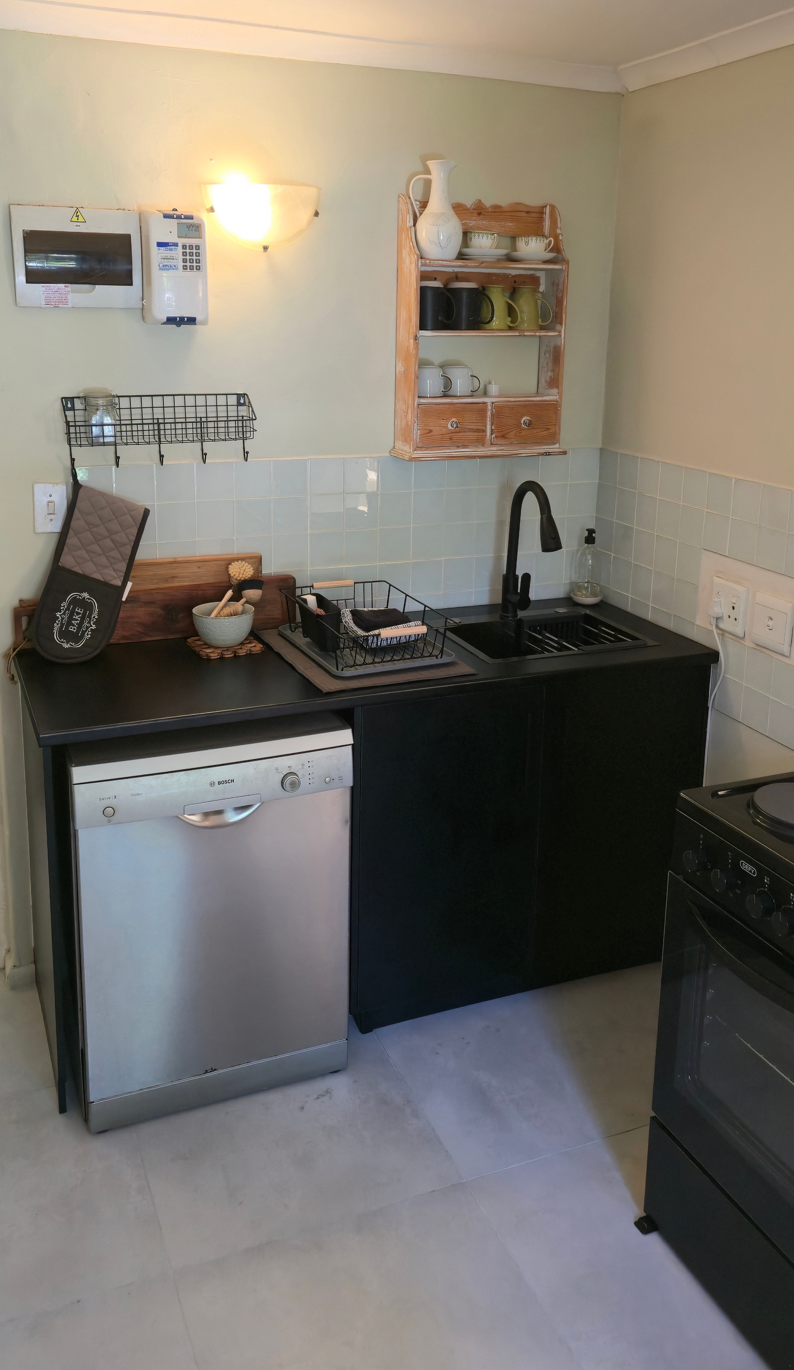 The kitchen is fully equipped with a stove, oven, microwave, fridge-freezer, air fryer, dishwasher, Nespresso coffee machine, 7 litres of drinking water, tea and coffee-making facilities, cutlery, and crockery. The living area is furnished with a comfortable couch, a fireplace, and a smart TV, while the dining area offers seating for 2. Fast Free Wi-Fi is available. The cottage also has an air-conditioner and an outdoor hammock in the garden. It uses borehole water, and guests are advised to bring extra drinking water in case of power outages.