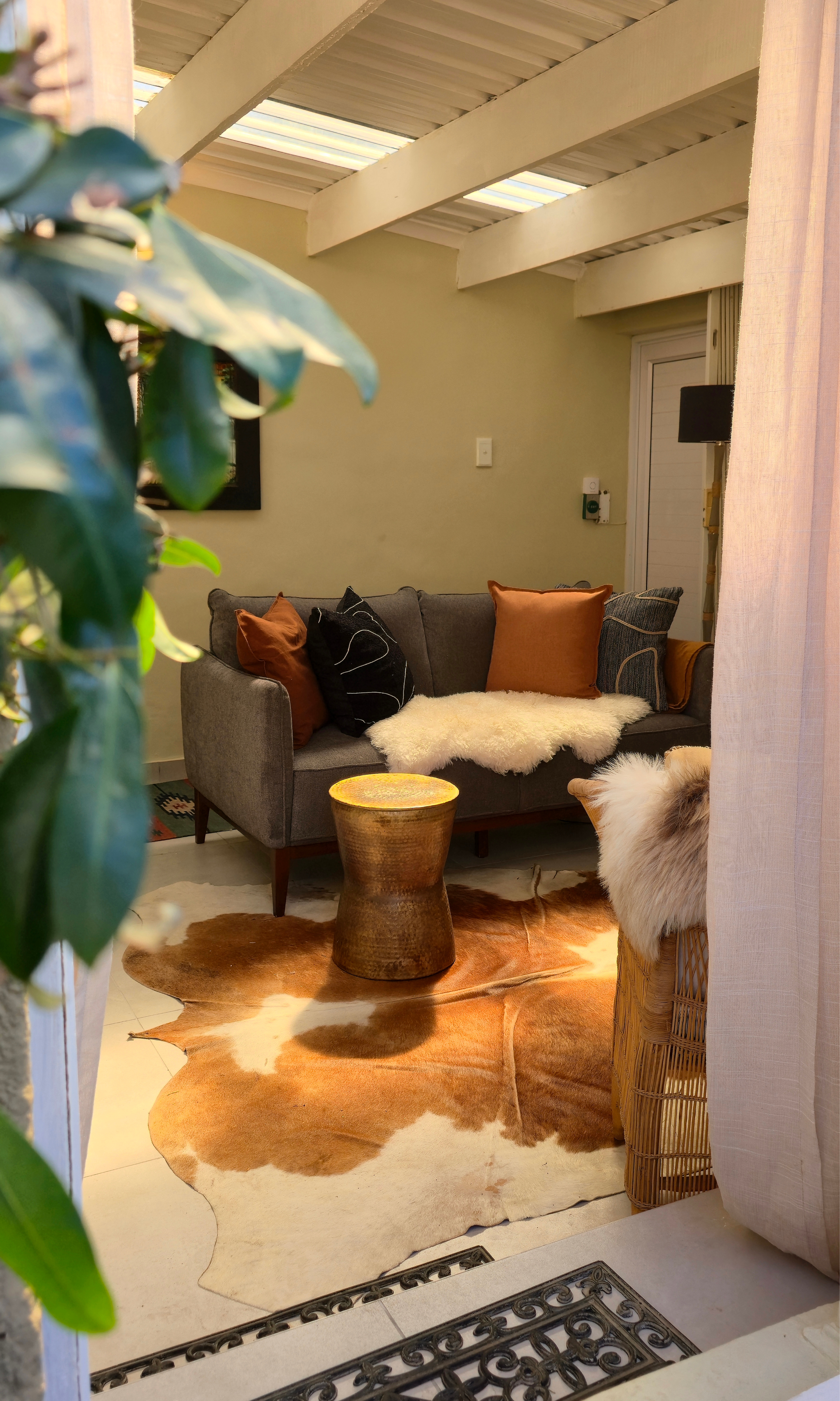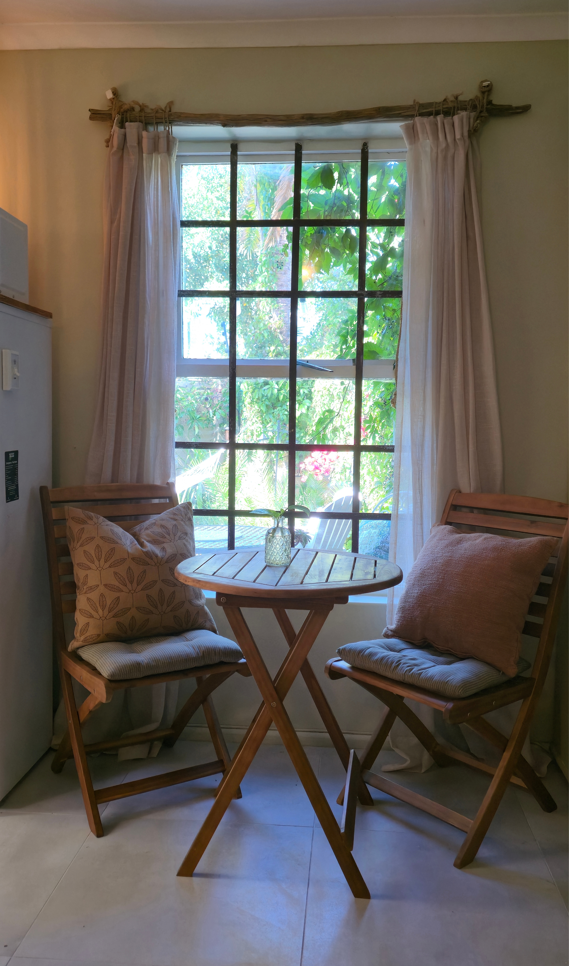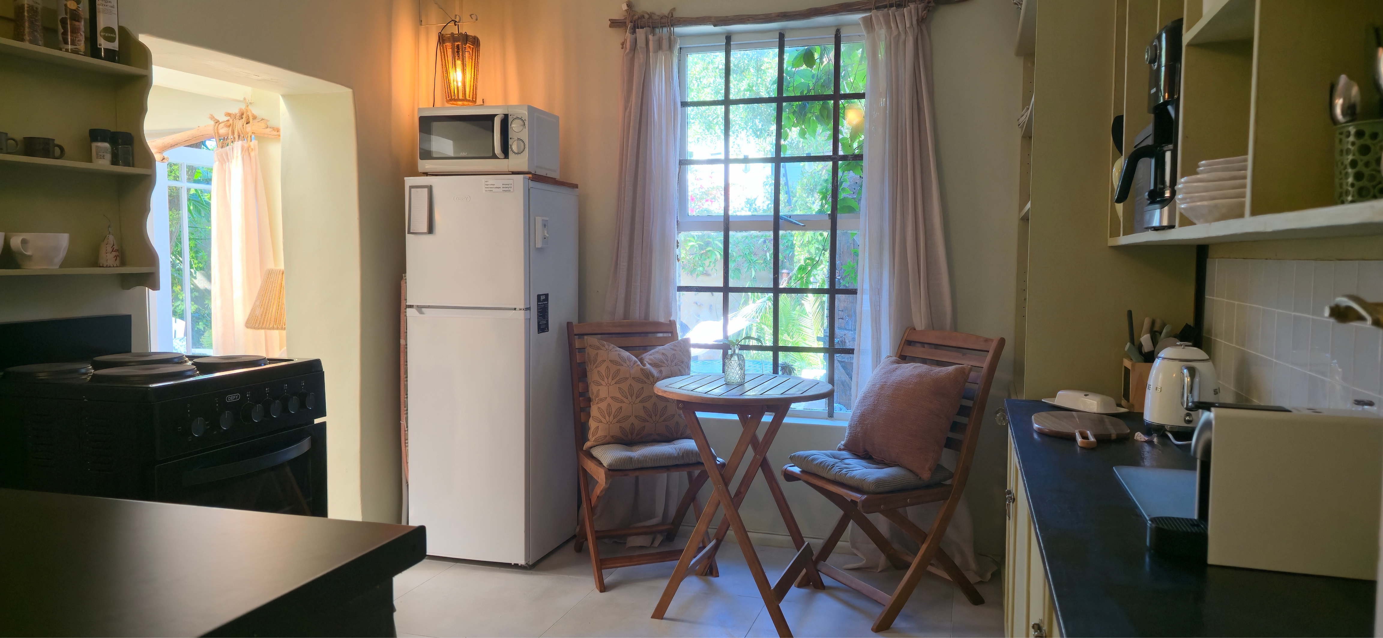 The kitchen is fully equipped with a stove, oven, microwave, fridge-freezer, air fryer, dishwasher, Nespresso coffee machine, 7 litres of drinking water, tea and coffee-making facilities, cutlery, and crockery. The living area is furnished with a comfortable couch, a fireplace, and a smart TV, while the dining area offers seating for 2. Fast Free Wi-Fi is available. The cottage also has an air-conditioner and an outdoor hammock in the garden. It uses borehole water, and guests are advised to bring extra drinking water in case of power outages.