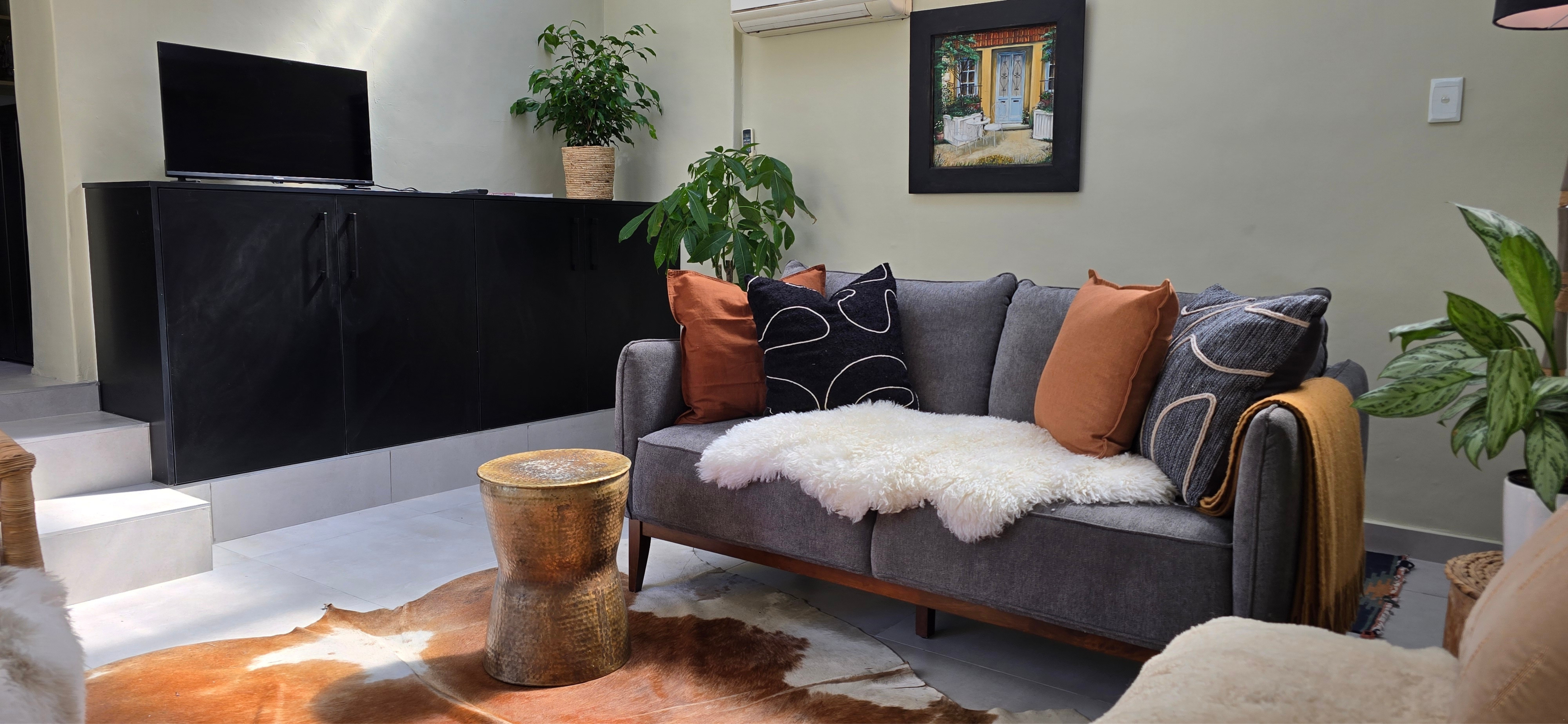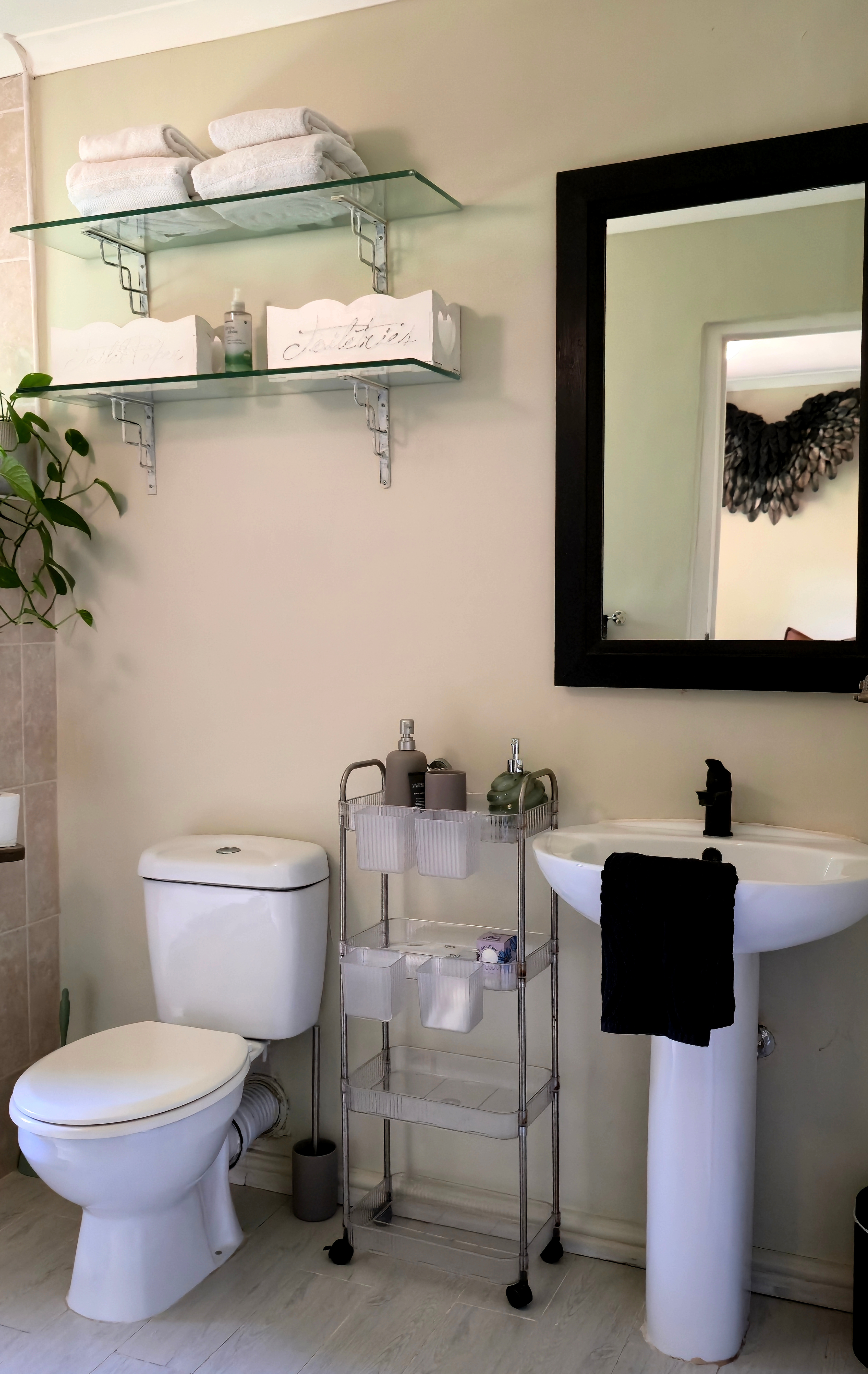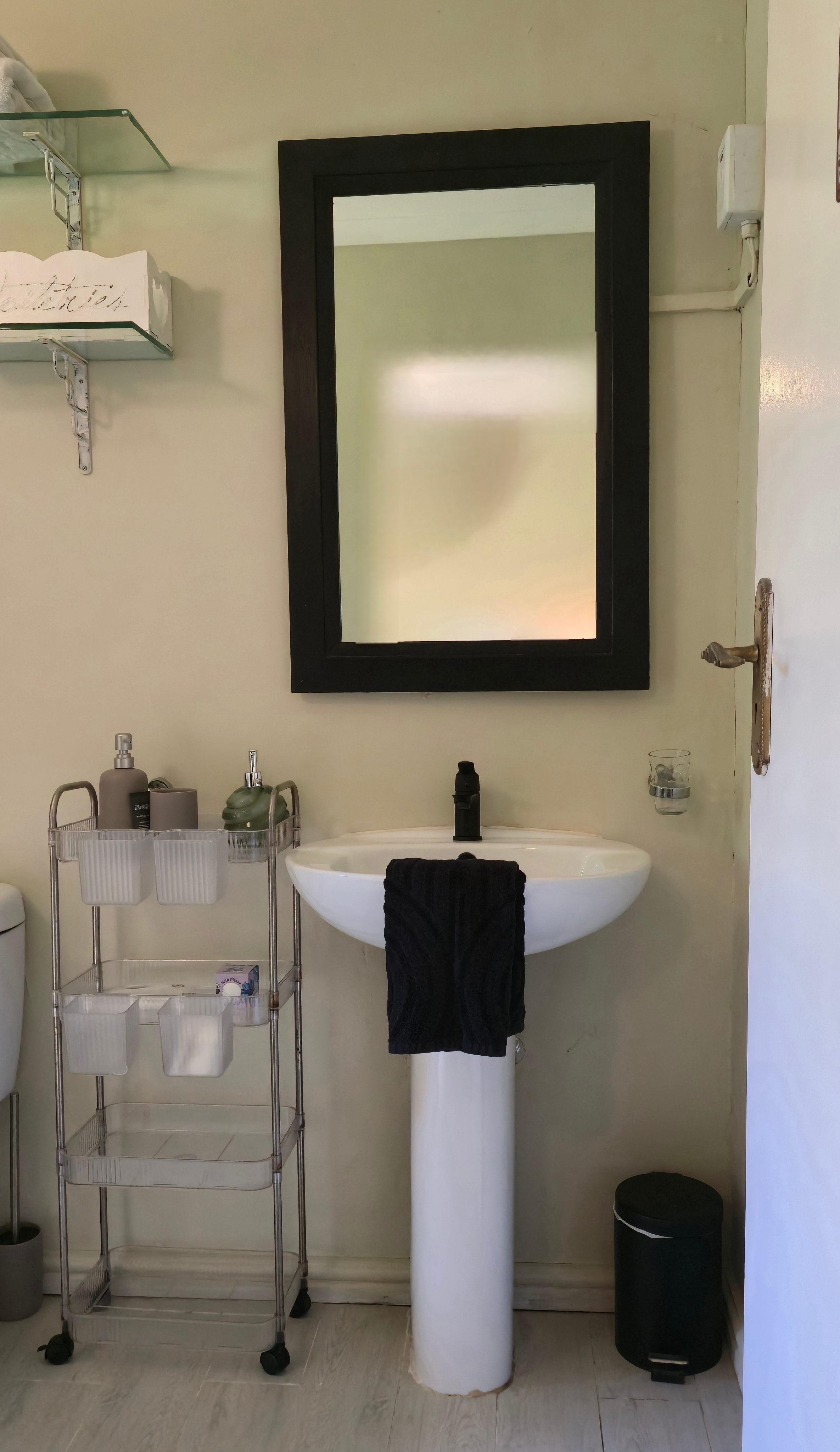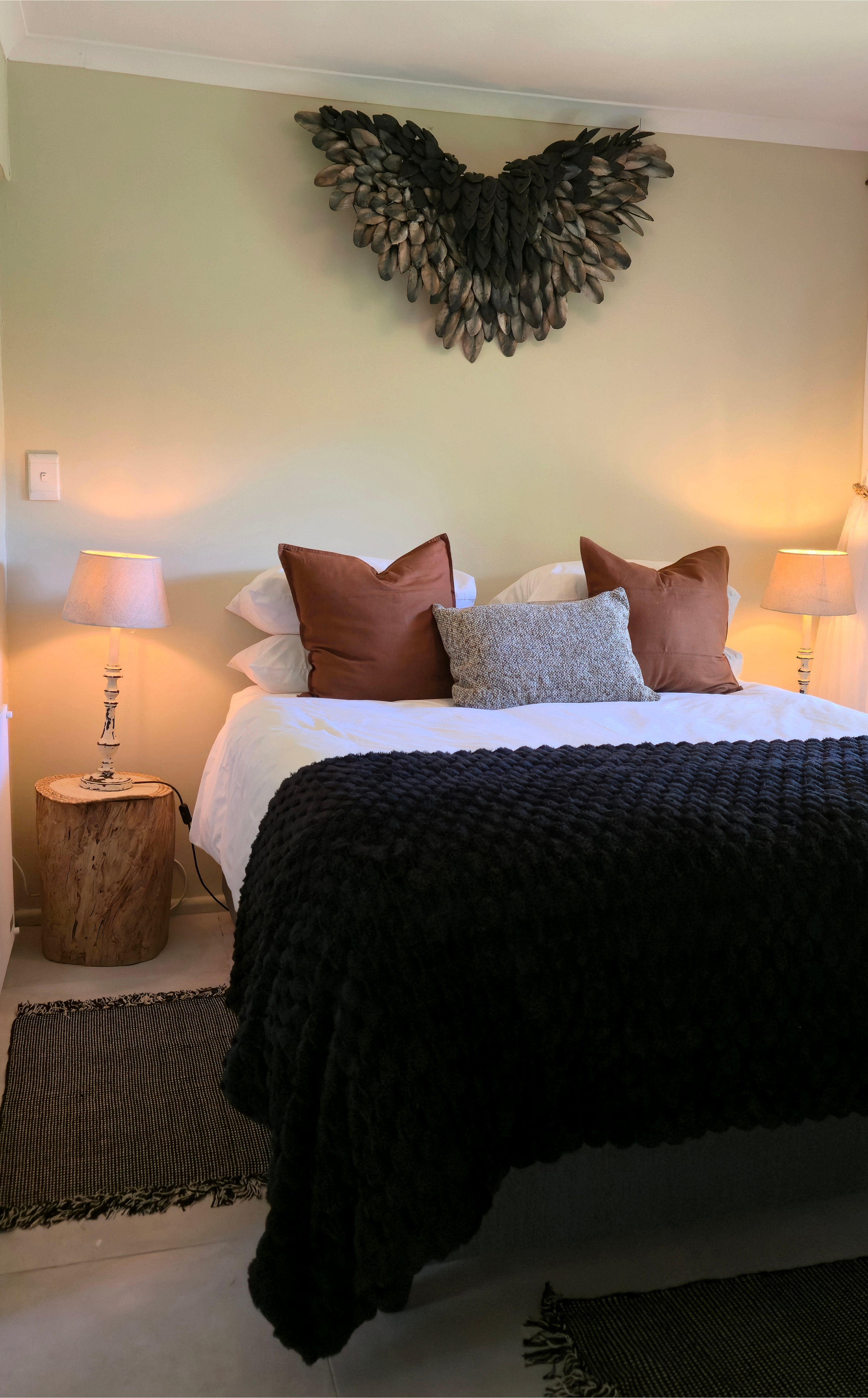 The kitchen is fully equipped with a stove, oven, microwave, fridge-freezer, air fryer, dishwasher, Nespresso coffee machine, 7 litres of drinking water, tea and coffee-making facilities, cutlery, and crockery. The living area is furnished with a comfortable couch, a fireplace, and a smart TV, while the dining area offers seating for 2. Fast Free Wi-Fi is available. The cottage also has an air-conditioner and an outdoor hammock in the garden. It uses borehole water, and guests are advised to bring extra drinking water in case of power outages.