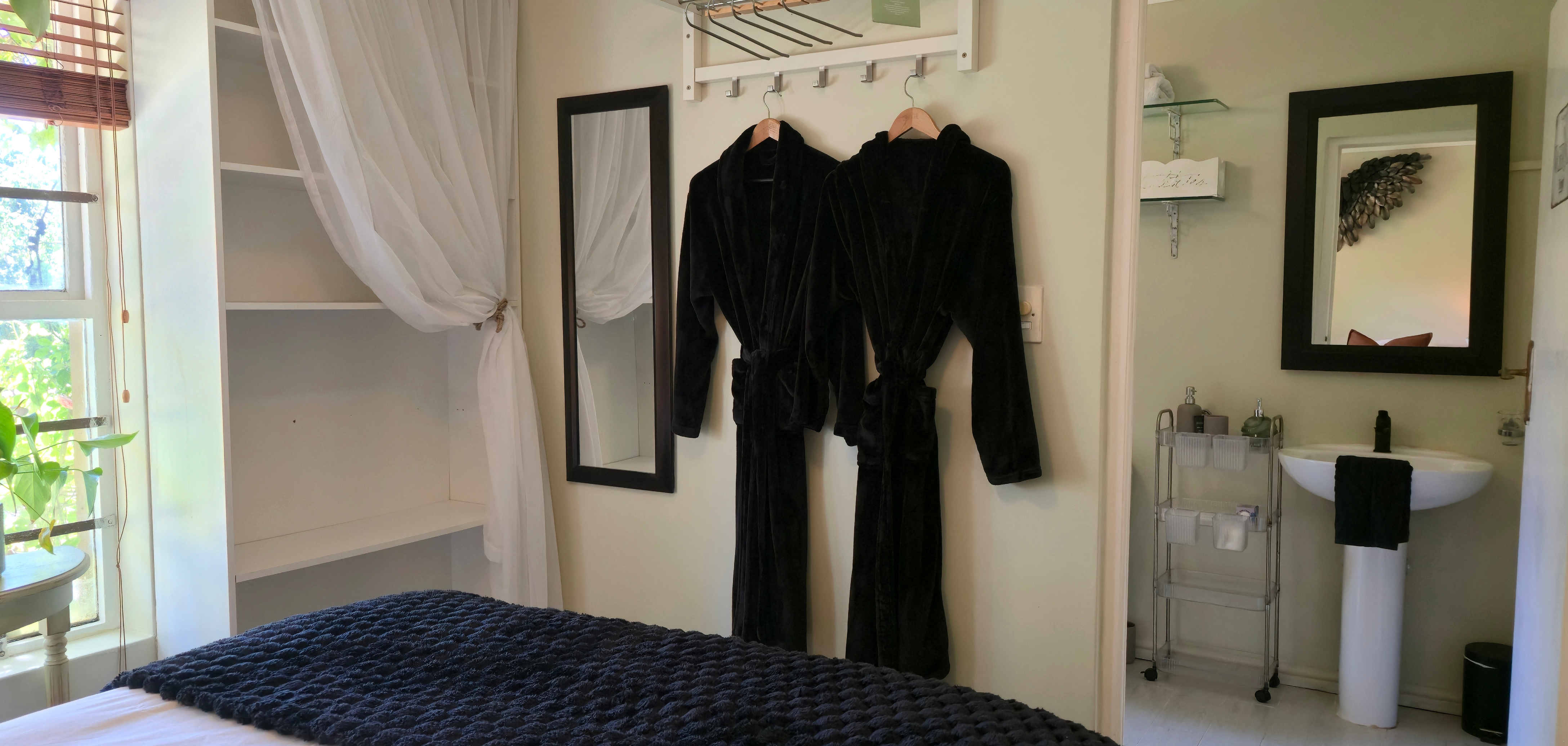 The cottage accommodates 2 guests and includes a bedroom and a bathroom. The main bedroom has a queen-size bed with an en-suite bathroom, which includes a shower, toilet, and basin. Quality linen, bath towels, and towels for the hot tub are provided.