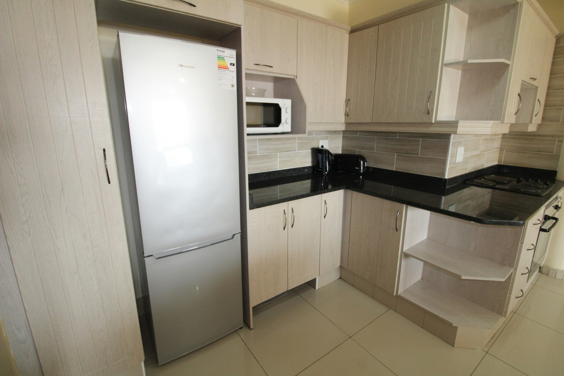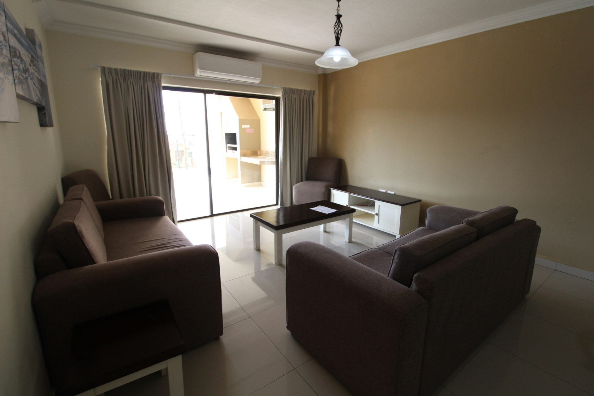 The kitchen is fully equipped for self-catering. The lounge area features pre-paid air-conditioning, and a TV with selected DStv channels. The lounge and main bedroom lead out to the large balcony with built-in braai facilities.
