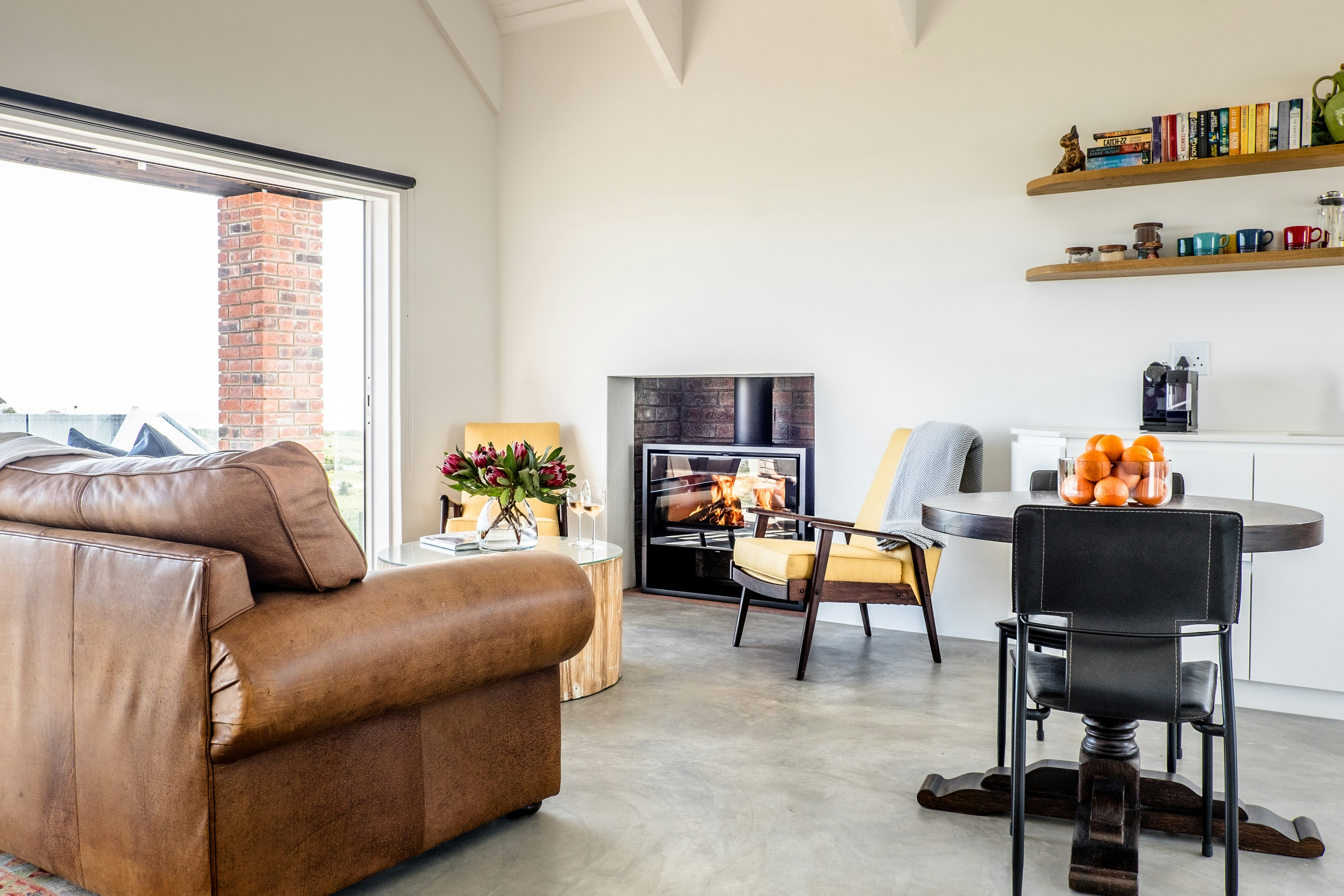The living area includes a small modern kitchen equipped with a fridge-freezer, gas stove, oven, microwave, cutlery and crockery, and tea- and coffee-making facilities, as well as a central 2-seater dining table. The lounge offers comfortable seating, a wood-burning fireplace, and access to the balcony through glass stacking doors. The balcony features braai facilities and comfortable outdoor furniture, where guests can enjoy sunsets over the ocean with a late-afternoon sundowner. Wi-Fi access is available throughout the property.