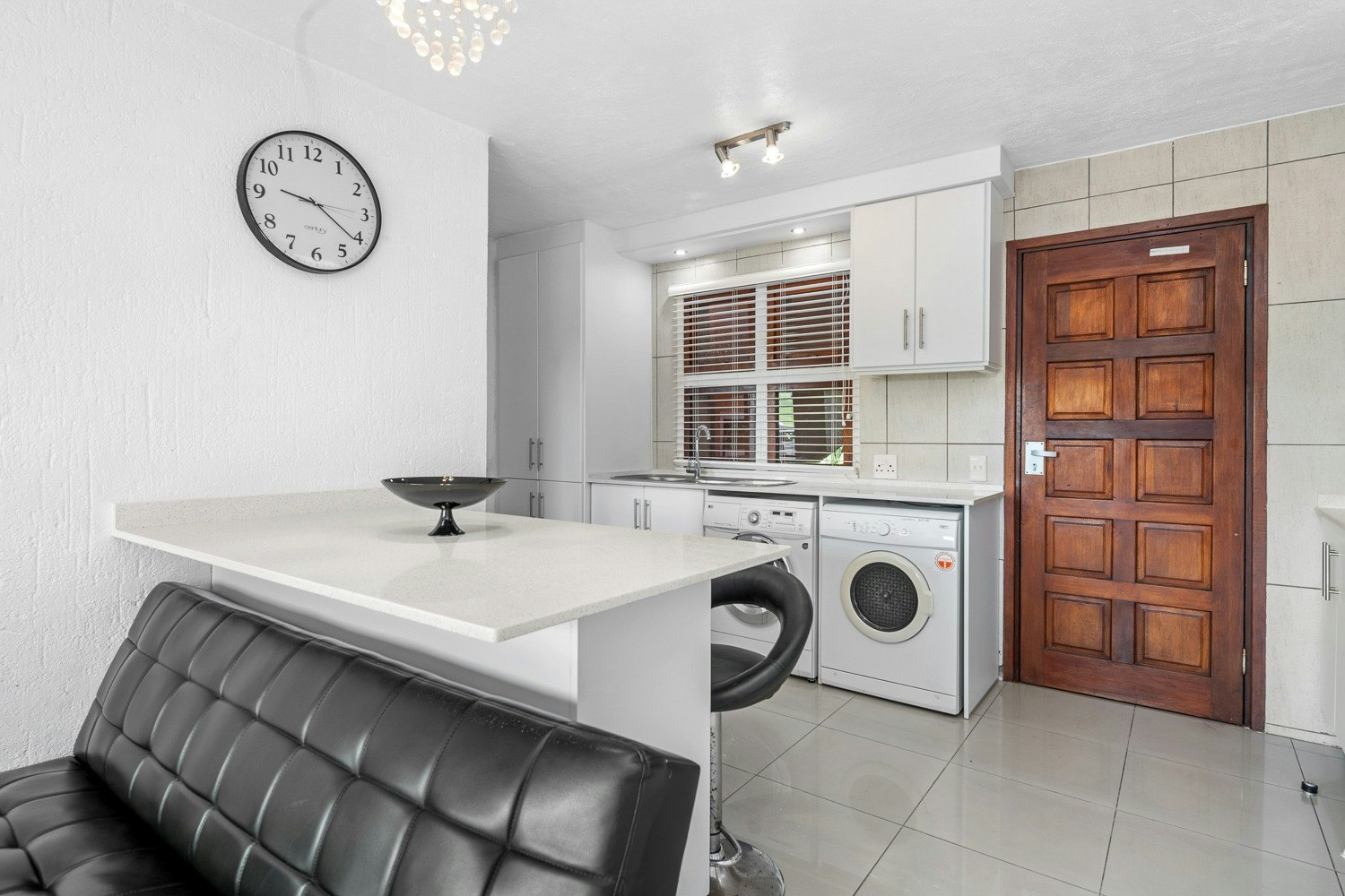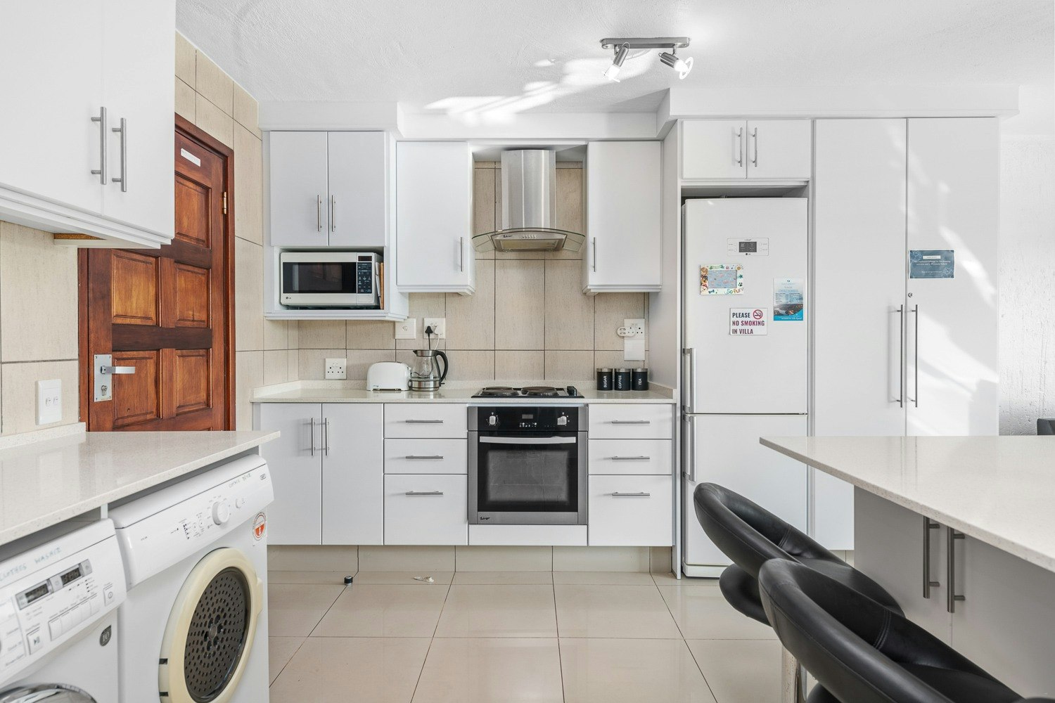 The open-plan living area features a kitchen fully equipped with a stove, oven, microwave, fridge-freezer, cutlery and crockery as well as a breakfast bar with stools. A washing machine and tumble dryer are available too. Leading from the kitchen is a lounge with comfortable seating and a TV with DStv.