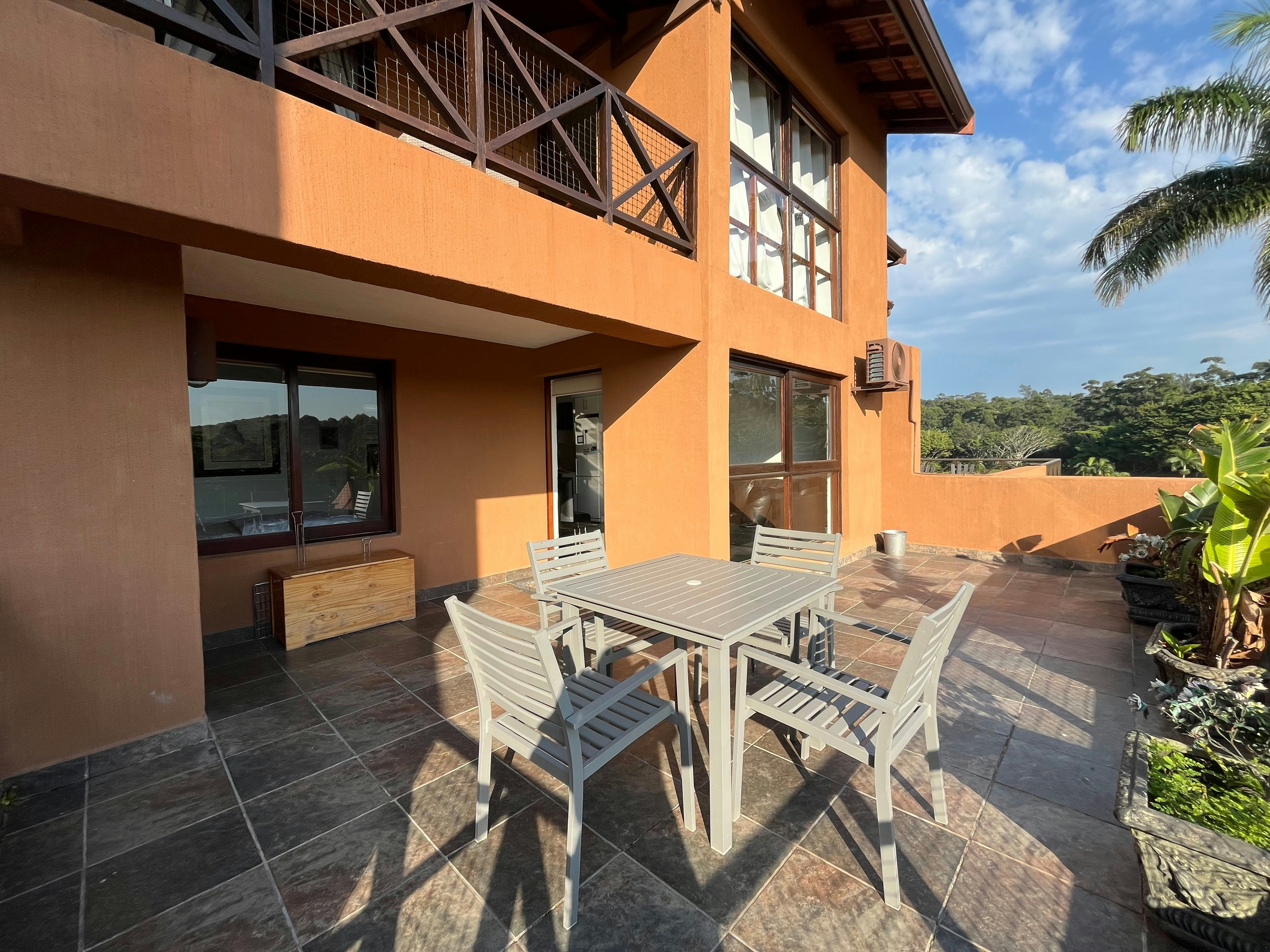 This living area opens onto a spacious patio with a table and chairs as well as a built-in braai which is the perfect spot for a sundowner in the evening while admiring the views over the estate.