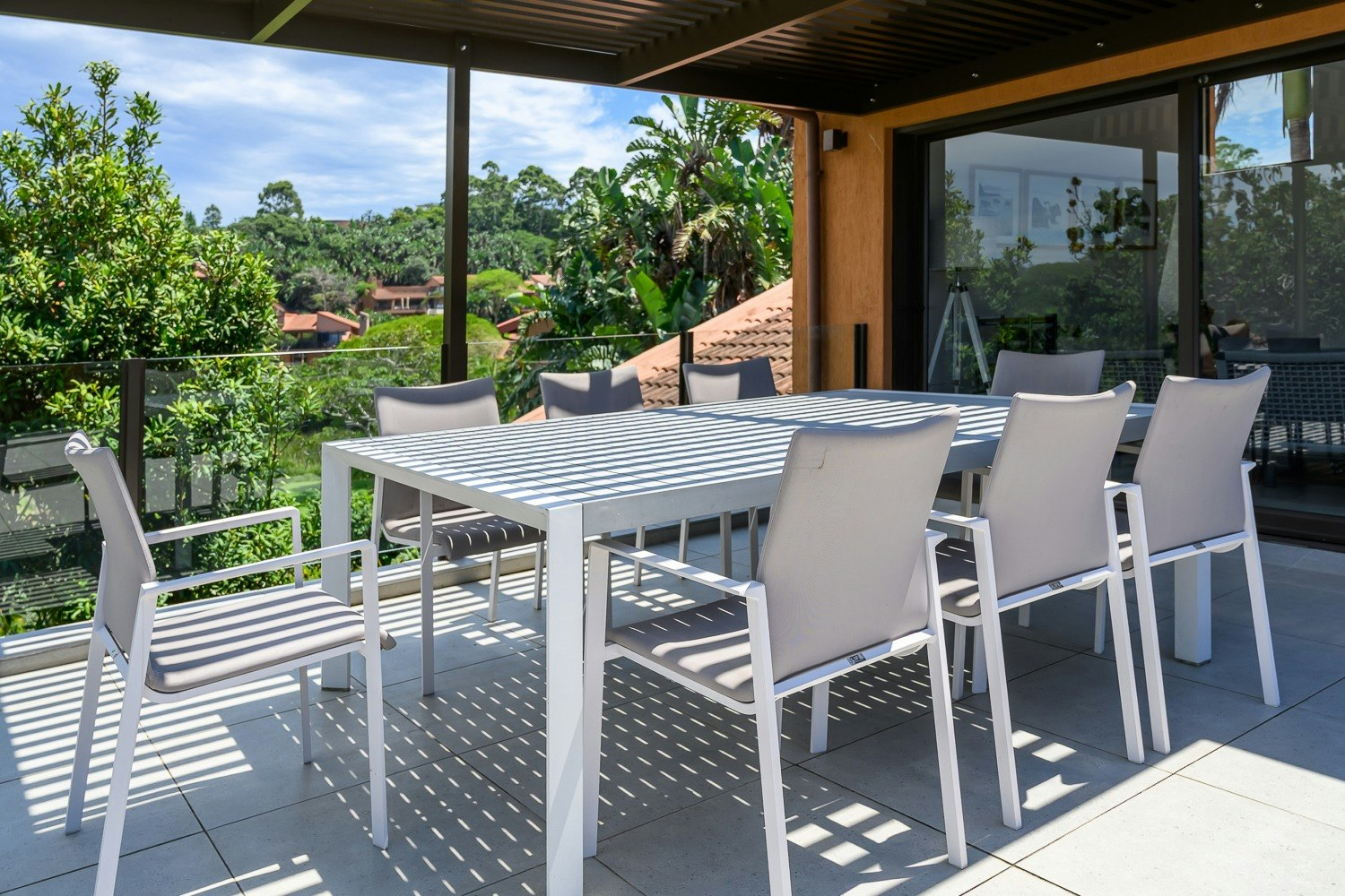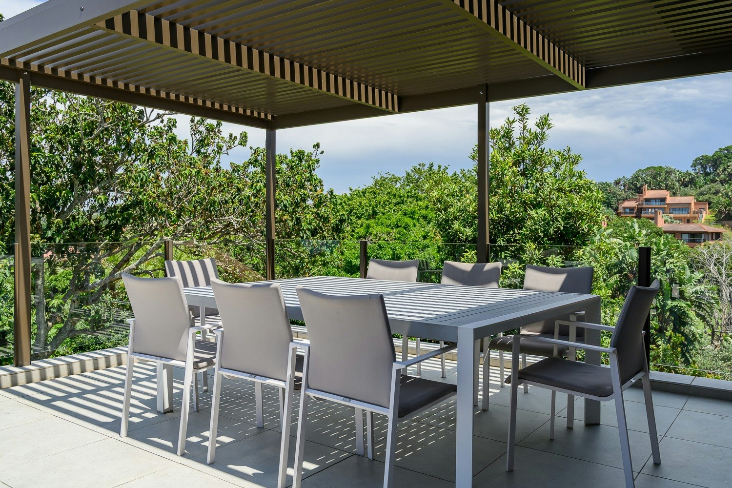 The open-plan living area features a kitchen fully equipped with a gas stove, electric oven, microwave, fridge-freezer, ice machine, cutlery and crockery as well as a coffee machine. A dishwasher, washing machine and tumble dryer are available too. Leading from the kitchen is a lounge and a dining table with ample seating for guests to enjoy their meals together. Downstairs is a TV lounge with comfy seating as well as a second dining space. For guests’ entertainment, free Wi-Fi and DStv are available as well as a pool table and a table tennis table are included in this vila.