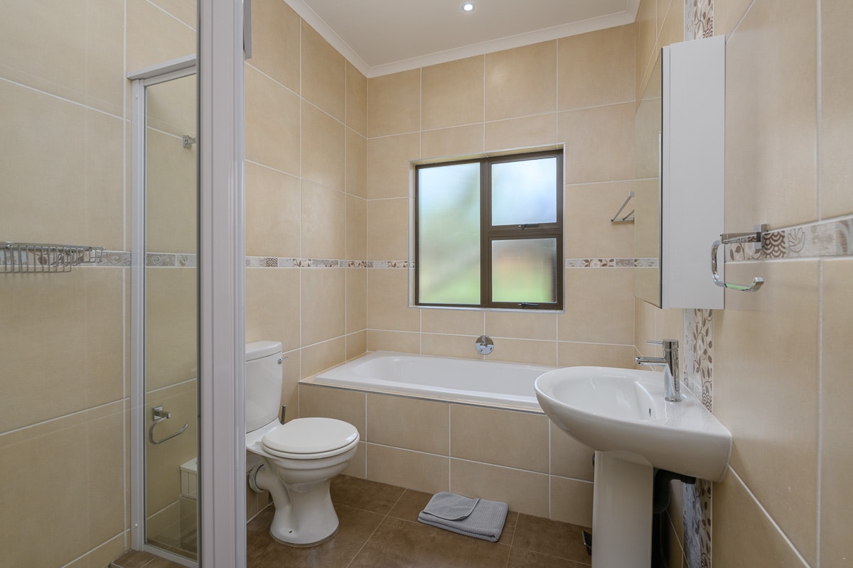 The open-plan kitchen is fully equipped for self-catering and contains a stove, an oven, a fridge-freezer, a microwave, cutlery and crockery, as well as tea- and coffee-making facilities. A dishwasher, a washing machine, and a tumble-dryer are also available for guests to use. The dining area has seating for 8 people, while the lounge has a comfy lounge suite and a TV with selected DStv channels. For additional convenience, there is an inverter for the lights and plugs.