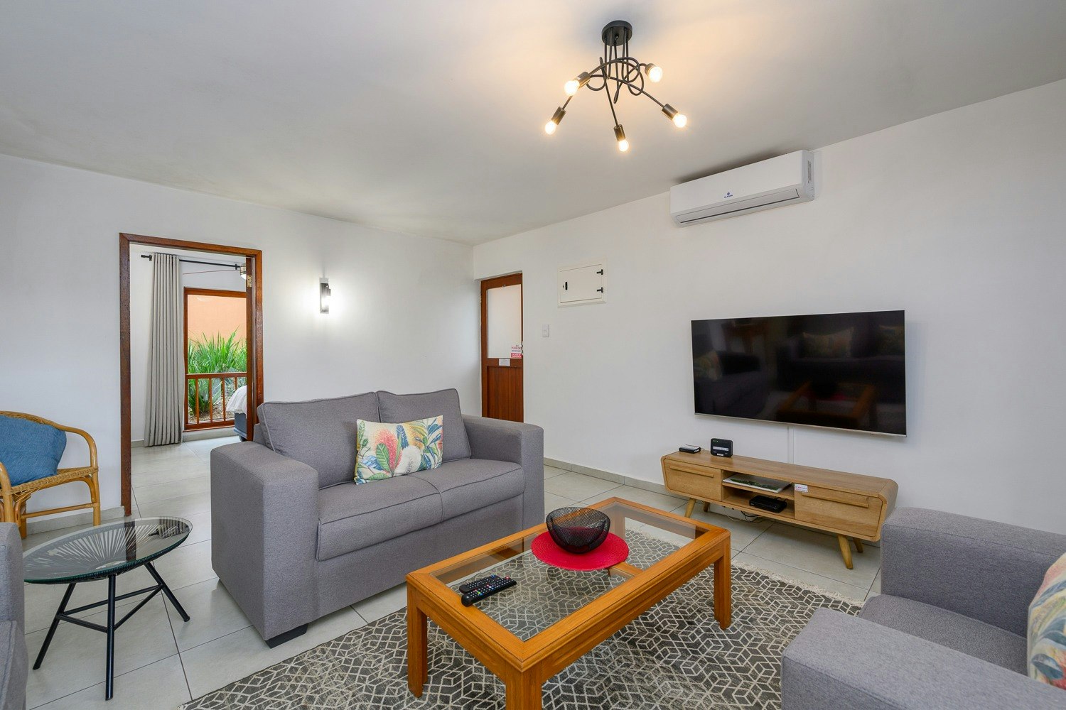 This villa can accommodate 4 guests and comprises 2 bedrooms and 2 bathrooms. The main bedroom is furnished with a king-size bed that can be converted into 2 single beds and the other bedroom is furnished with 2 single beds. Each bedroom has an en-suite bathroom fitted with a shower, toilet and washbasin. All linen and bath towels are provided, however, guests are required to bring their own swimming towels.