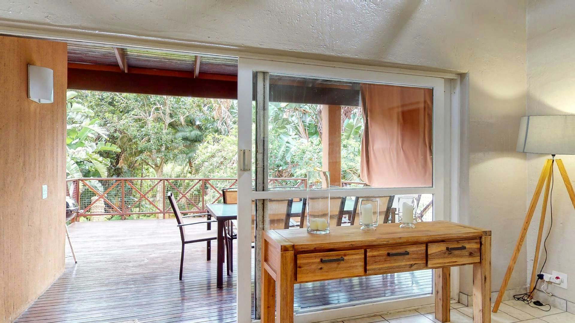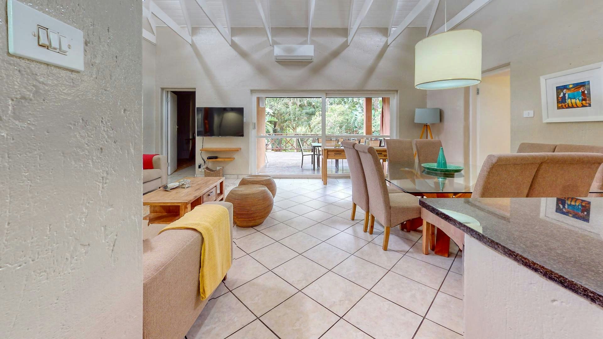 The kitchen is fully equipped with a fridge-freezer, stove, oven, microwave, dishwasher, washing machine, and tumble dryer. The spacious living area features a dining table, a comfy lounge suite, a TV with selected DStv channels, and an air-conditioner. It opens onto a wooden deck with braai facilities and a dining table overlooking the leafy estate. The Unit also has uncapped WIFI available to guests. The property has a JoJo tank, providing a reliable source of backup water supply.
