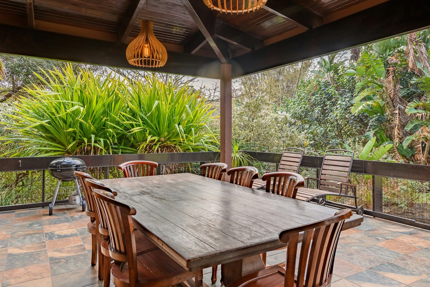 The living area opens onto the covered patio, which features an outdoor dining table with seating, portable kettle braai as well as built-in braai facilities for guests to use.