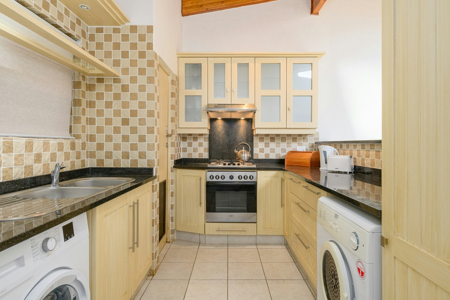 The kitchen is fully equipped for self-catering and contains a gas stove, oven, fridge-freezer, microwave, and cutlery and crockery. There is also a washing machine and a tumble-dryer provided. The dining area has seating space for 6 people, while the lounge has a comfy lounge suite and a flat-screen TV with selected DStv channels.